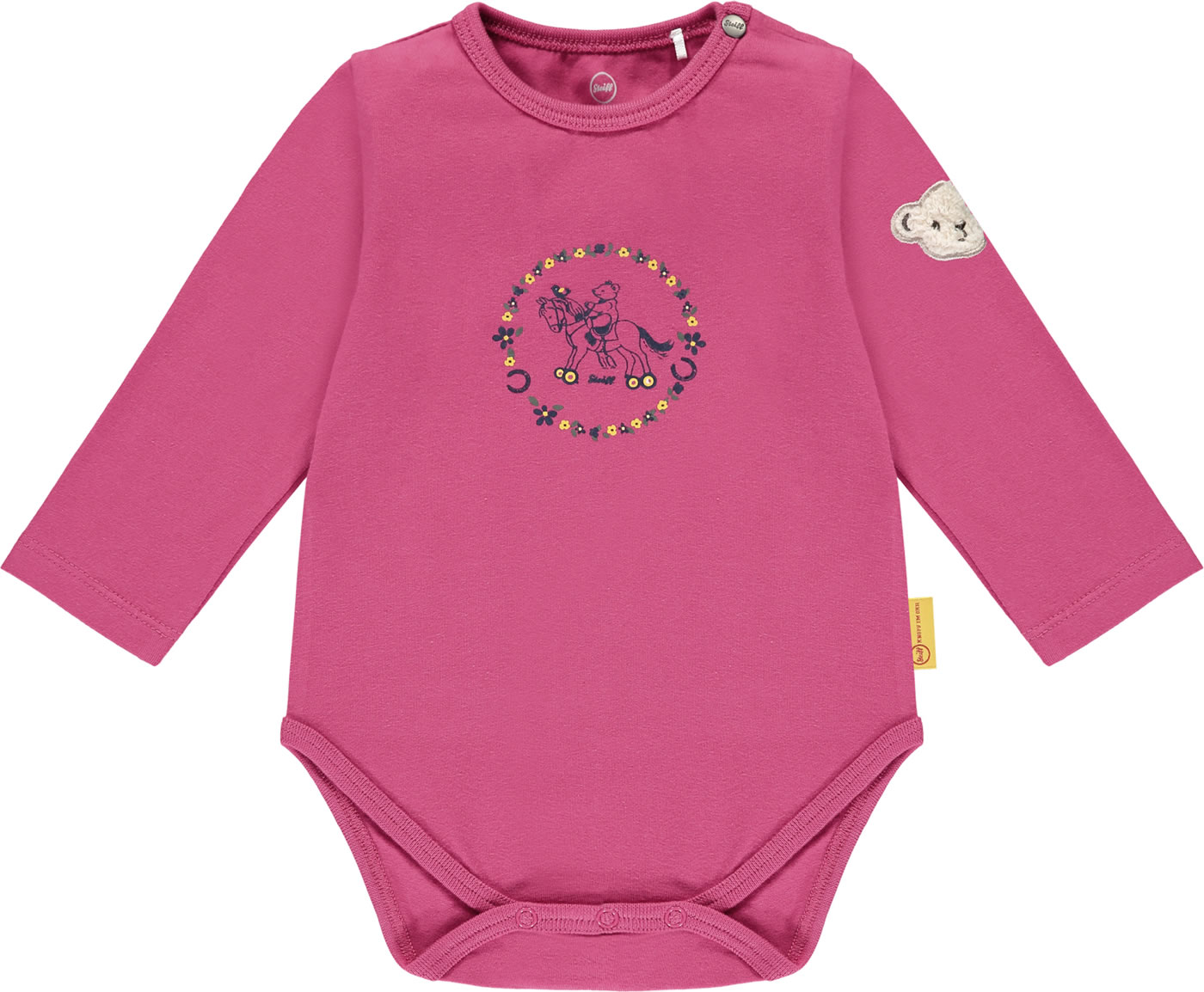 Single-colored body with long sleeves for girls from the STEIFF Ponyful collection. There is a great retro print on the chest. The STEIFF bear adorns the left sleeve. The press studs in the crotch and on the shoulder make it easy to put on and take off. The soft material offers a high level of comfort.