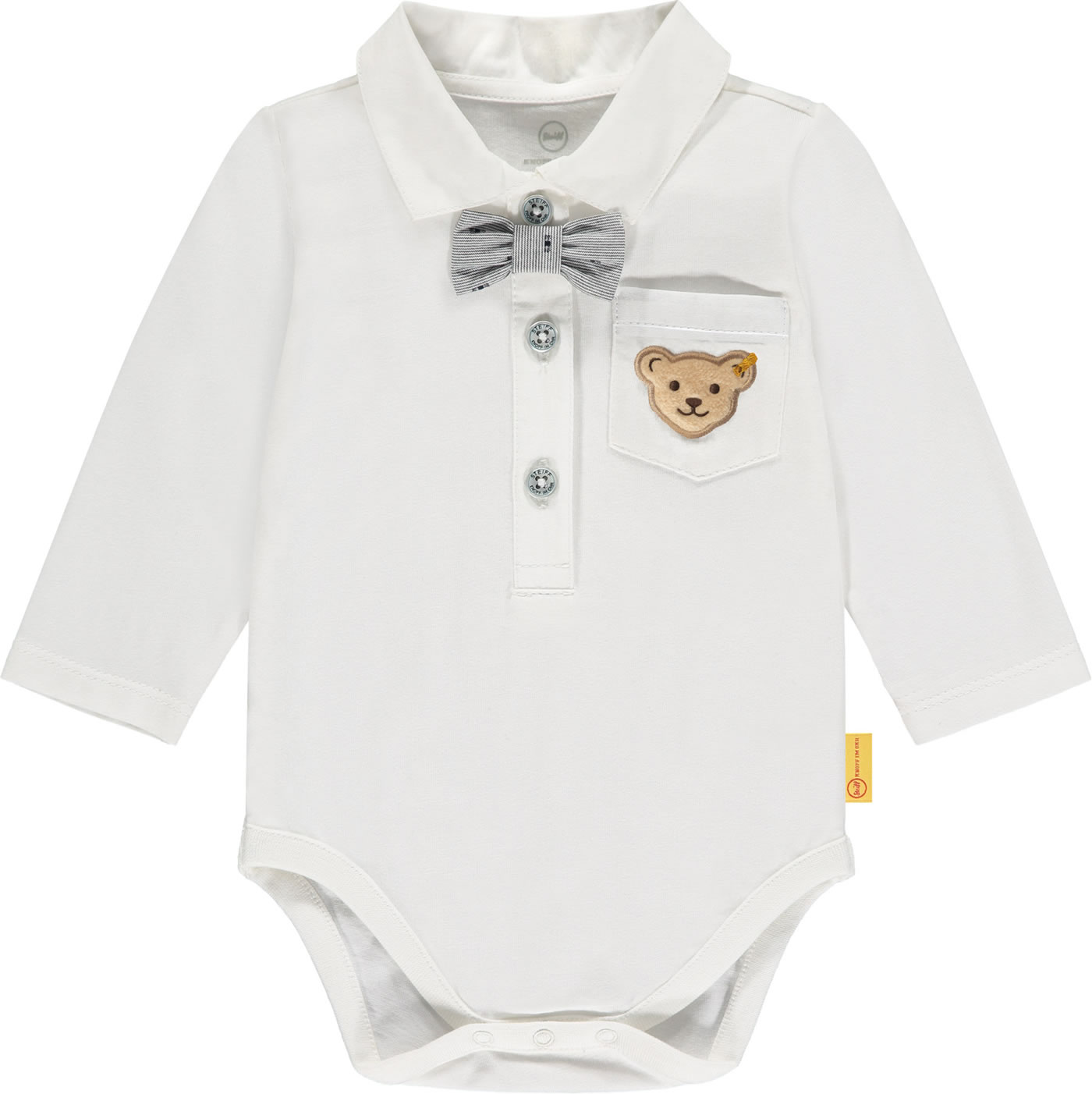 Festive baby body with long sleeves from the STEIFF Special Day collection for boys. The little STEIFF bear is on the breast pocket. Particularly nice details are the collar and the detachable bow tie. Press studs in the crotch make it easier to swaddle.