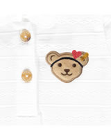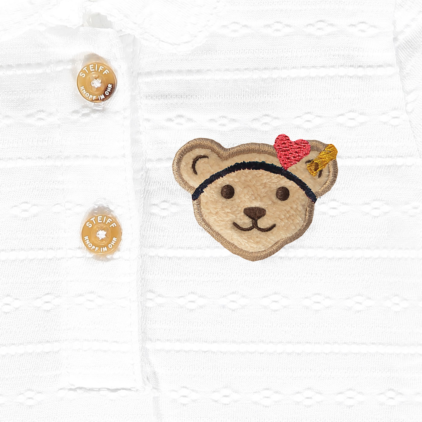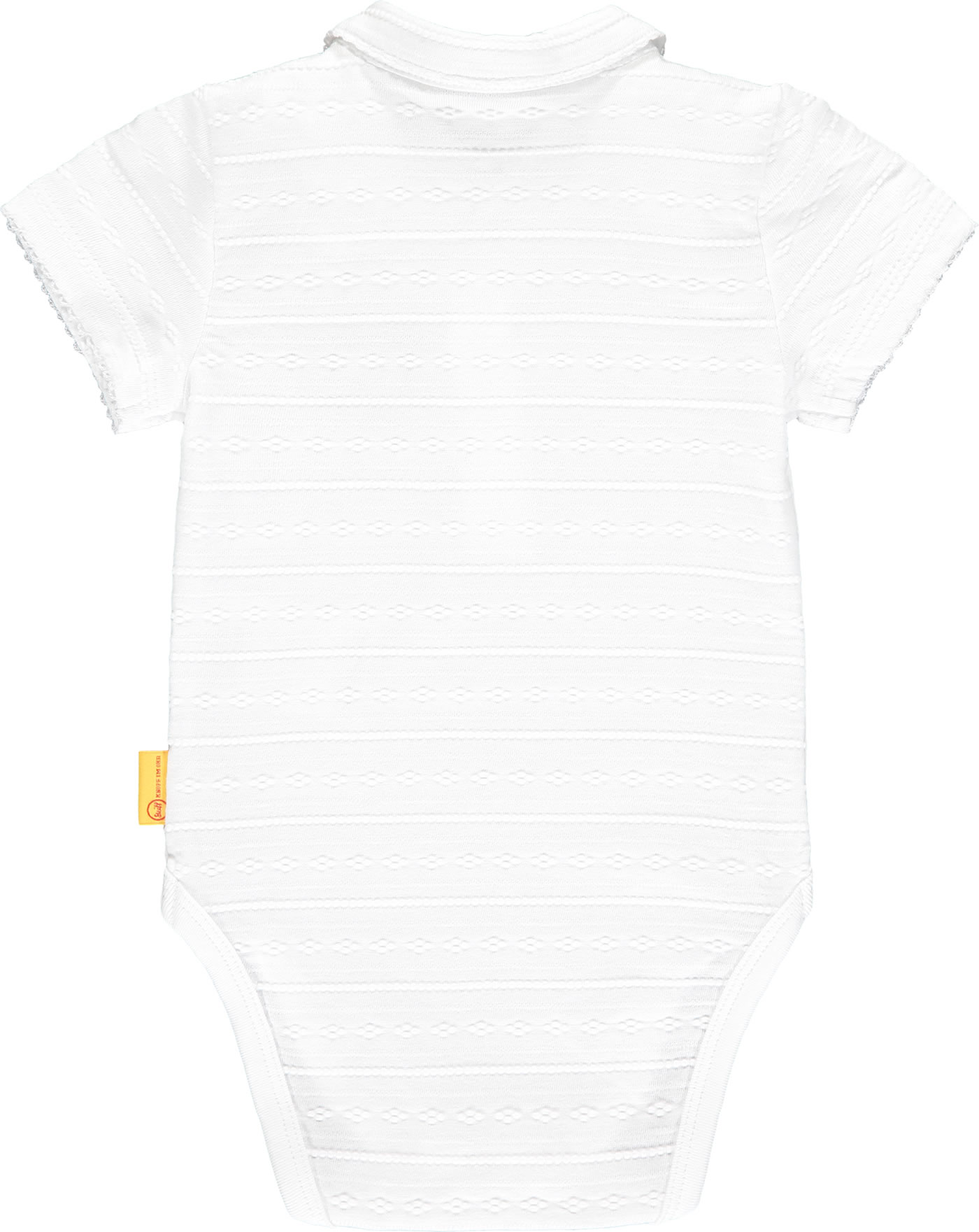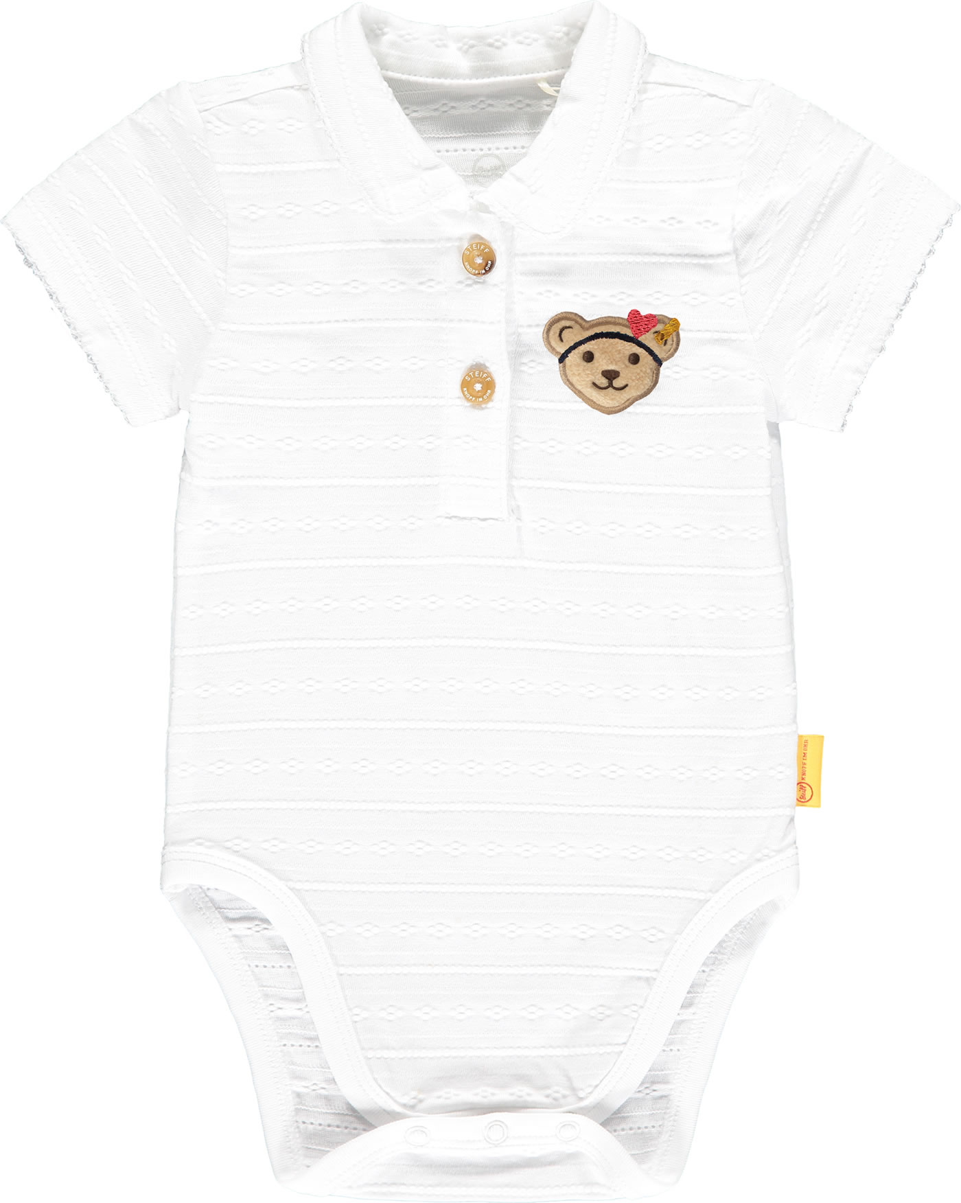 Body with short sleeves and collar for girls from the Marine Air collection by STEIFF. The STEIFF bear is on the chest. Nice details are the structure of the fabric and the mouse tooth edges on the collar and sleeves. Snap buttons in the crotch and buttons on the chest make it easy to put on and take off.