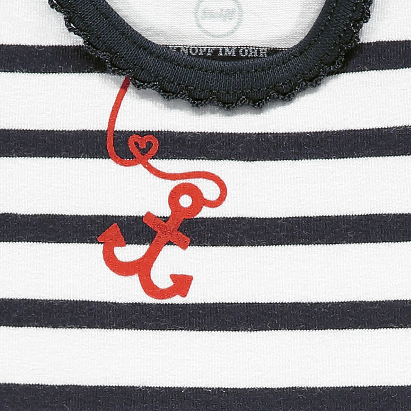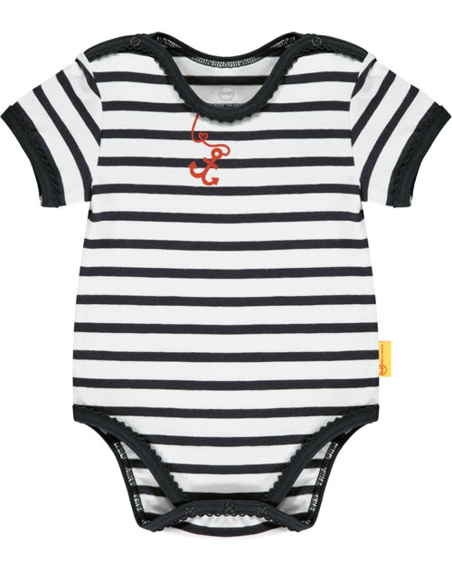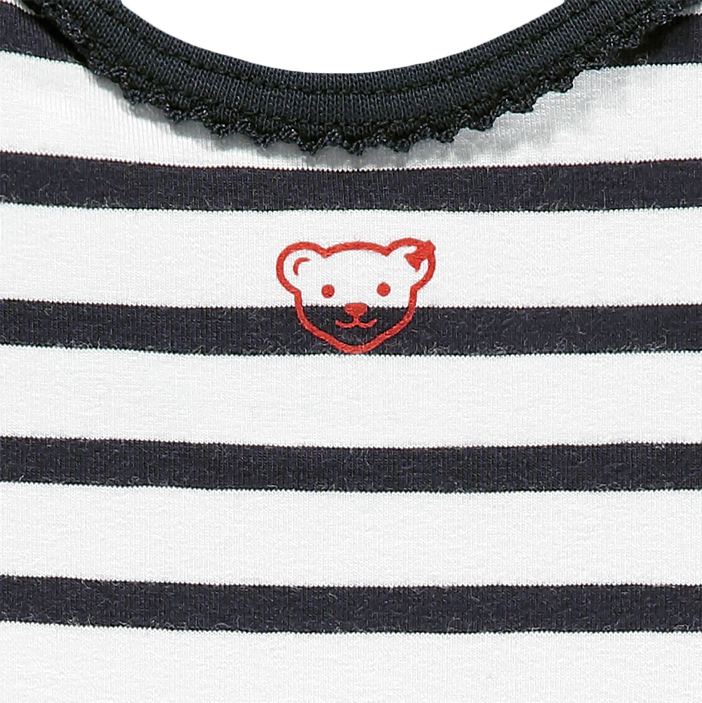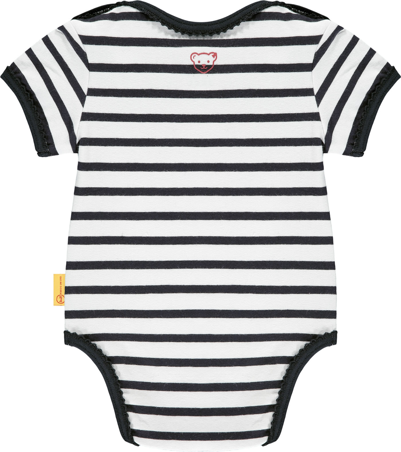 Body with short sleeves for girls from the Marine Air collection by STEIFF. The STEIFF bear is on the back and the mouse tooth edges are beautiful details. The press studs on the neckline and press studs in the crotch help with putting on and taking off. The soft material offers a high level of comfort.