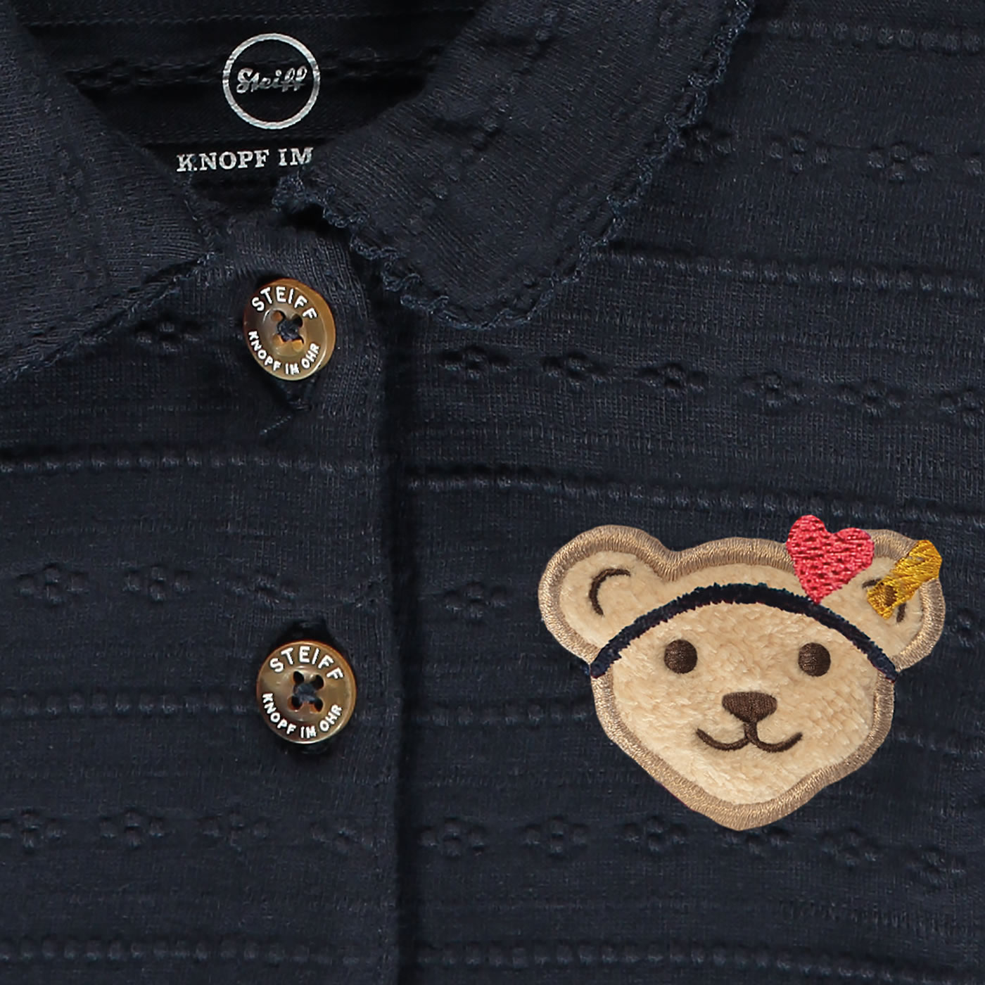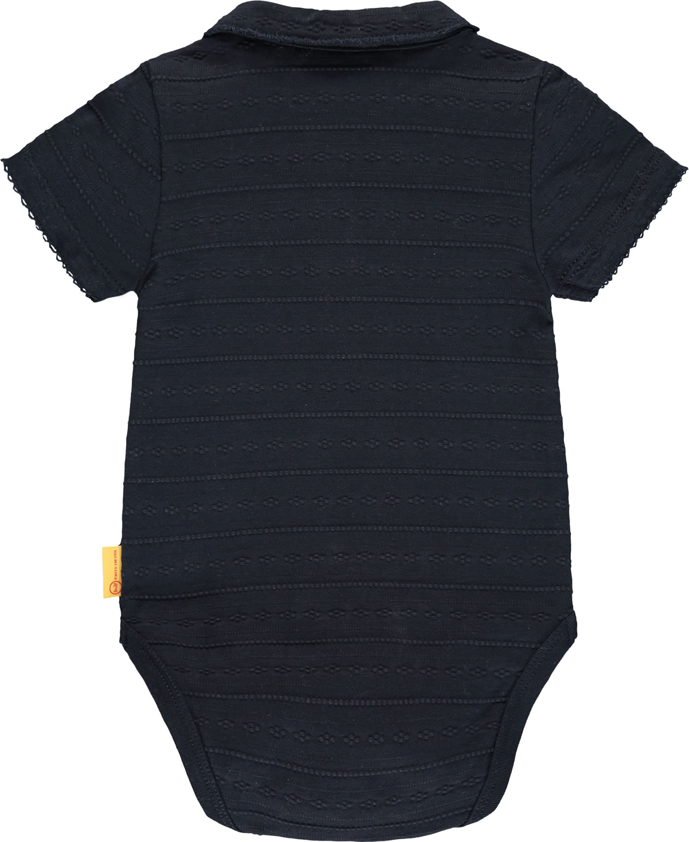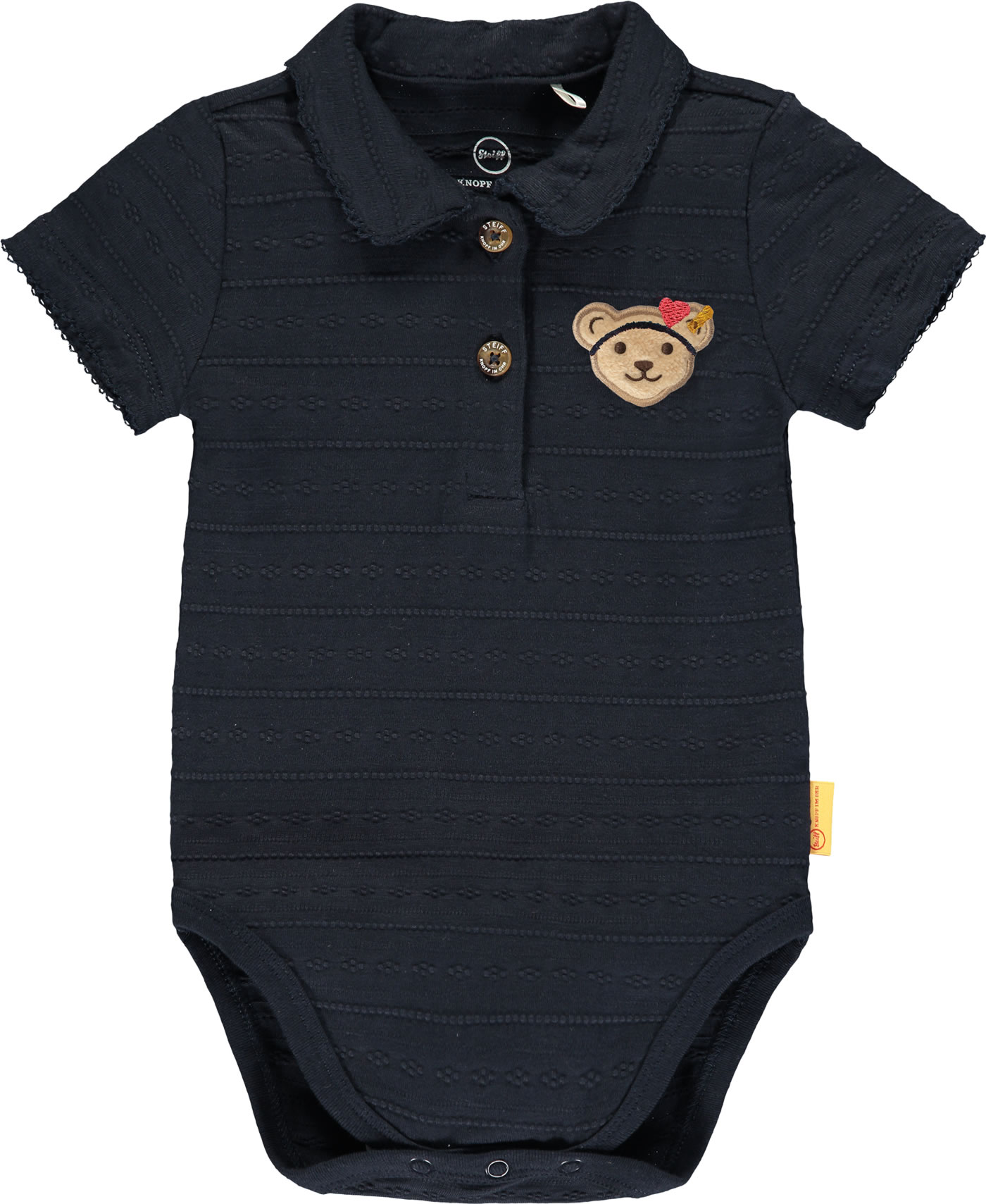 Body with short sleeves and collar for girls from the Marine Air collection by STEIFF. The STEIFF bear is on the chest. Nice details are the structure of the fabric and the mouse tooth edges on the collar and sleeves. Snap buttons in the crotch and buttons on the chest make it easy to put on and take off.