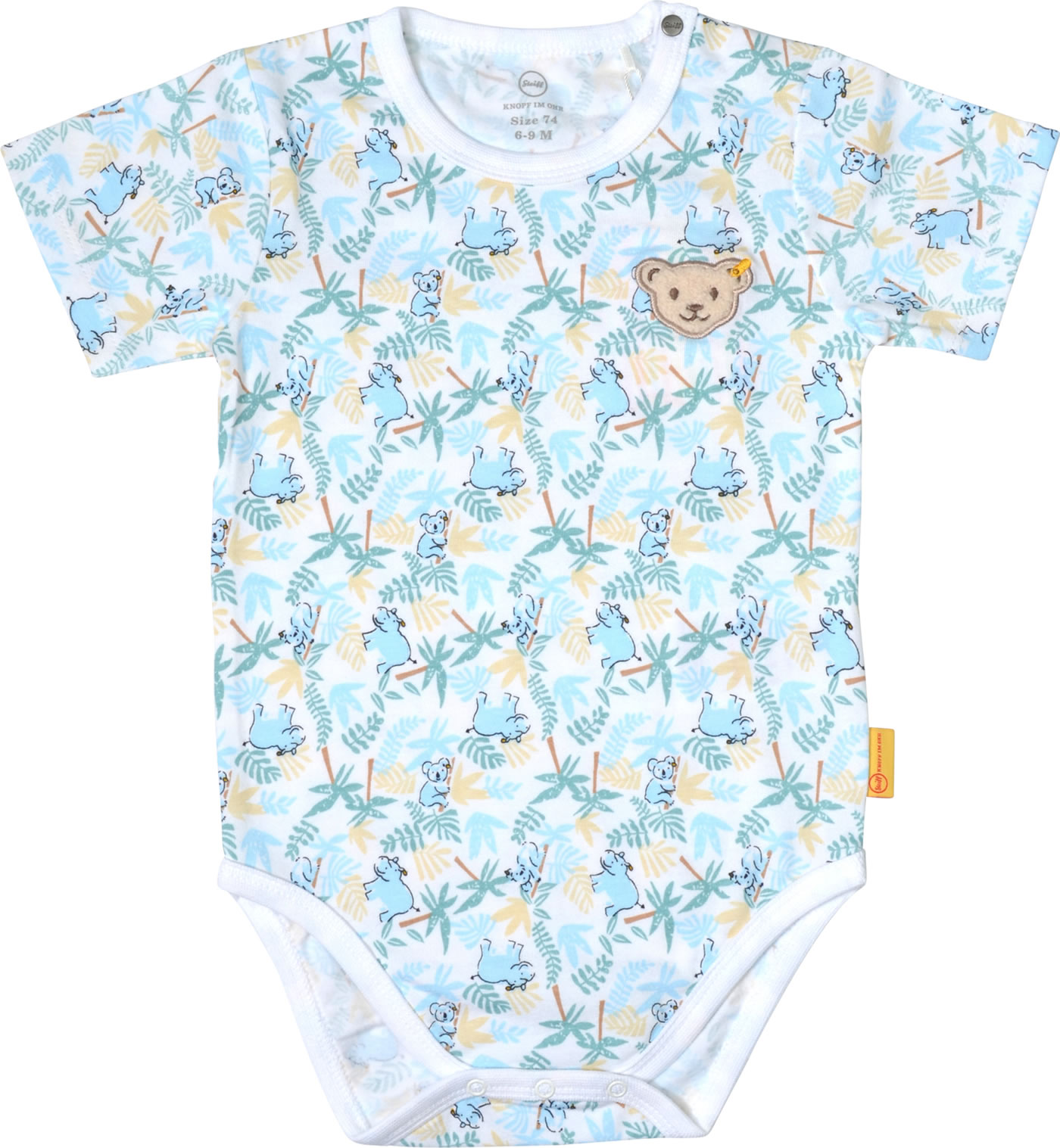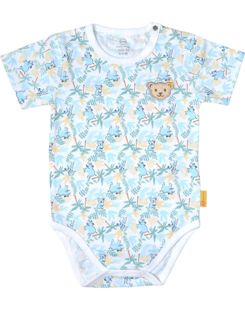 Jersey body with short sleeves for boys from the Lazy Nils collection by STEIFF. With the little STEIFF bear on the chest. The delicate jungle pattern with koalas and hippos is a pretty detail. Snaps at the crotch and on the shoulder make dressing and changing easier. The soft material offers a high wearing comfort.
