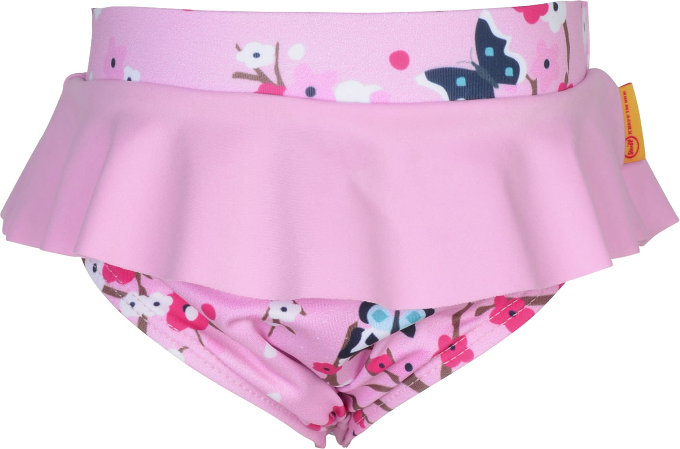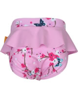 Swim nappies by STEIFF for girls. The pretty ruffled edge makes it a great eye-catcher. The pattern of butterflies and flowers and the STEIFF logo on the side are particularly pretty.