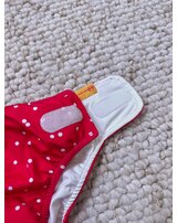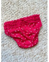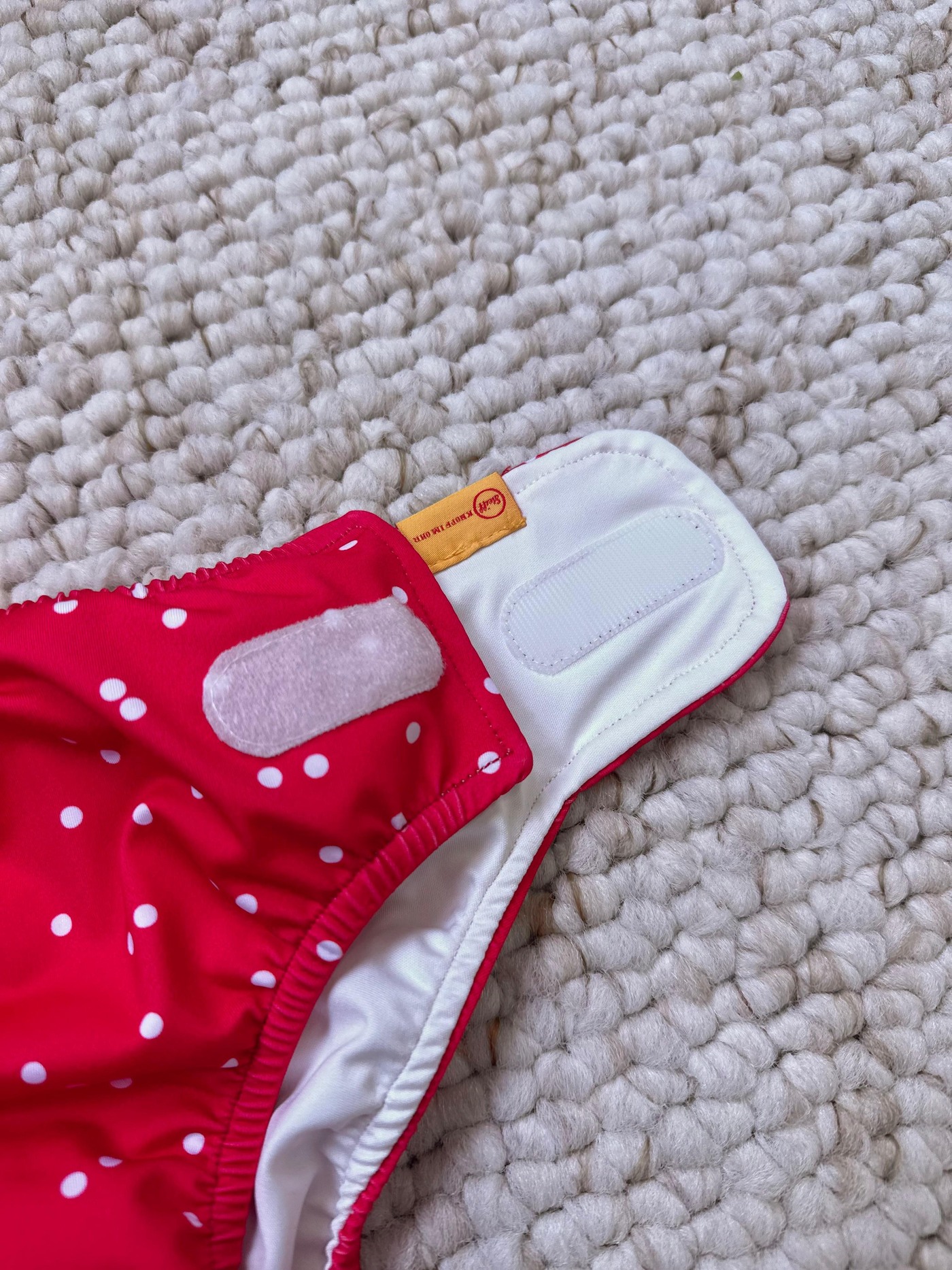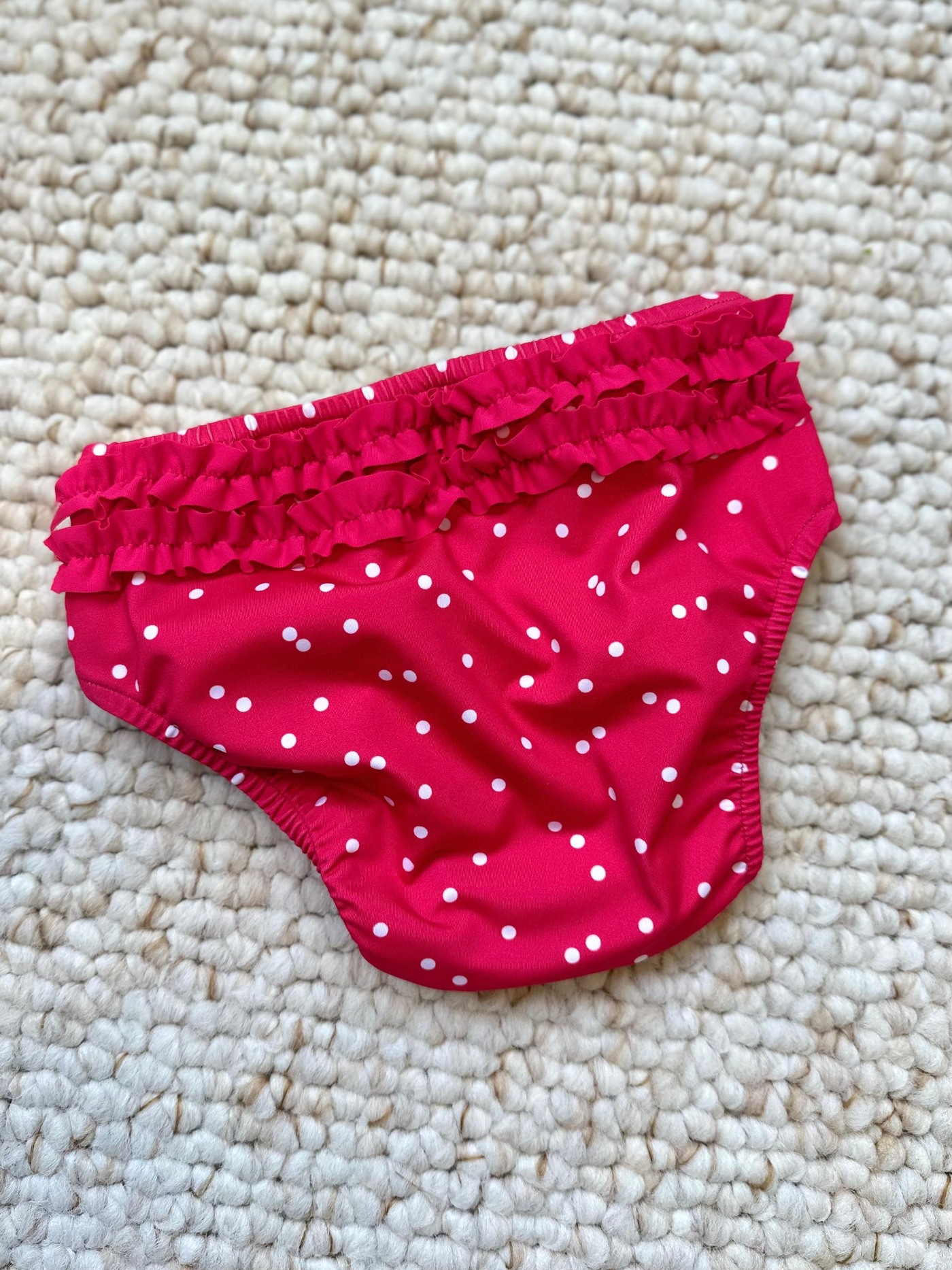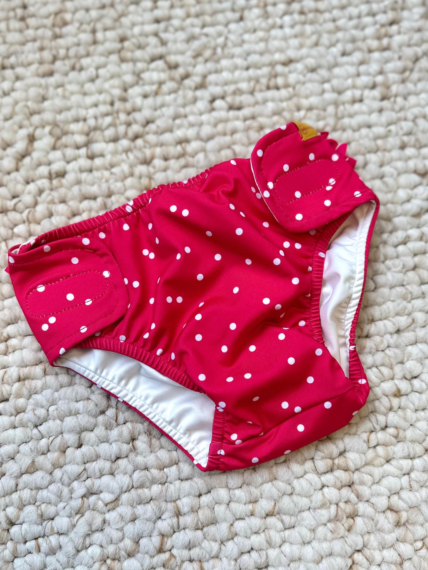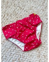 Swim nappies by STEIFF for girls. The pattern with white dots and the ruffled edge on the back are particularly pretty. The side Velcro fasteners are practical for putting on and taking off.