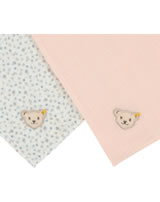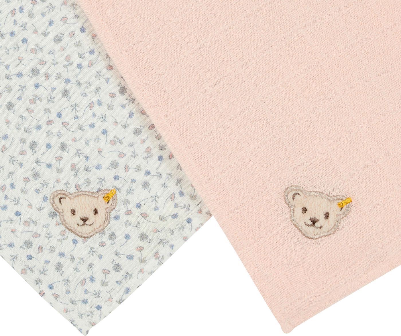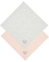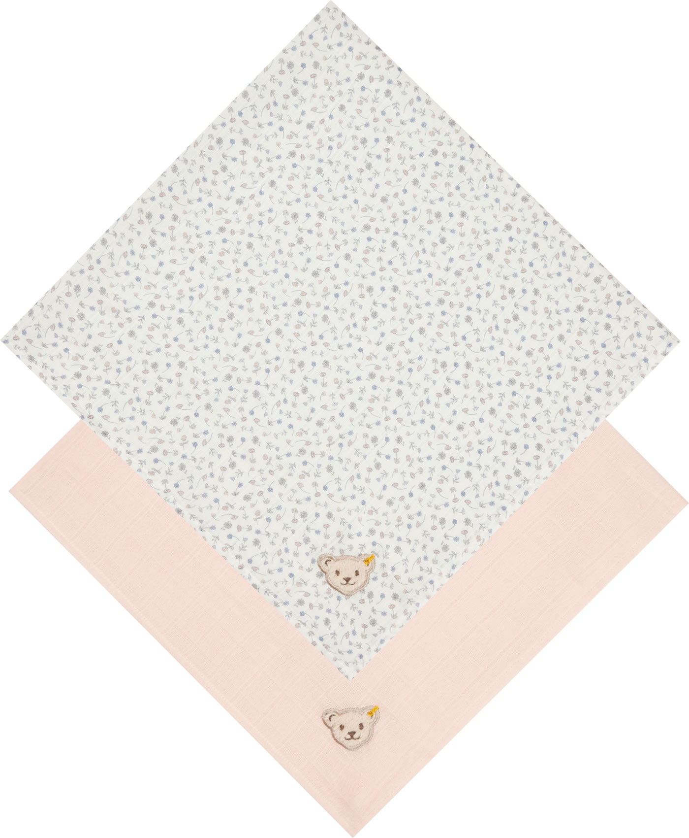 These 2 towels make a nice birth gift. The scarves in plain color and with pretty scattered flowers are decorated with the STEIFF bear. They are ideal as burp cloths, cuddle cloths or as muslin diapers.