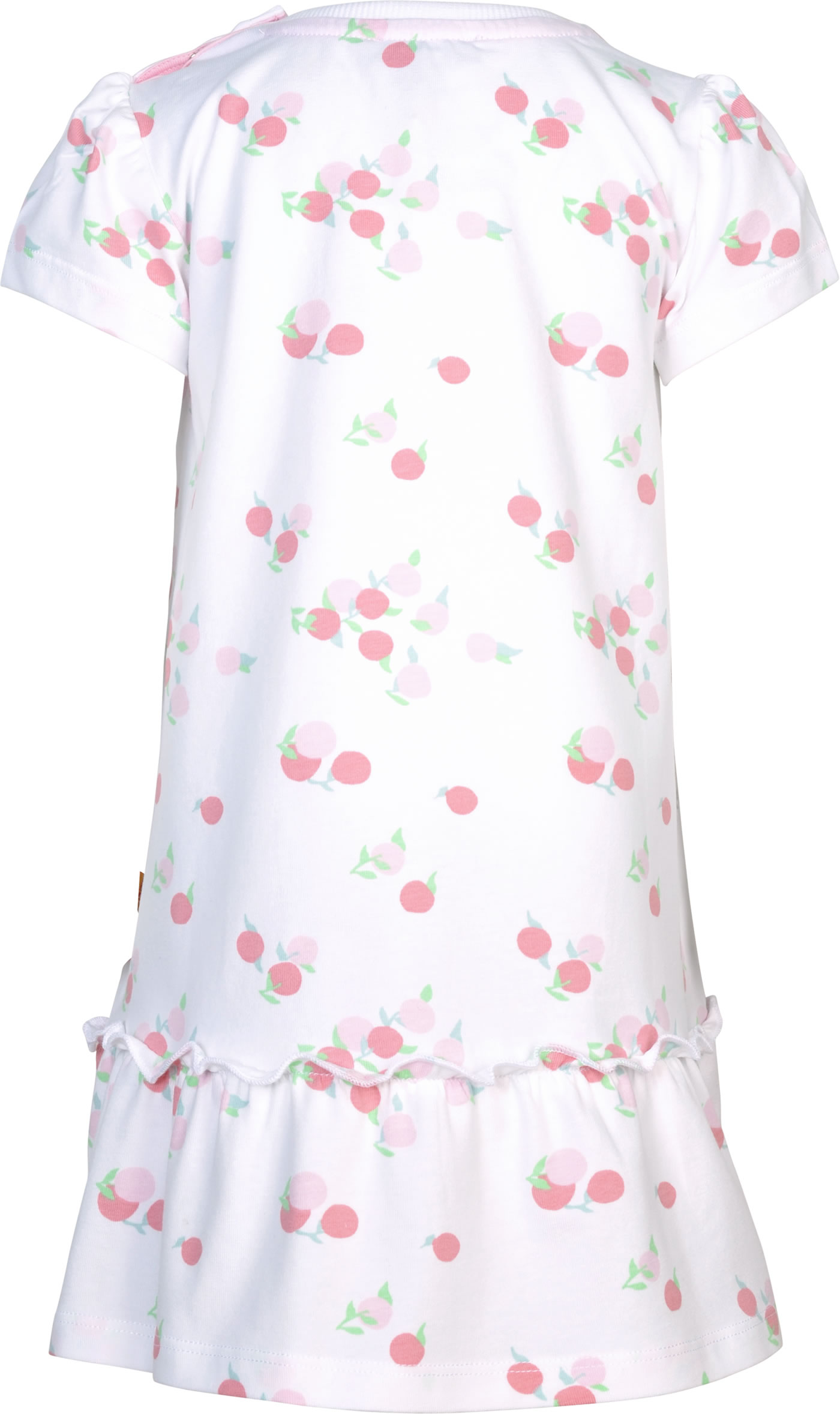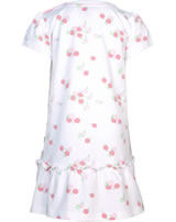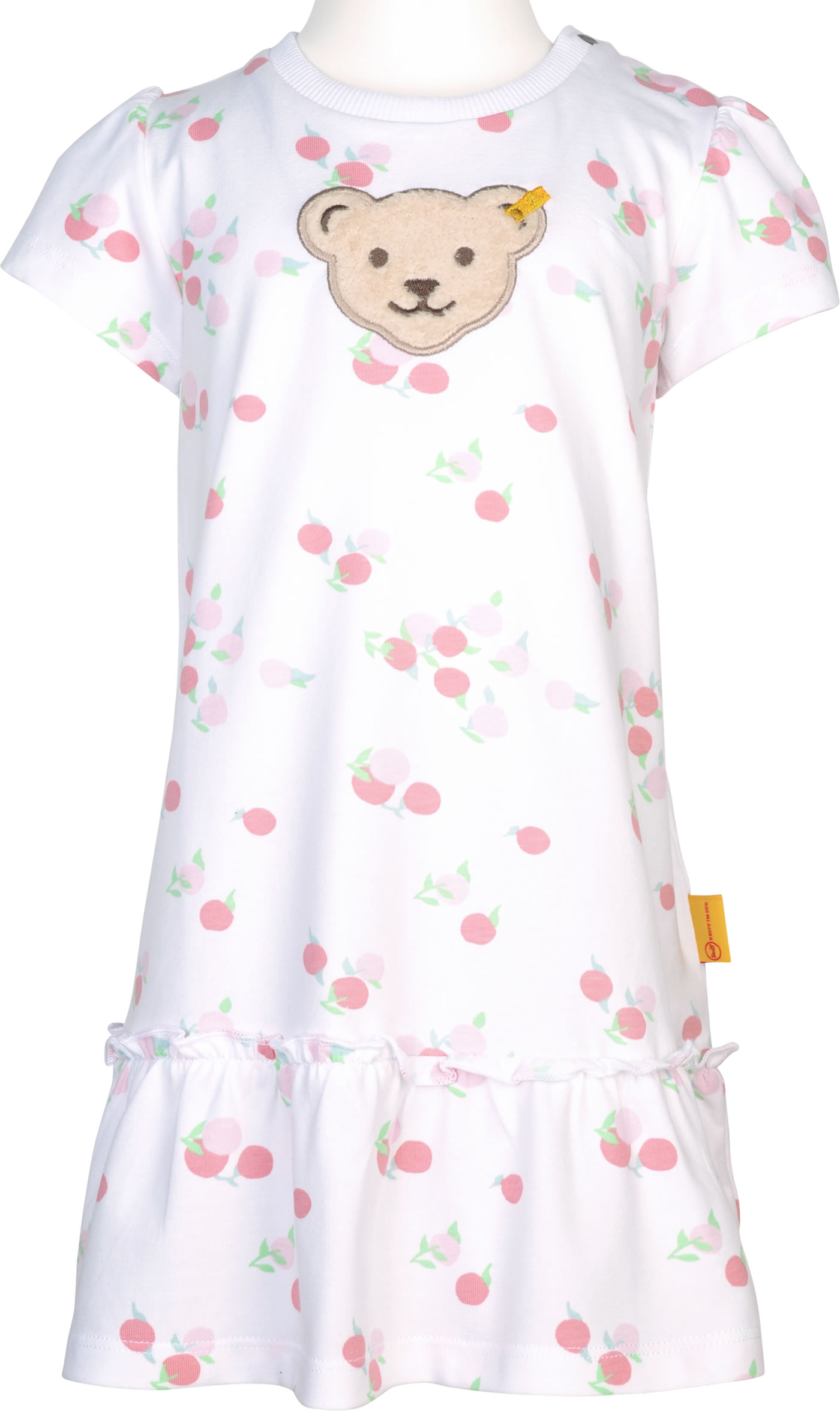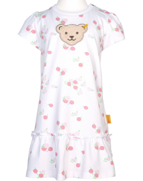 Short-sleeved dress by STEIFF from the Garden Party collection. The wide-cut dress is made of cotton jersey and is ideal for hot days. The ruffled flounce, the delicate print with cherries and the STEIFF bear that adorns the front are particularly beautiful.