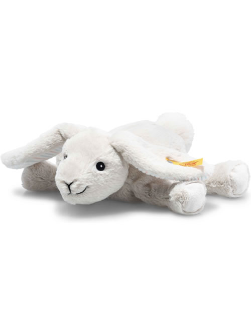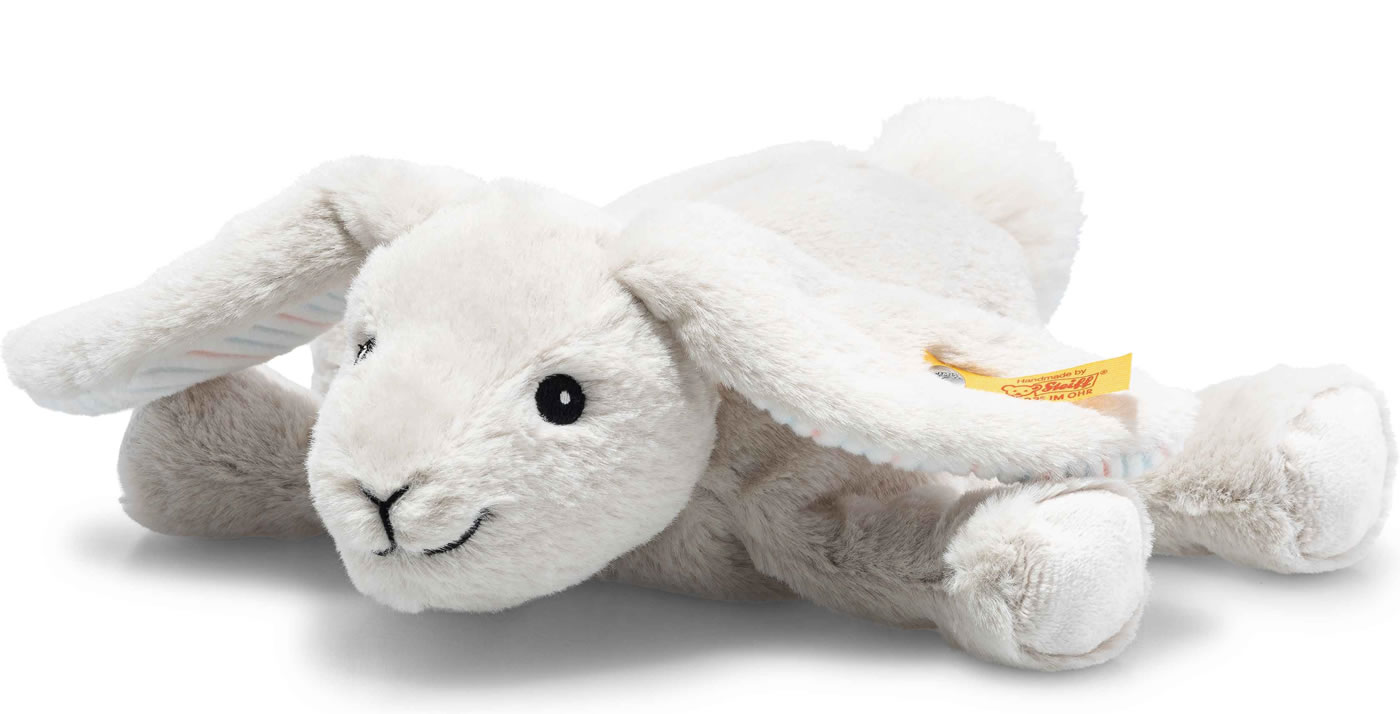 Steiff's little Floppy Hoppel rabbit is a cute friend for boys and girls. The rabbit measures 20 cm tall and his coat is made of cuddly soft plush. Hoppel loves cuddles in bed and is always up for a fun time. Little bean bags in his tummy promise a wonderful sensory experience and the soothing rustle of the beans has a calming effect for childrens.