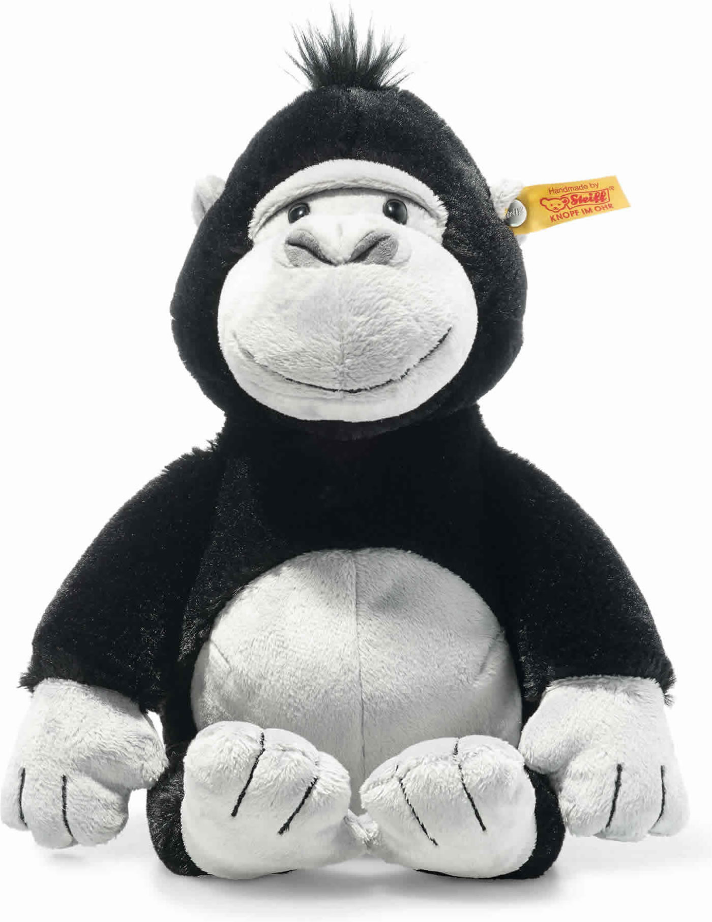 Bongy gorilla is 30 cm tall and made of black and light grey cuddly plush fabric. Its cute mop of hair and the black stitched mouth emphasise its mischievous appearance. Its tummy, hands and feet are in grey and contrast perfectly with its otherwise long black plush fur. Its hands and toes are created by black stitching. Bean bags sewn into its bottom, hands and feet make sure that Bongy moves and sits perfectly.