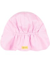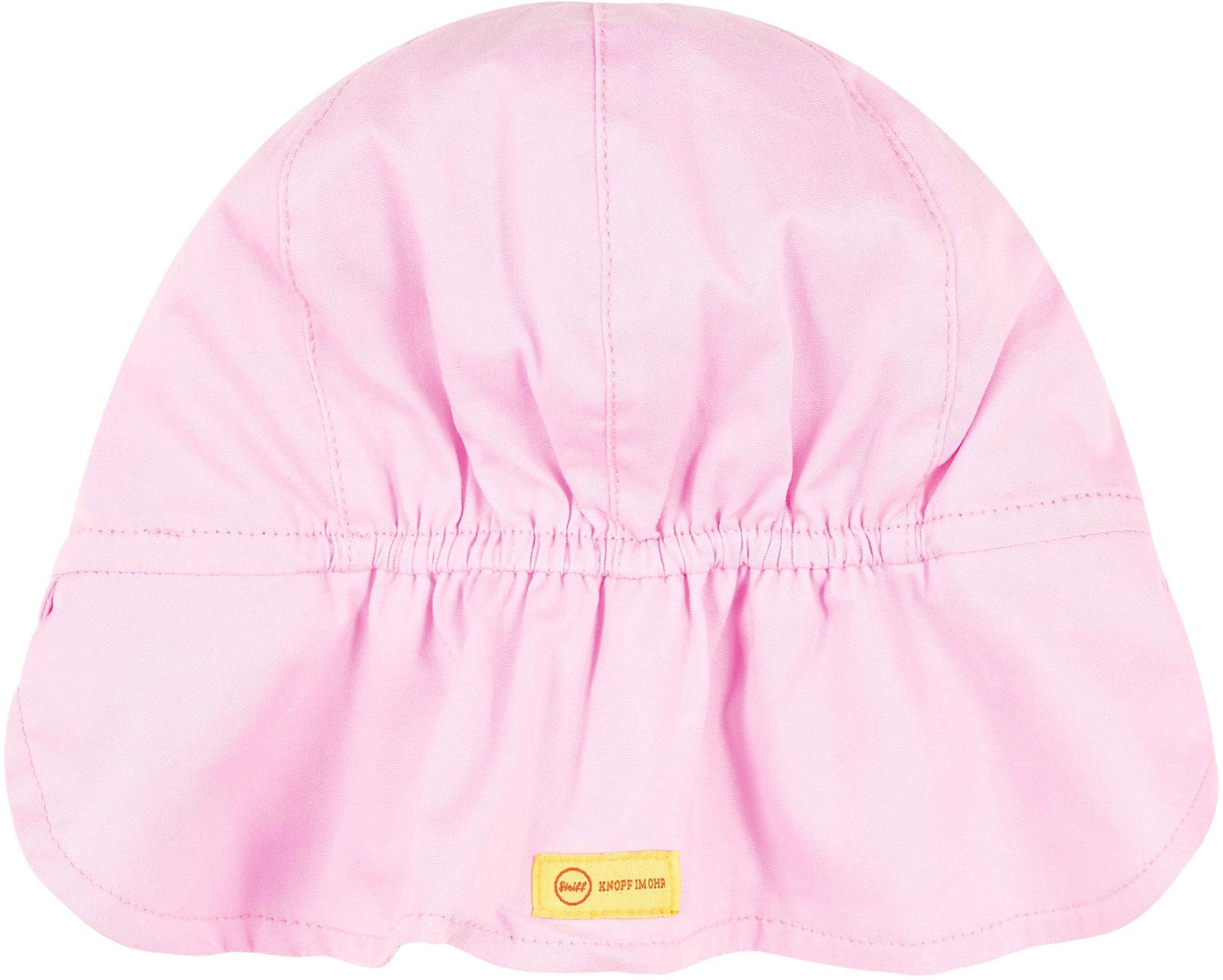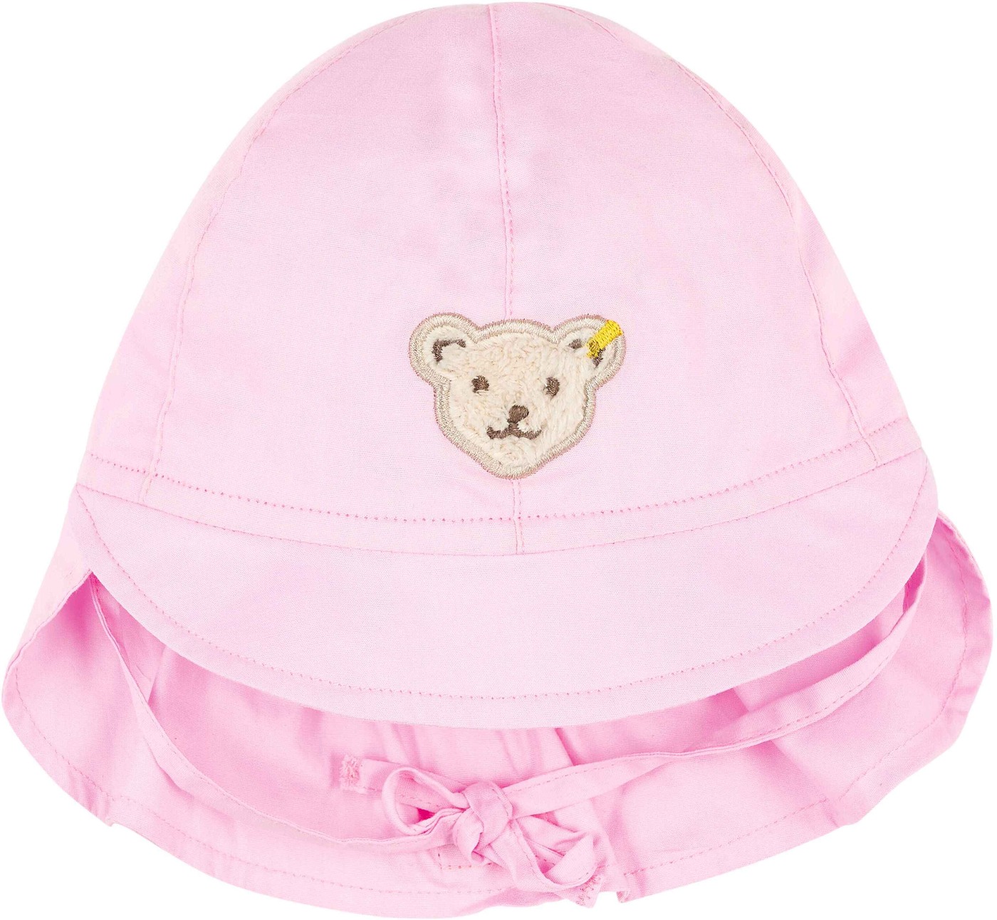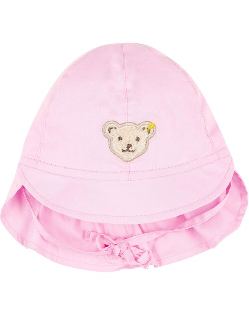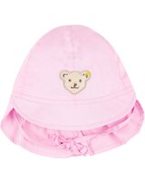 Sun hat made of lightweight cotton material from STEIFF from the Classic collection for girls. The small STEIFF bear adorns the front. The hat is double layered. Umbrella and neck protection provide protection from the sun. An elastic band at the neck ensures a perfect fit.
