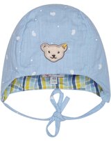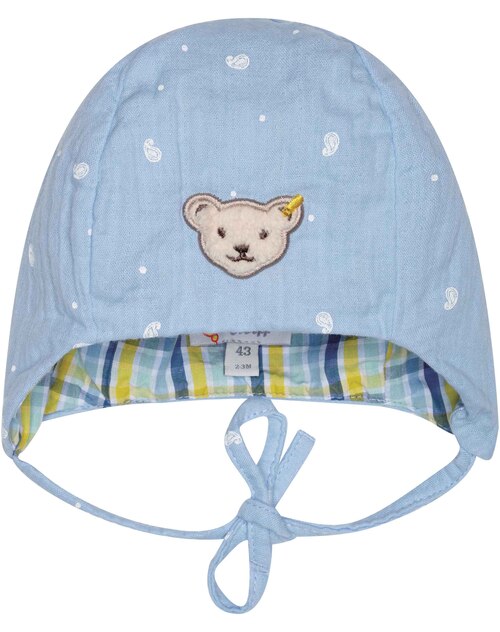 Double-layer hat made of seersucker material by STEIFF from the Elephant Ride collection for boys. The small STEIFF bear adorns the front and the lining is colorfully checked. The soft material offers a high level of comfort.