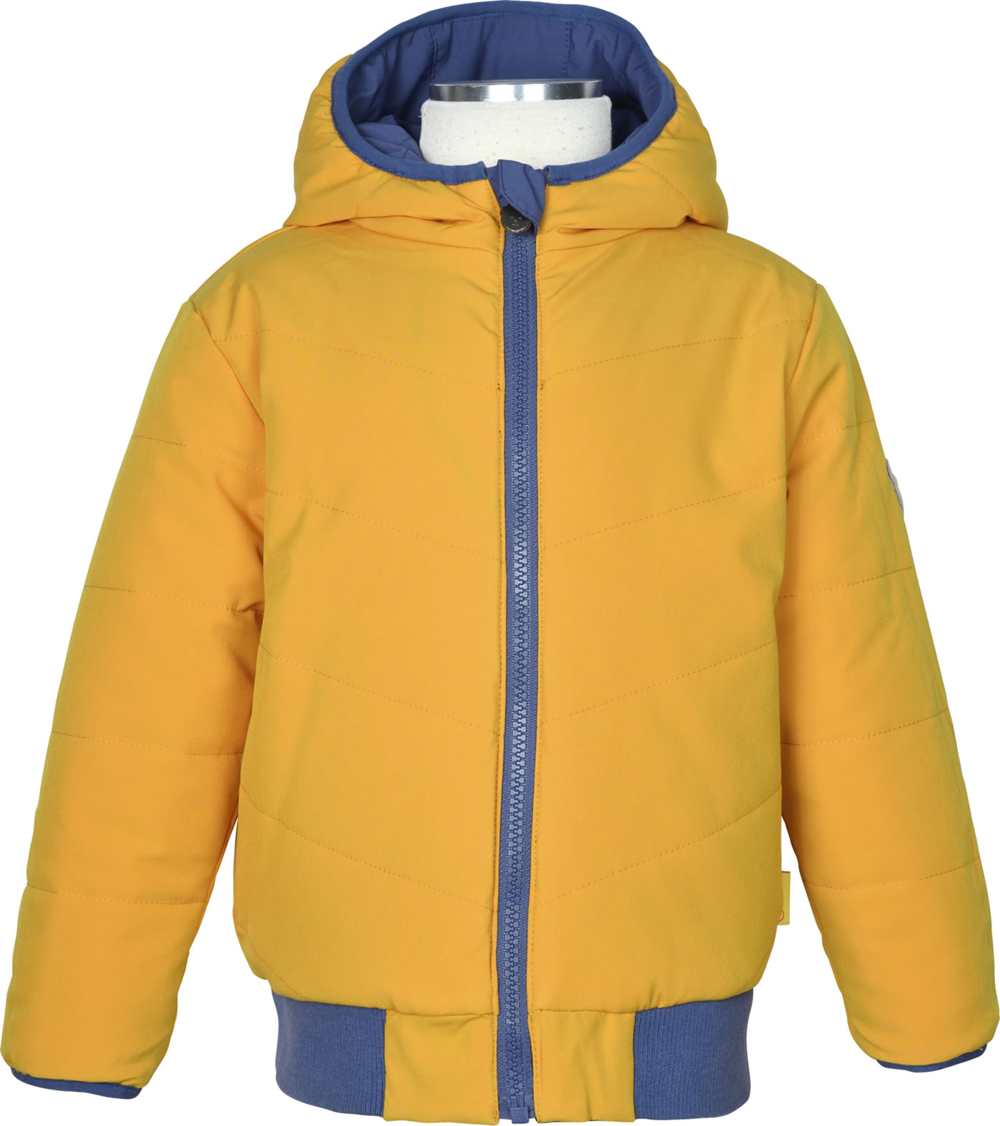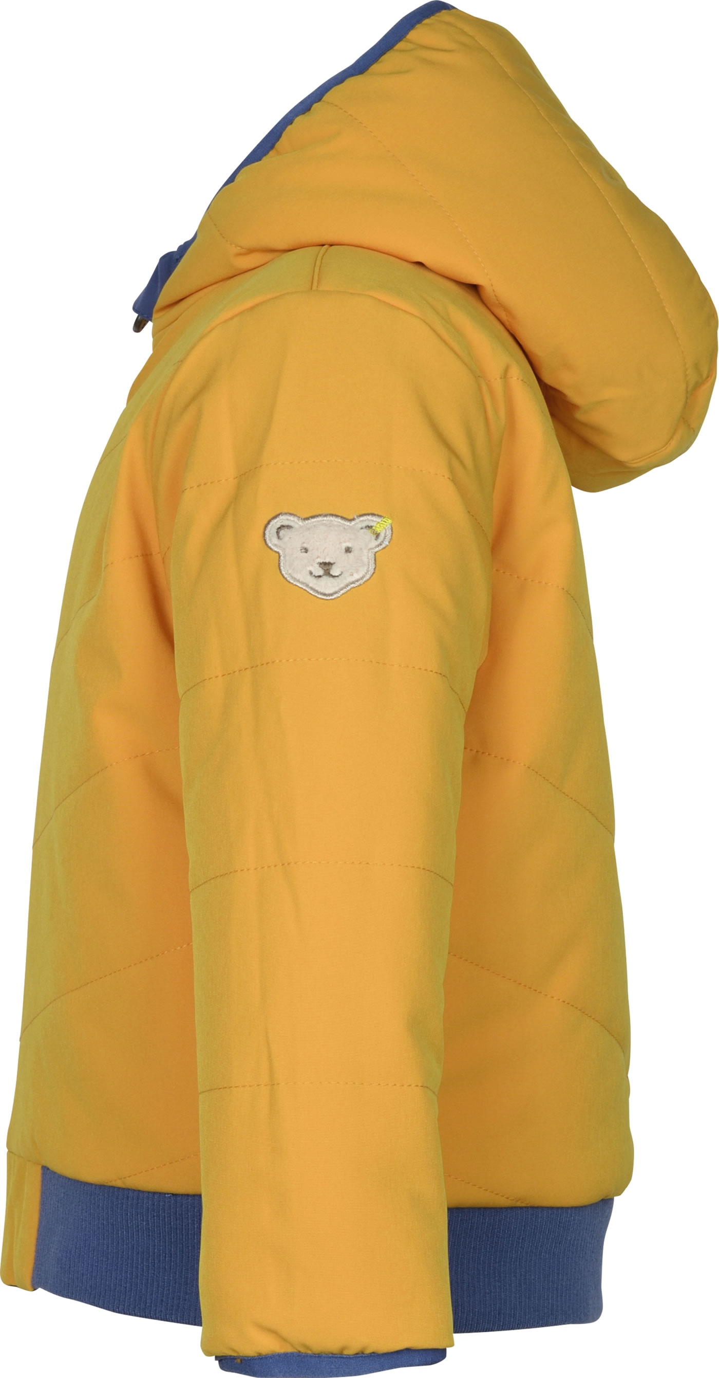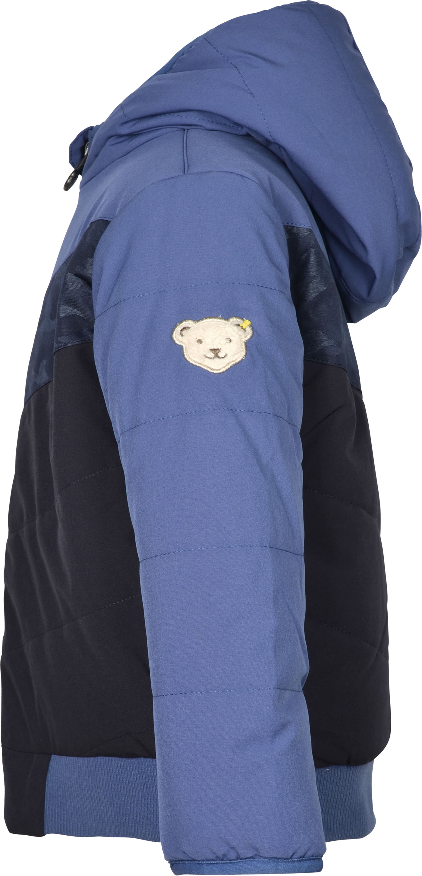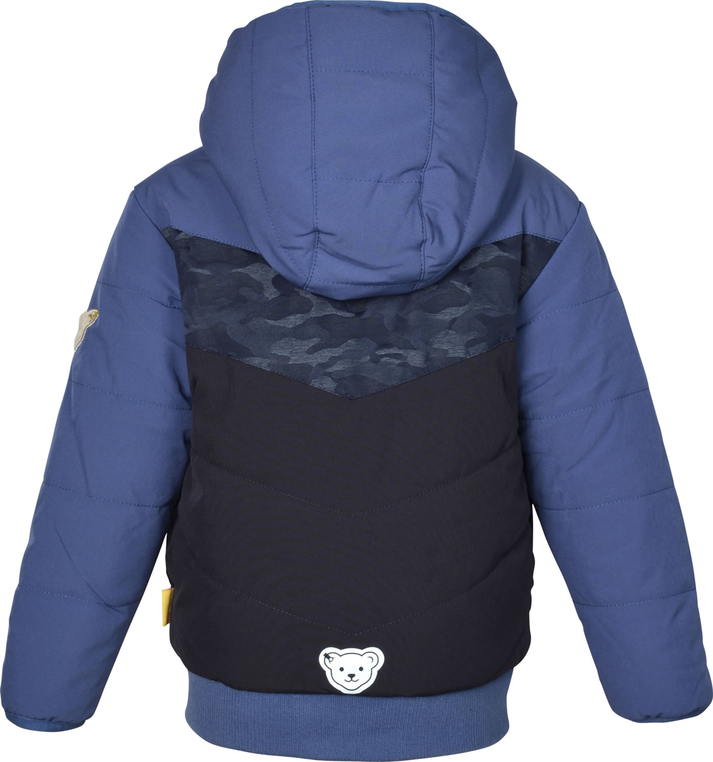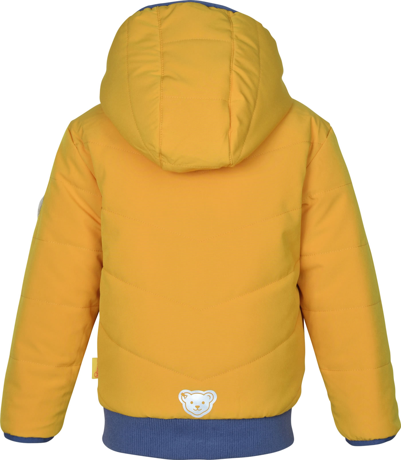 Quilted reversible jacket with hood from the Let's Play! Collection by STEIFF for boys. The jacket can be worn from both sides. The padding offers protection from cold, wind and rain. The jacket is closed with a zipper. The breathable BIONIC-FINISH ECO impregnation is fluorine-free and makes the surface water and dirt repellent. Cuffs on the hem and sleeves keep the wind out. The little STEIFF bear is a reflective element on the back.