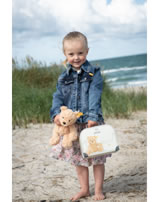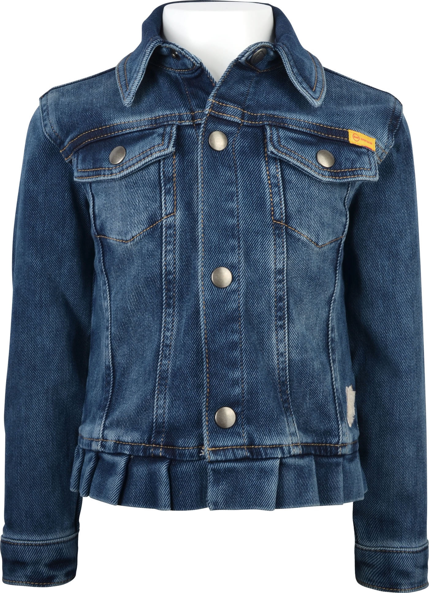 Sporty denim jacket for girls from the Wild City collection by STEIFF. Two chest pockets offer space for small items. The small STEIFF bear's head can be found on the front left side. The jacket can be opened and closed with snaps. A romantic ruffled waistband completes the look. The elastic and soft material ensures a good fit. It can be combined perfectly.