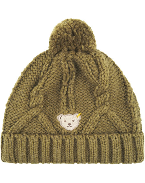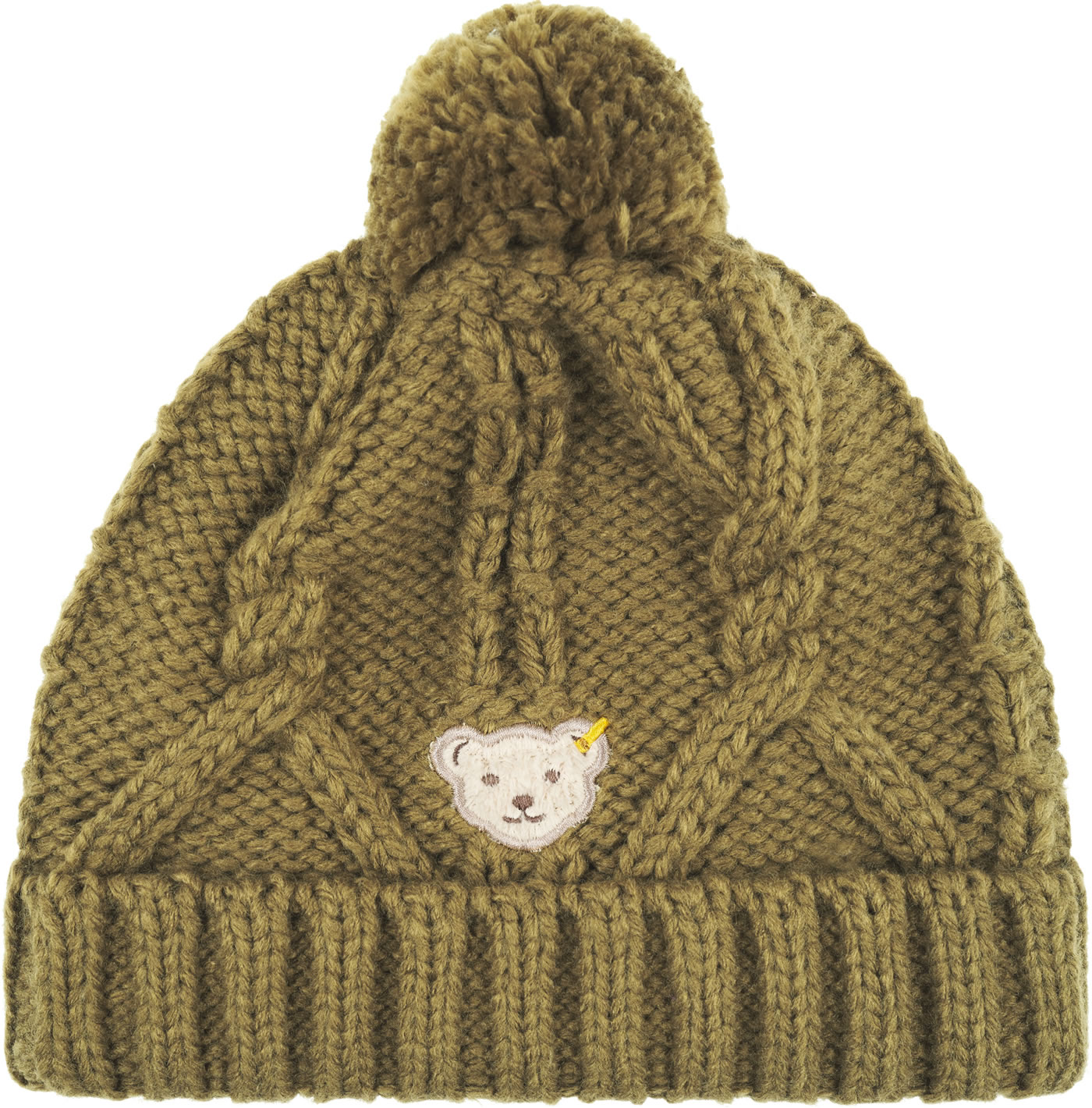 Warm knitted hat with pompom by STEIFF from the classic collection for boys. The little STEIFF bear adorns the front of the hat. The hat with cable pattern is lined with warm fleece in the area of the ears.