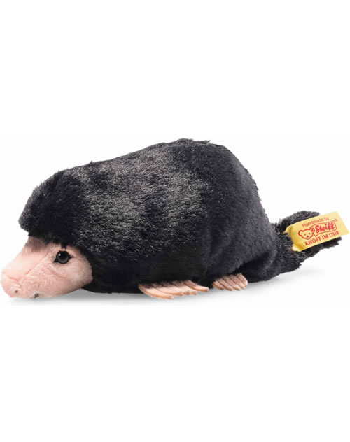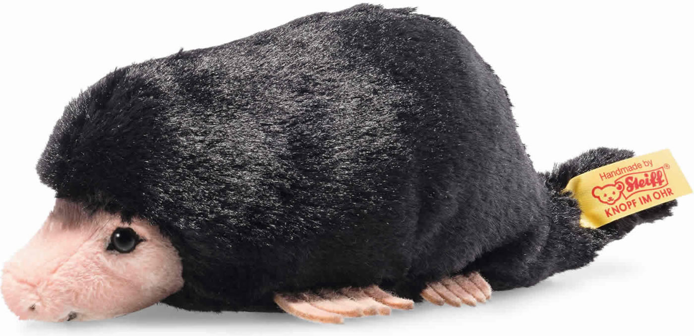 He can dig tunnels like nobody else. And molehills are his speciality. 14 cm tall Bazi mole loves showing his new friends how to do it. His large front paws are made of pink felt and the brown and pink claws are airbrush applications. His tube-shaped body is completely made of cuddly soft black plush fabric all the way to his rump. His pink face makes a beautiful contrast.