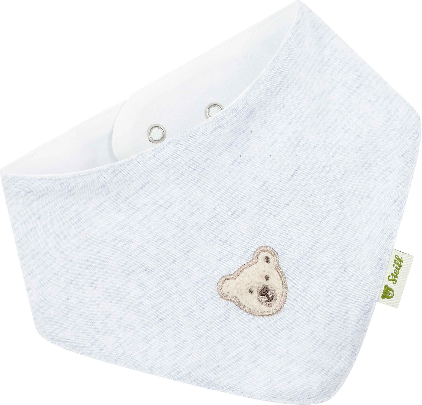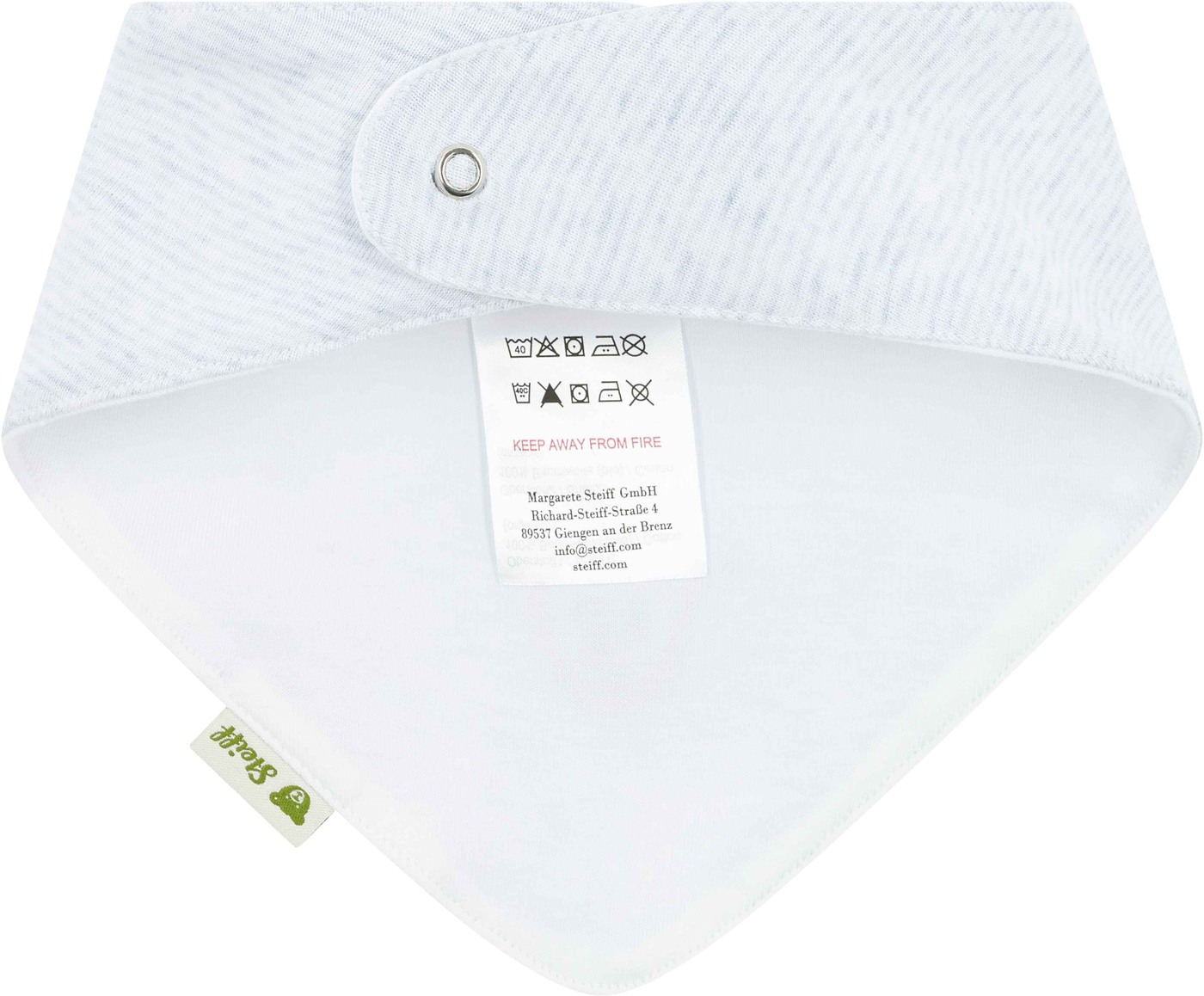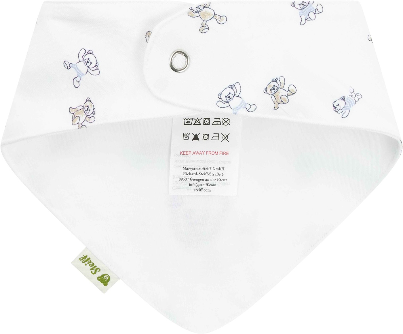 The set of two scarves is a cute and practical accessory for the smallest Steiff fans. One scarf comes in a delicate light blue melange made of ribbed fabric, the other in soft jersey with a lovely teddy bear print. Both scarves have snap fasteners that make them particularly easy to put on and take off. The fluffy Steiff teddy bear motif on both scarves gives them a charming accent.