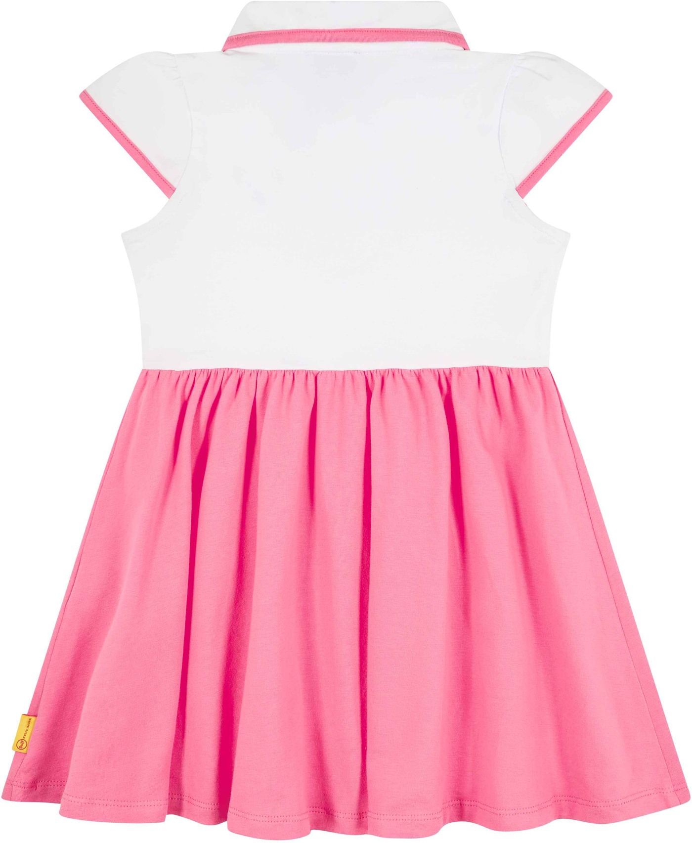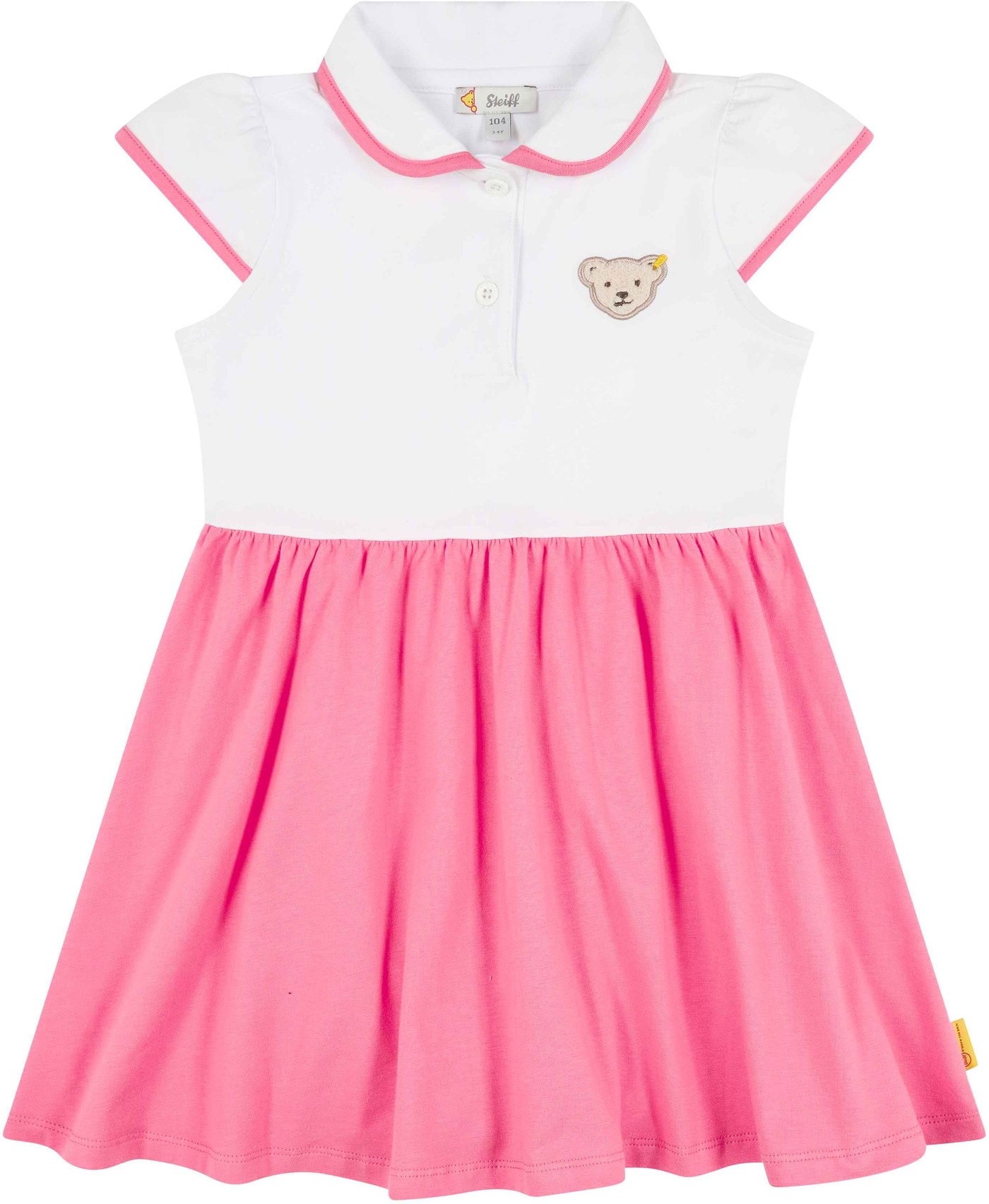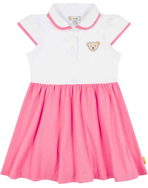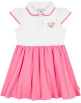 Polo dress made of single jersey by STEIFF from the Califoria Dream collection. The pretty cup sleeves are a special eye-catcher. There are great contrasts in pink on the edge of the collar and the cuffs. The ruffled skirt part not only looks chic, it also offers freedom of movement for playing and running around. Of course, the fluffy STEIFF teddy shouldn't be missing and is on the front.
