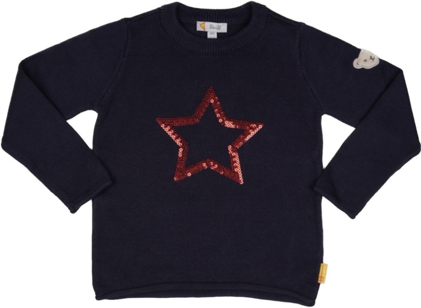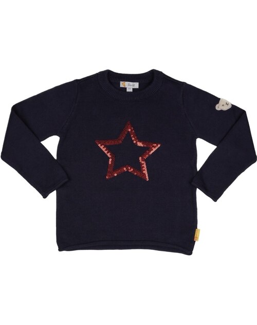 Nice knitted sweater for girls from the Bear to School collection by STEIFF. The STEIFF bear is on the left sleeve. The red star made of sequins on the front is a great eye-catcher.