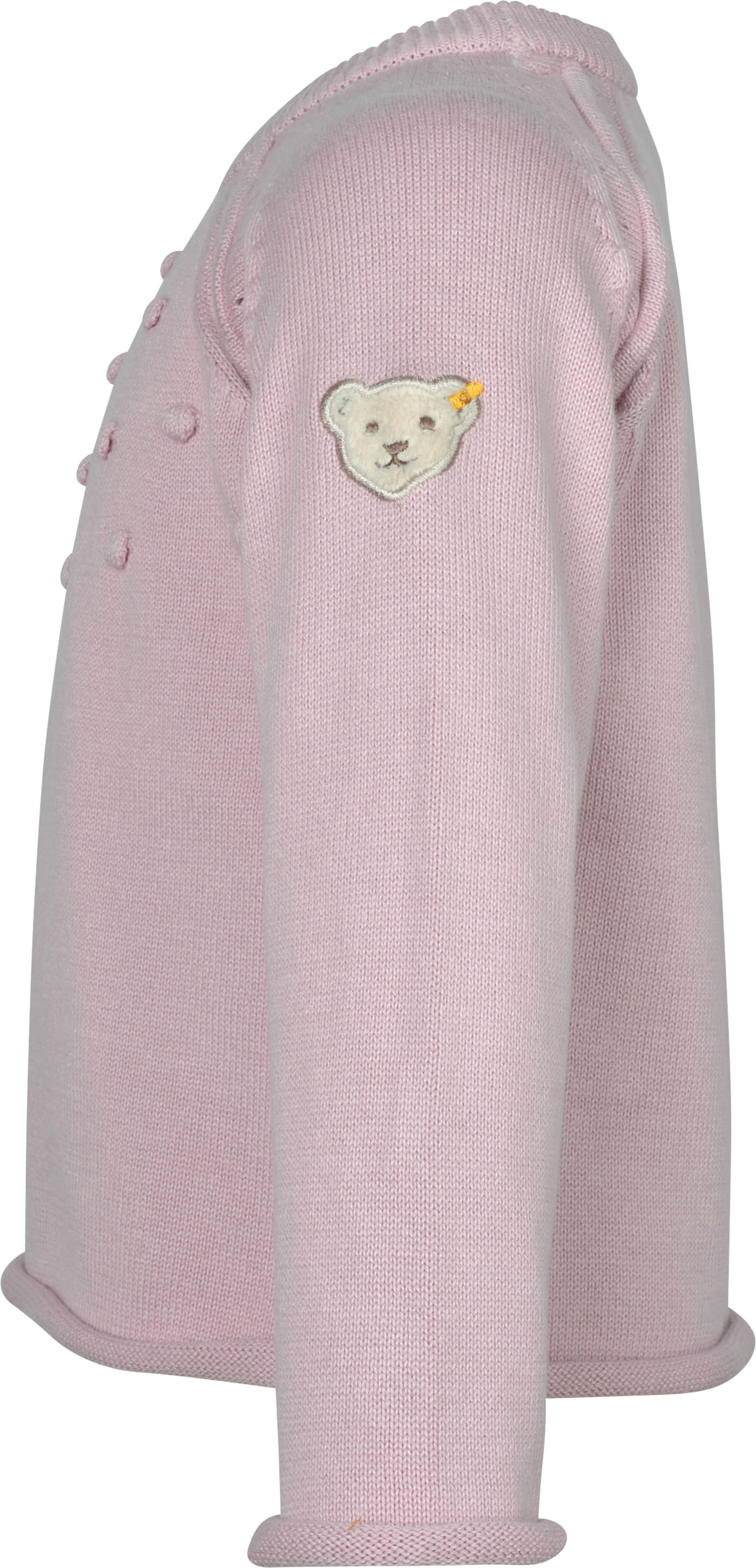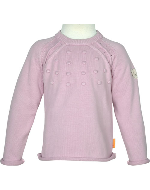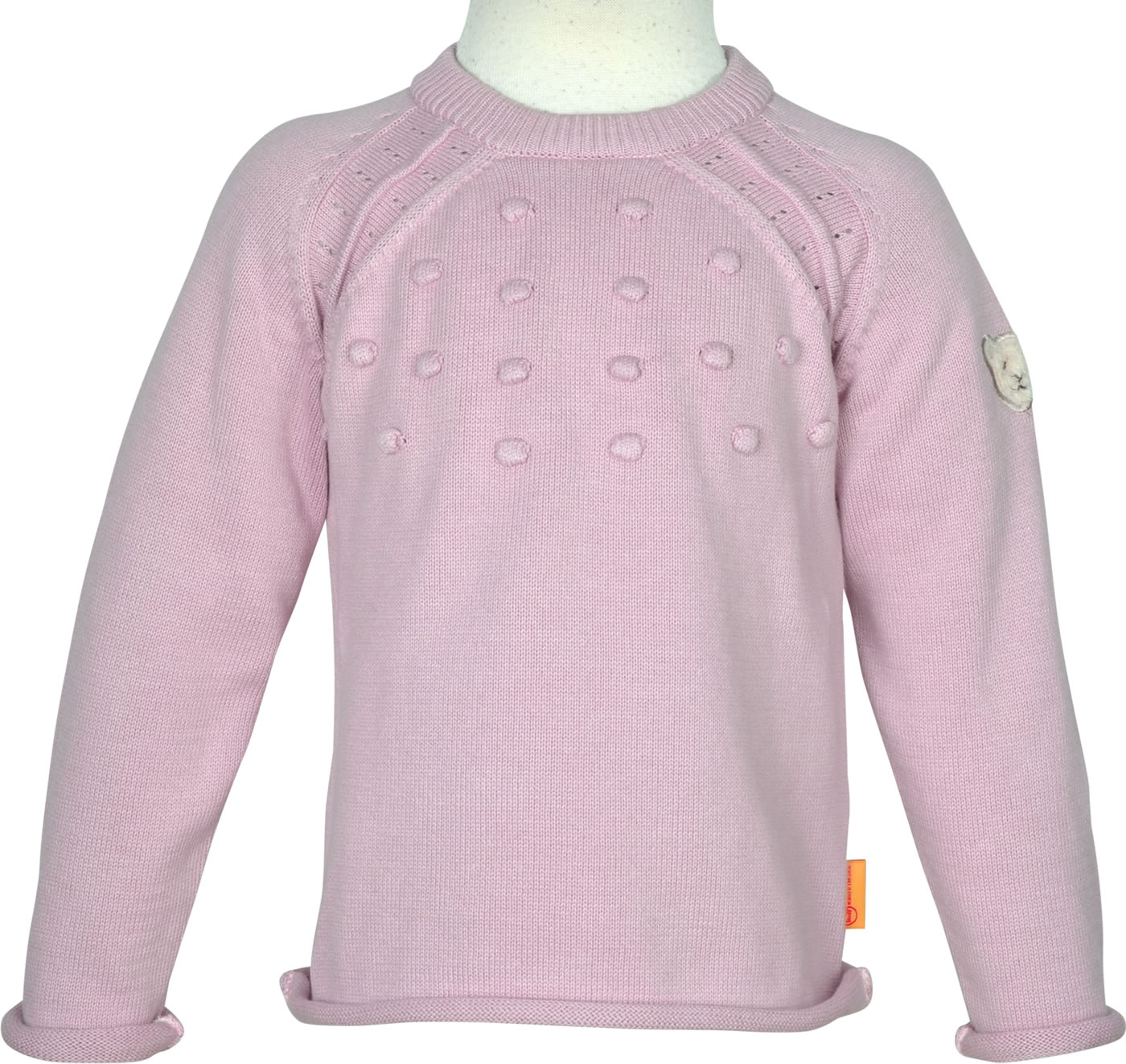 Nice knitted sweater for girls from the Sweet Heart collection by STEIFF. The STEIFF bear is on the left sleeve. Special details are the knitted knobs on the front and the hole pattern on the raglan sleeves.