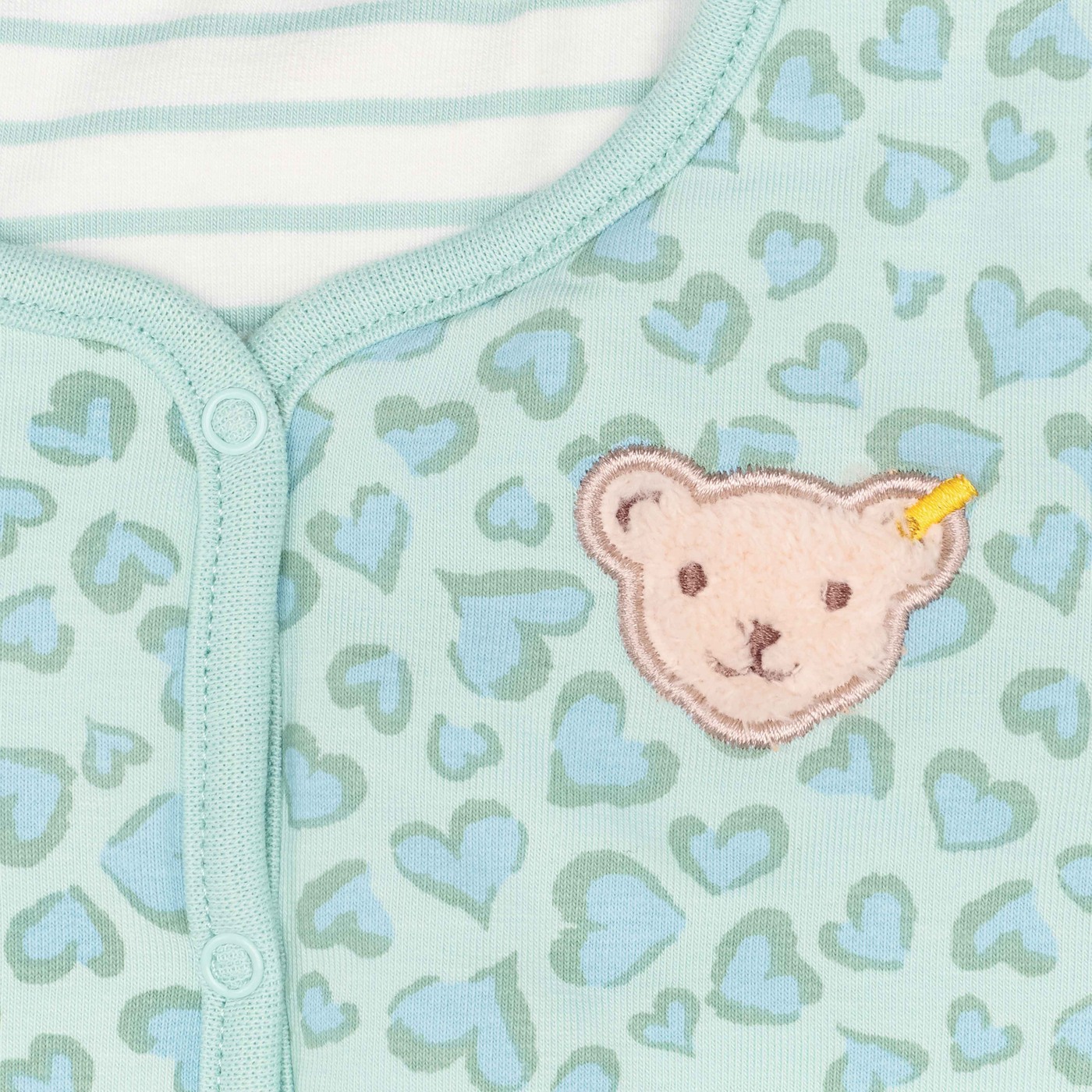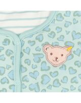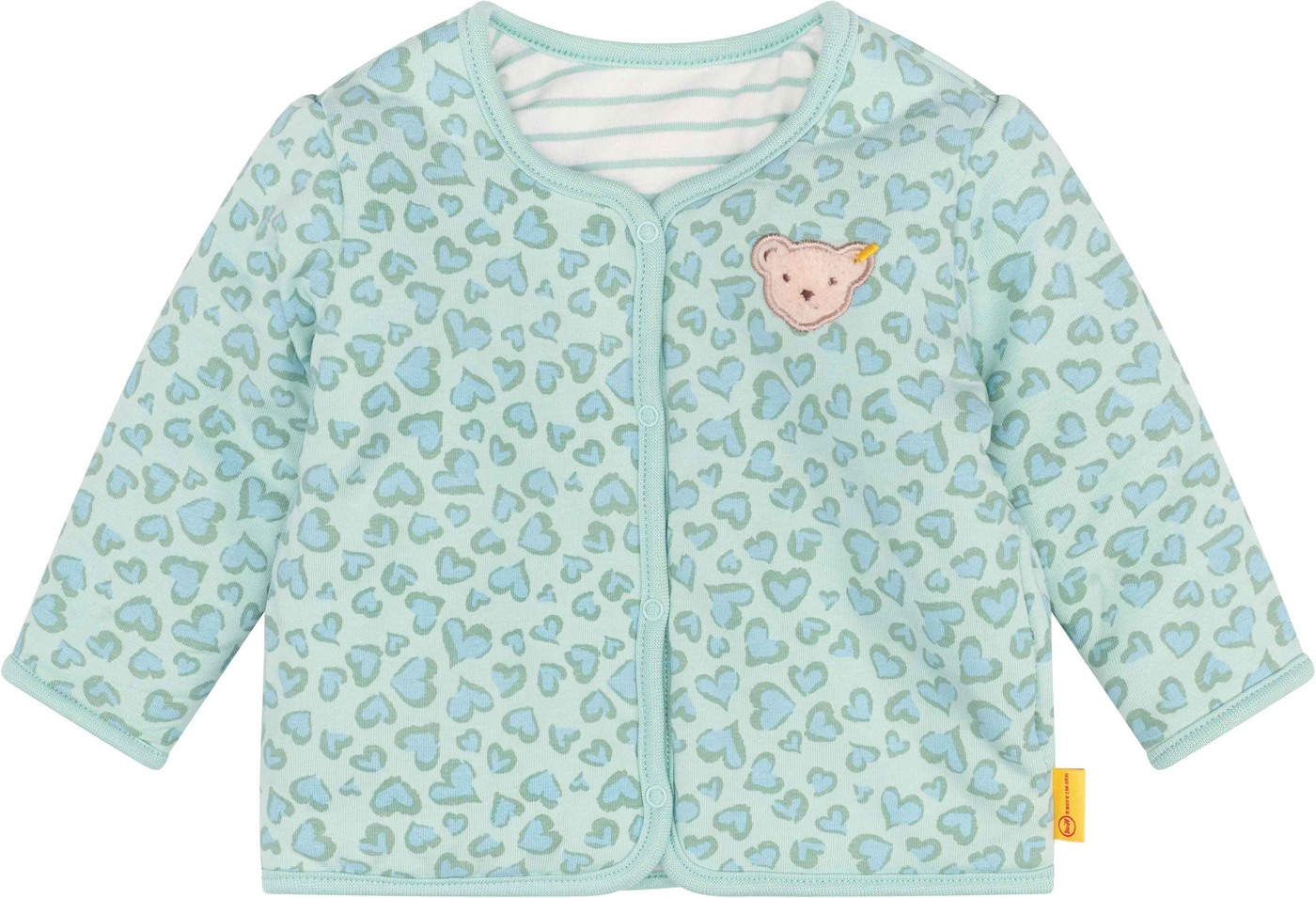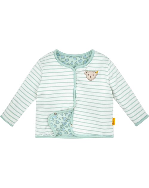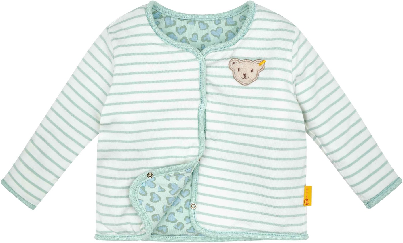 La veste réversible STEIFF pour fille de la collection Jungle Feeling tient bien au chaud grâce à son rembourrage. Il est fermé par des boutons pressions. La veste peut être portée avec le côté rayé ou le côté avec des cœurs selon votre humeur. Le petit ours STEIFF est sur la poitrine.