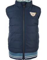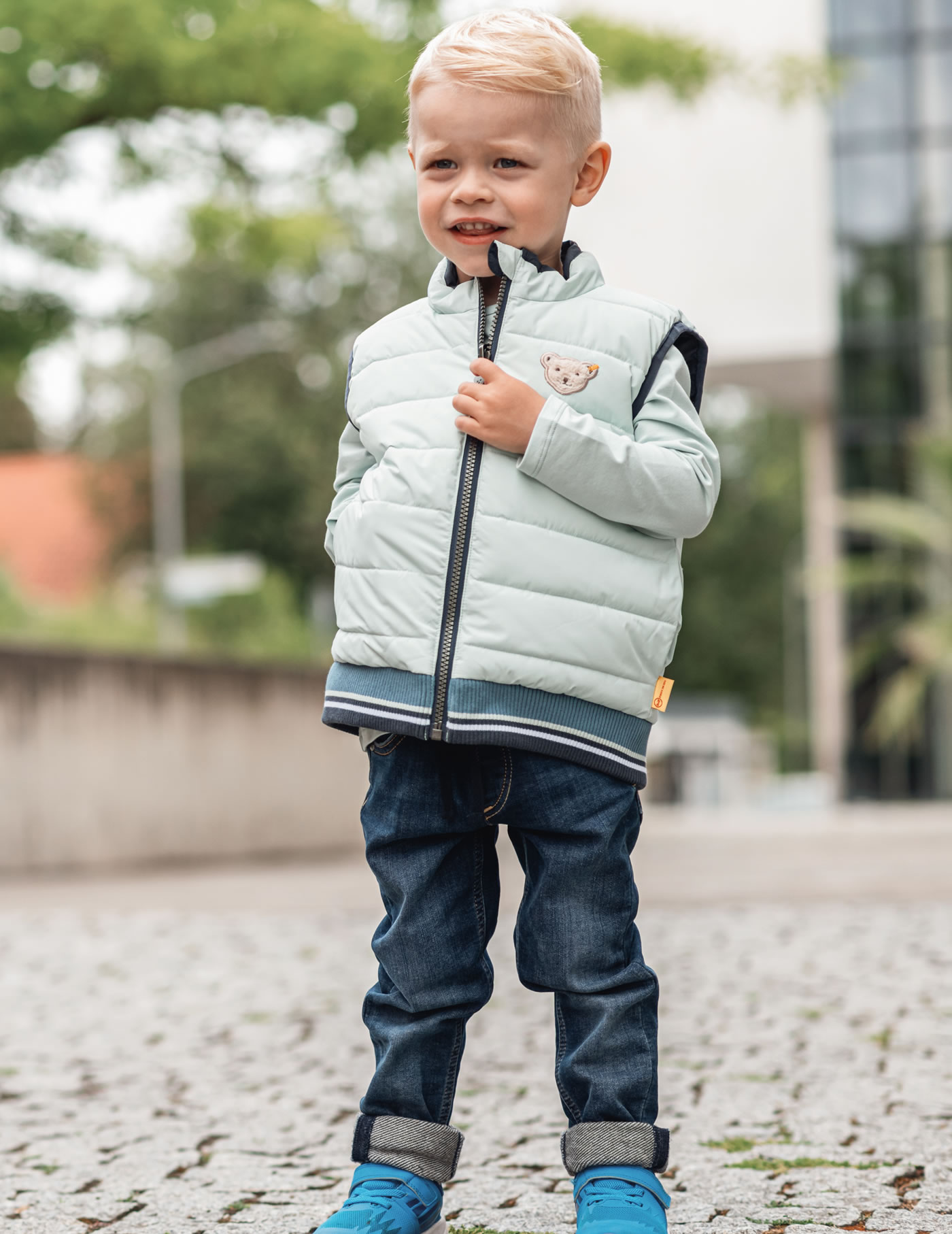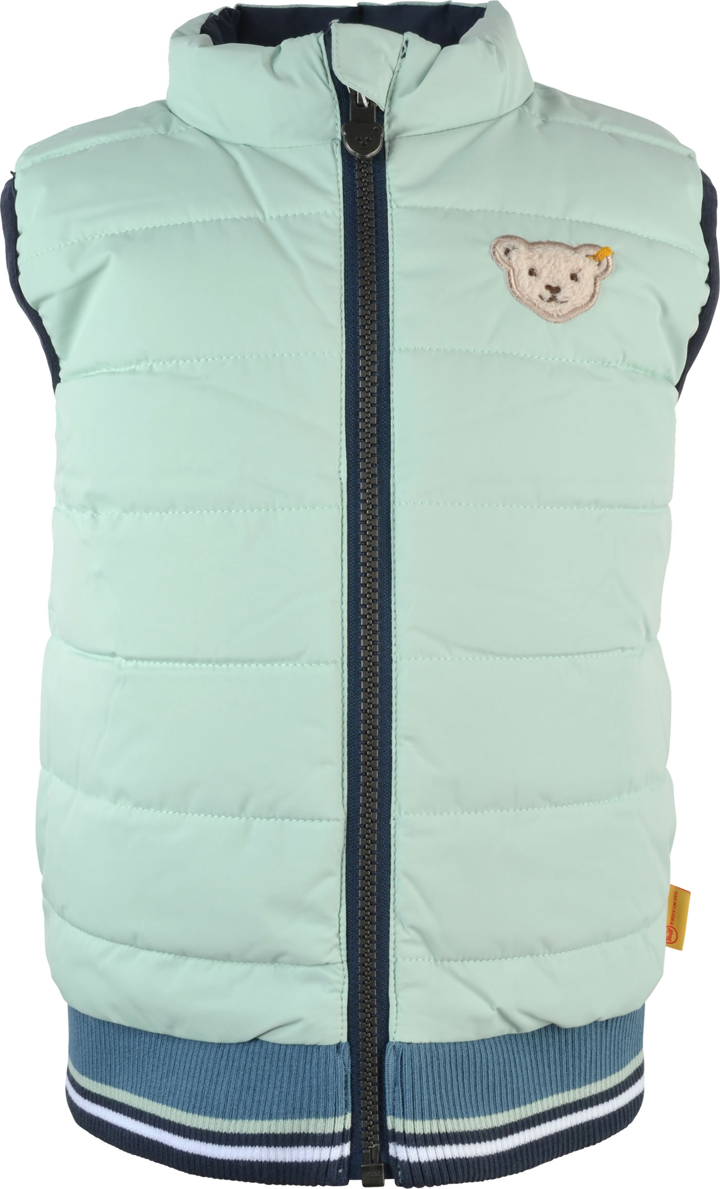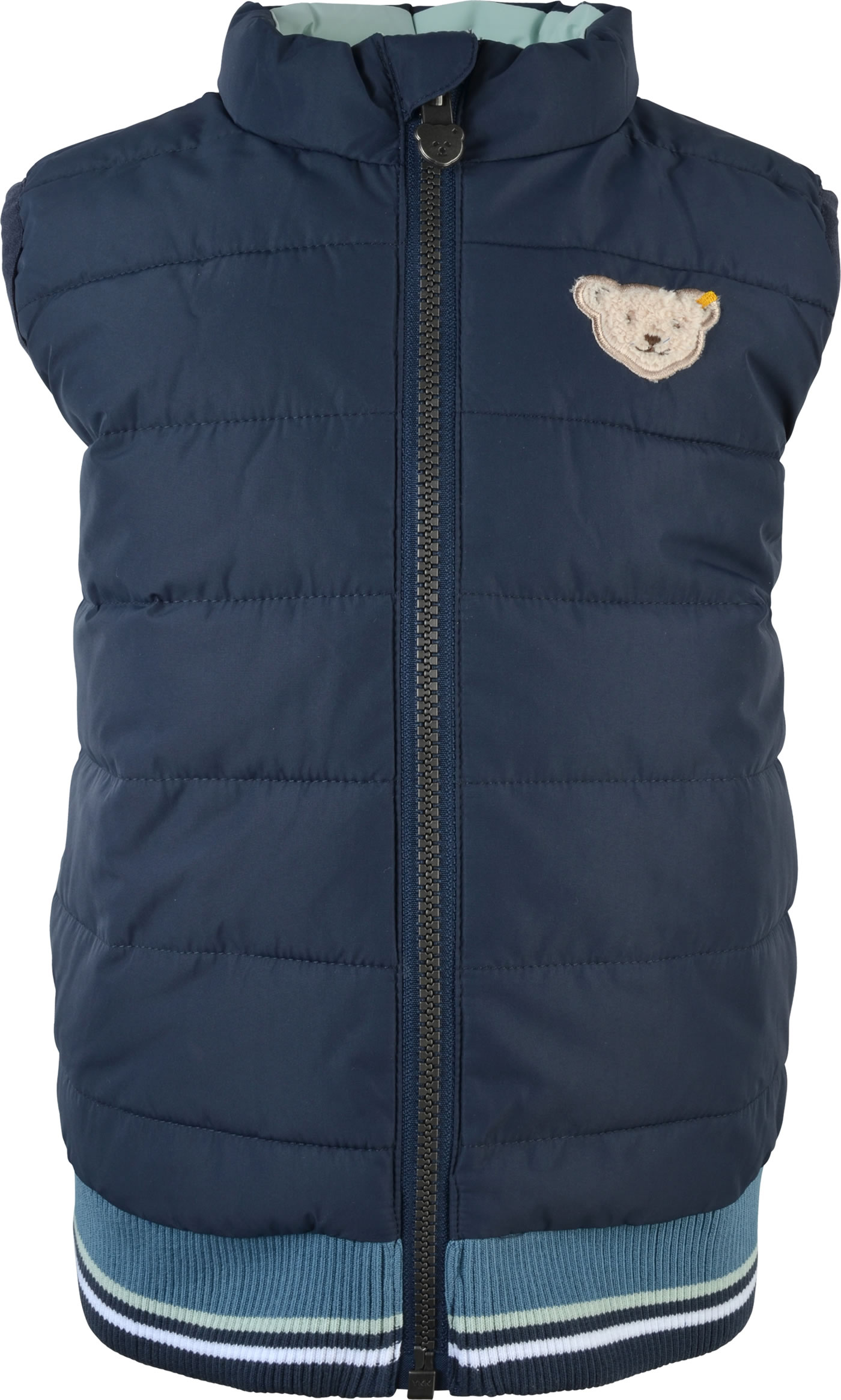 Reversible vest for boys from the Aligator Island collection by STEIFF. The vest is padded and therefore keeps you nice and warm. Thanks to ecological BIONIC-FINISH®ECO impregnation without plasticizers, the outer material is wind- and water-repellent as well as breathable. A zipper with chin guard prevents possible entrapment and the stand-up collar protects the neck area. Small treasures find a safe place in the pockets. Depending on your mood, the dark blue or light green side can be worn outwards. The small STEIFF bear is located on the left side of the chest and striped cuffs at the end provide another eye-catcher.