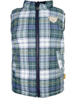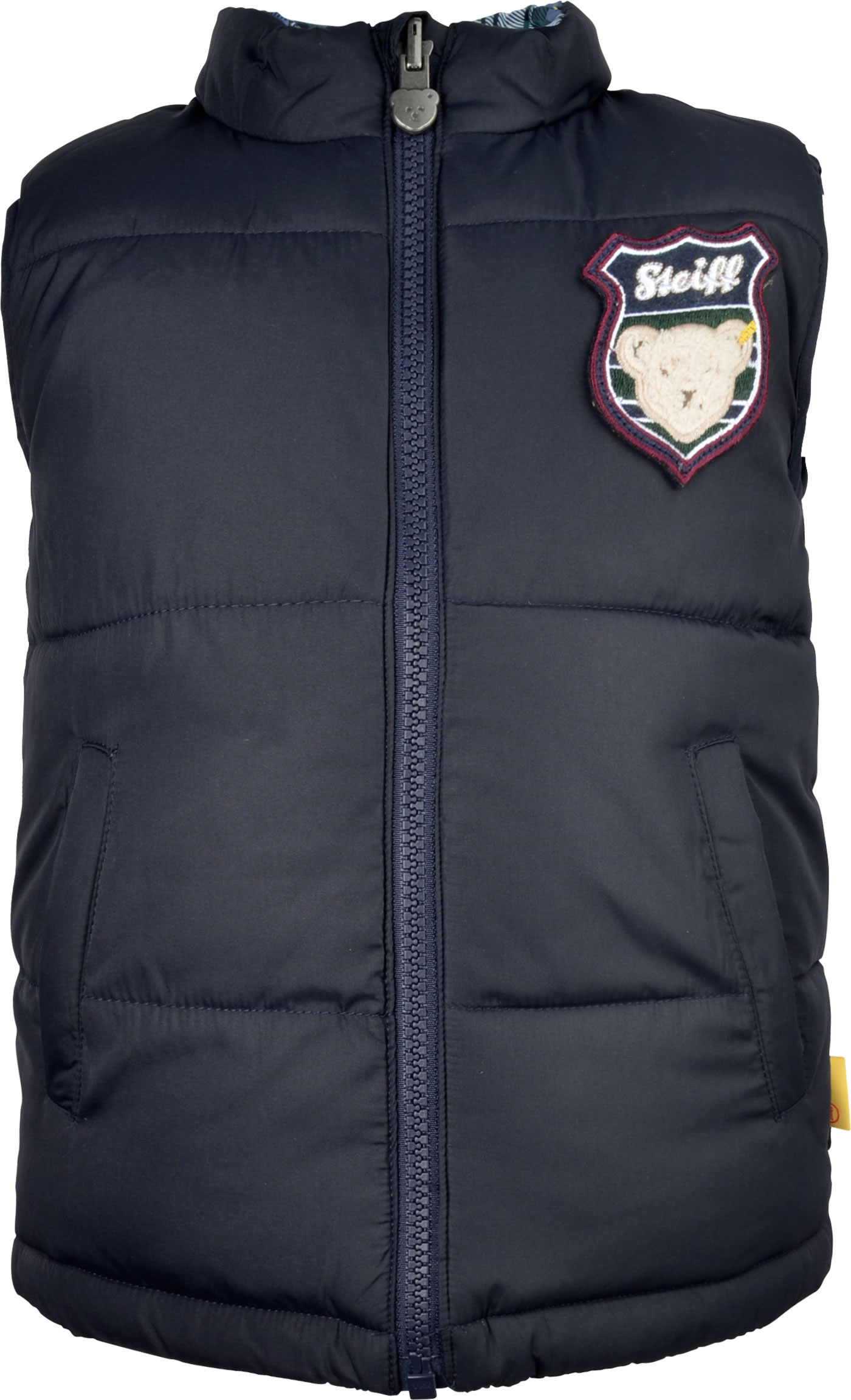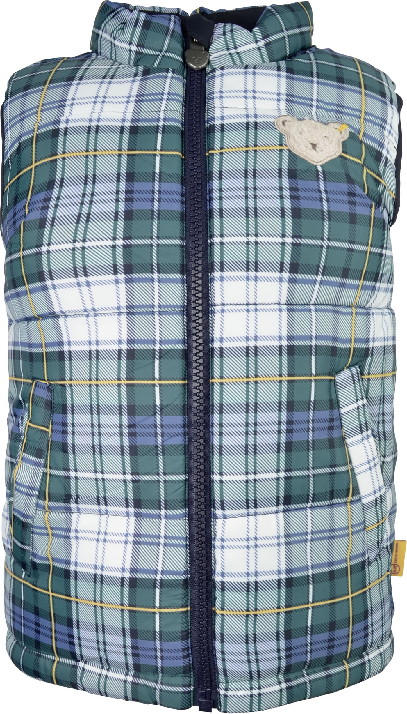 Reversible waistcoat with a stand-up collar for boys from the Year of the Teddy bear collection by STEIFF. The vest is padded and keeps you nice and warm. Beautiful details are the STEIFF coat of arms on the chest and the two pockets. The waistcoat can be worn with the plain side or the checked side depending on your mood. The breathable BIONIC-FINISH ECO impregnation is fluorine-free and makes it water and dirt-repellent.