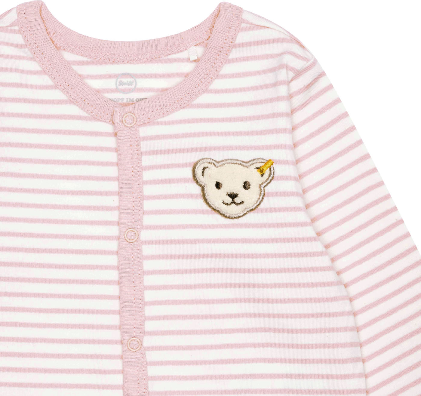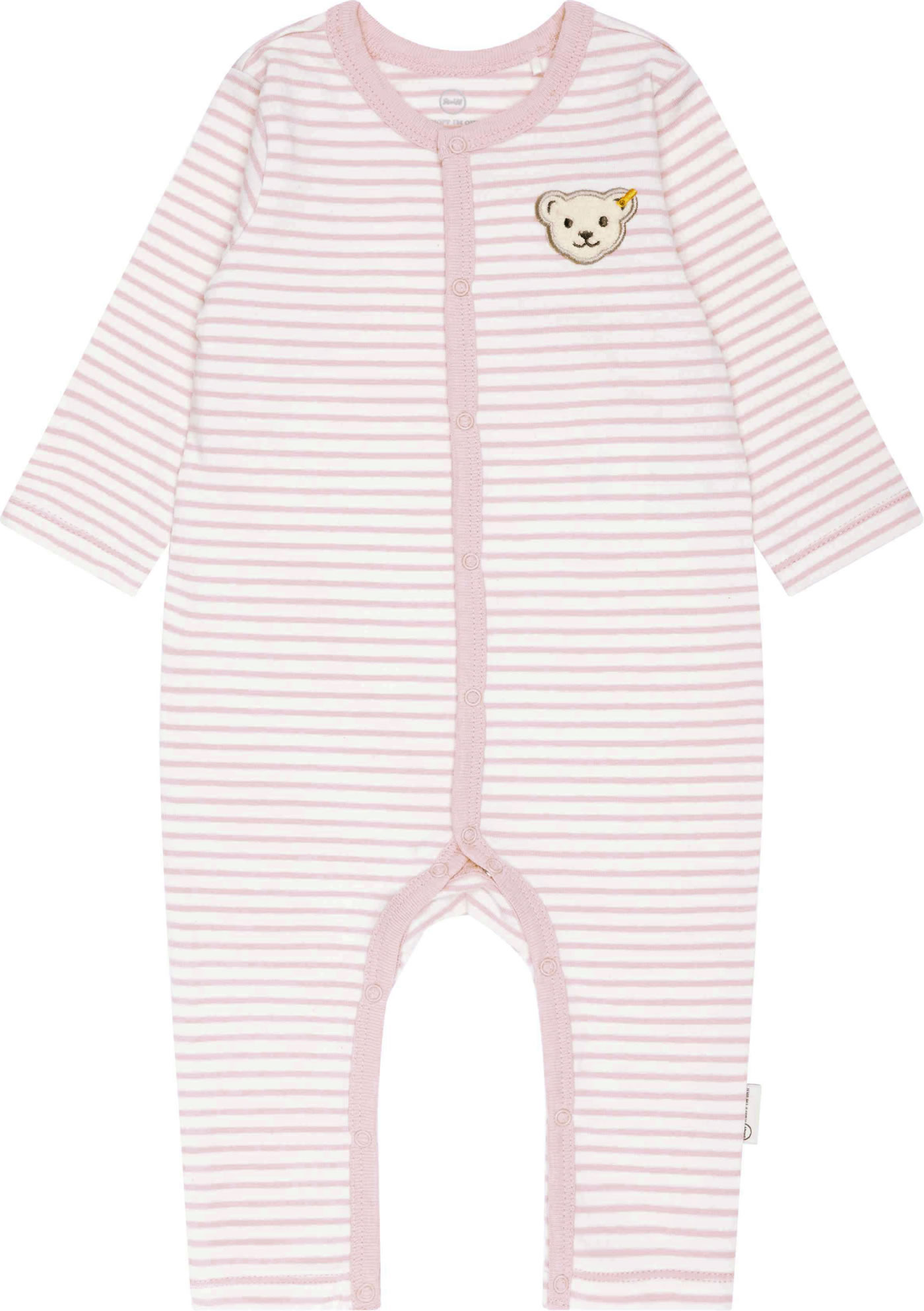 Striped long-sleeved romper made from soft jersey from the STEIFF baby wellness collection. a continuous snap button strip makes it easier to put on and take off. A nice detail is the STEIFF bear on the chest. The cotton is organically grown.
