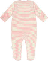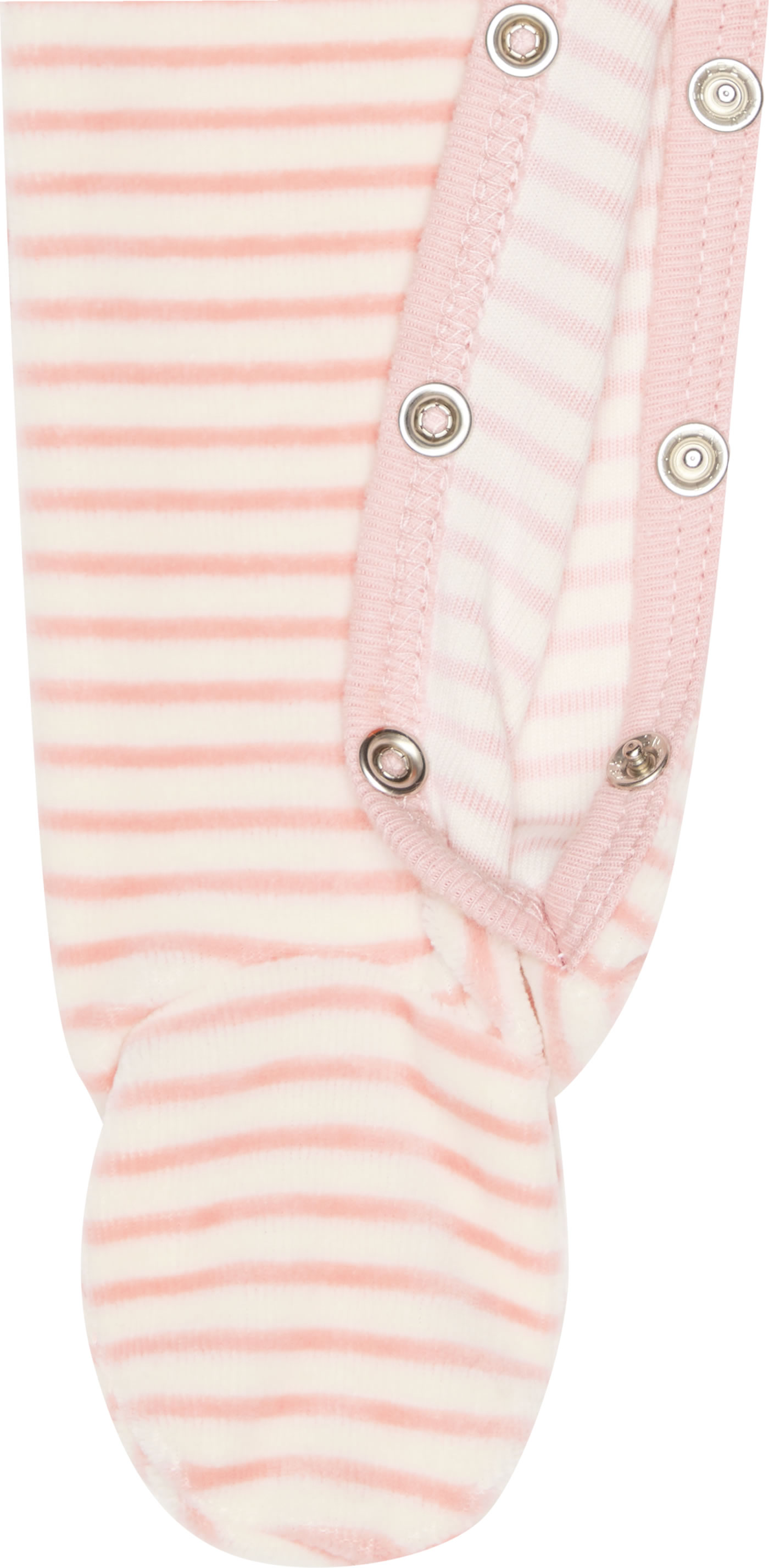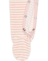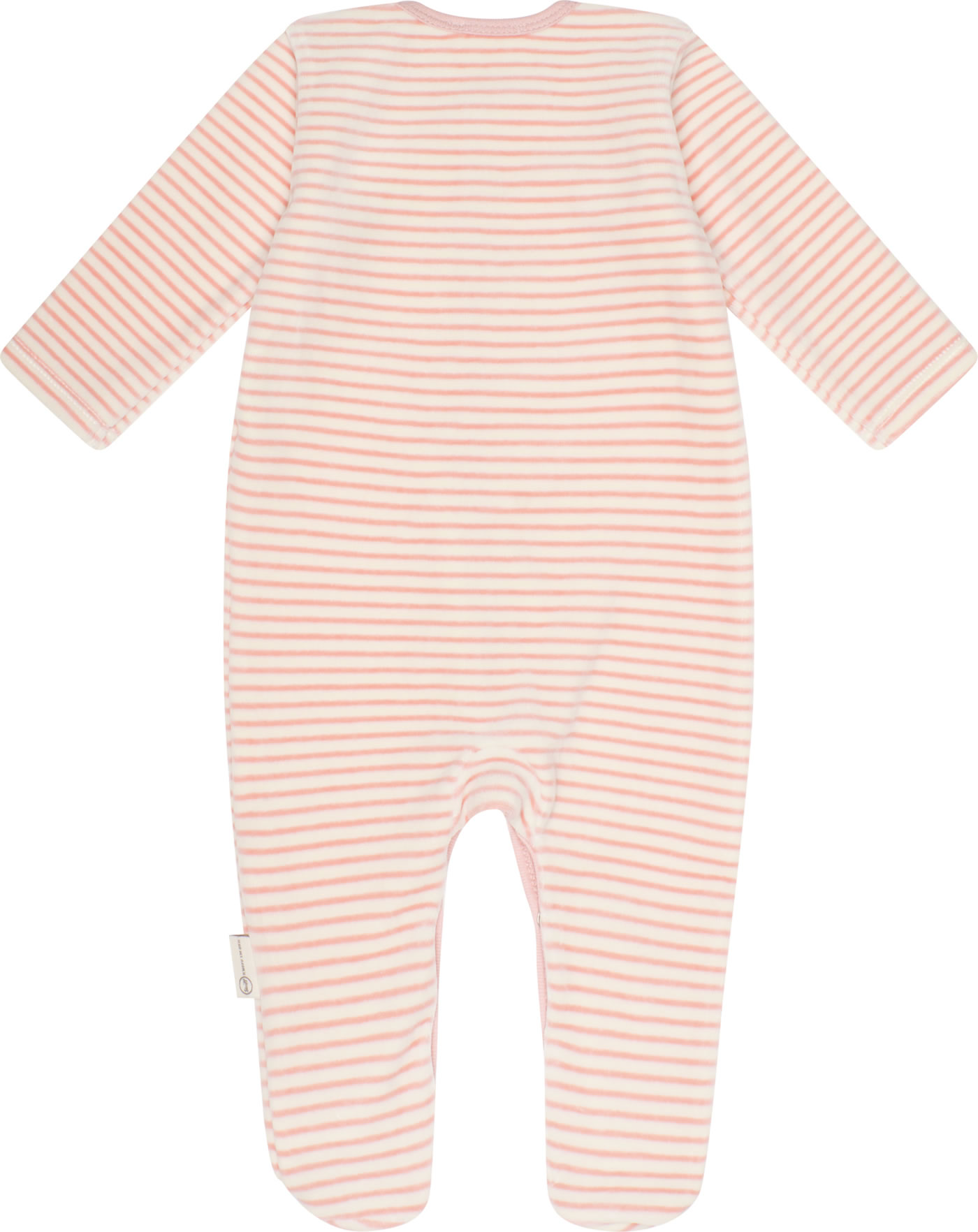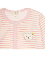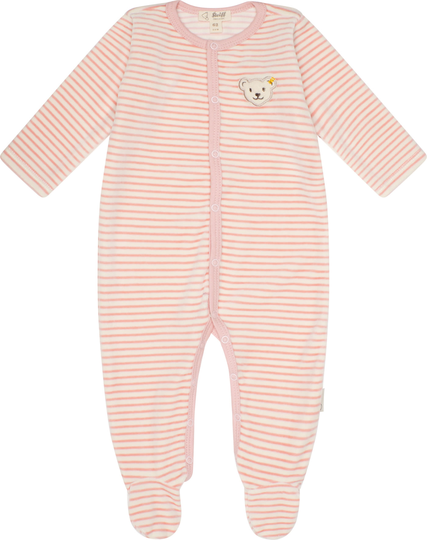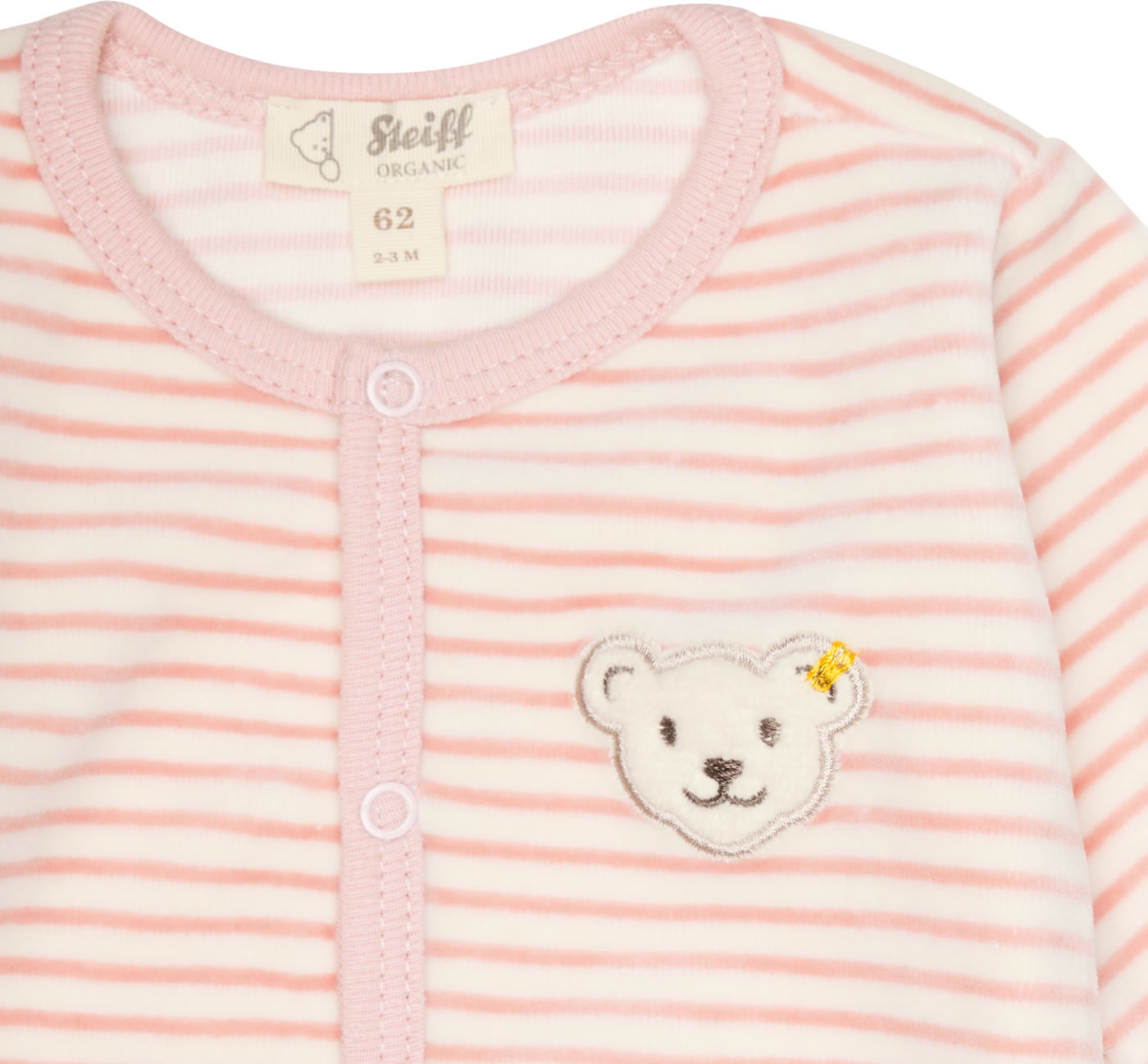 Striped long-sleeved romper made from soft velor material from the STEIFF baby wellness collection. A continuous snap button strip makes it easier to put on and take off. A nice detail is the STEIFF bear on the chest. The cotton is organically grown.
