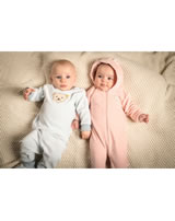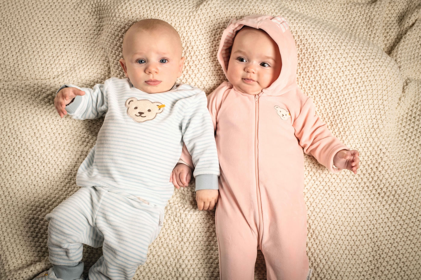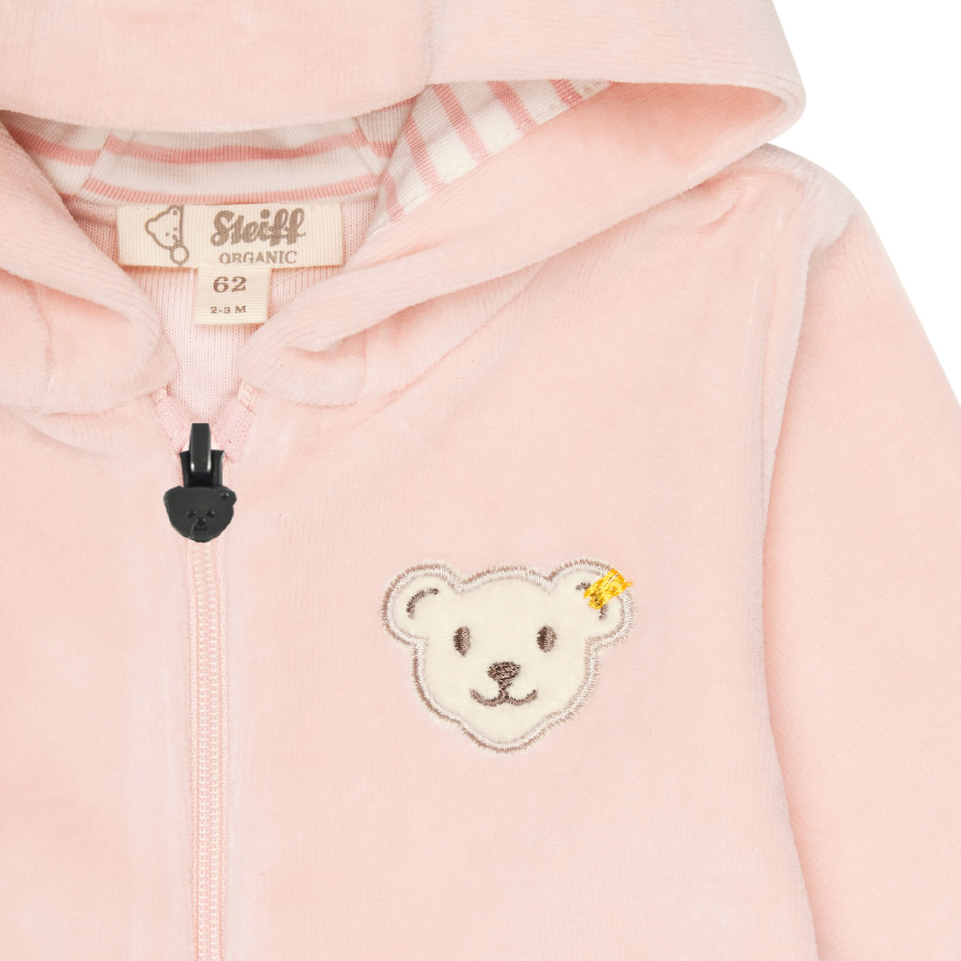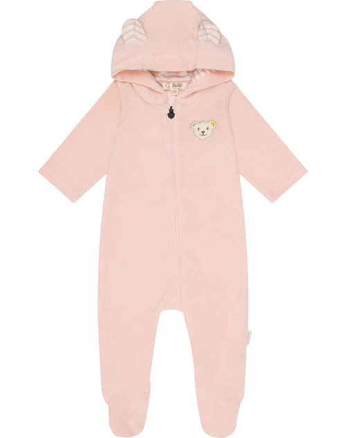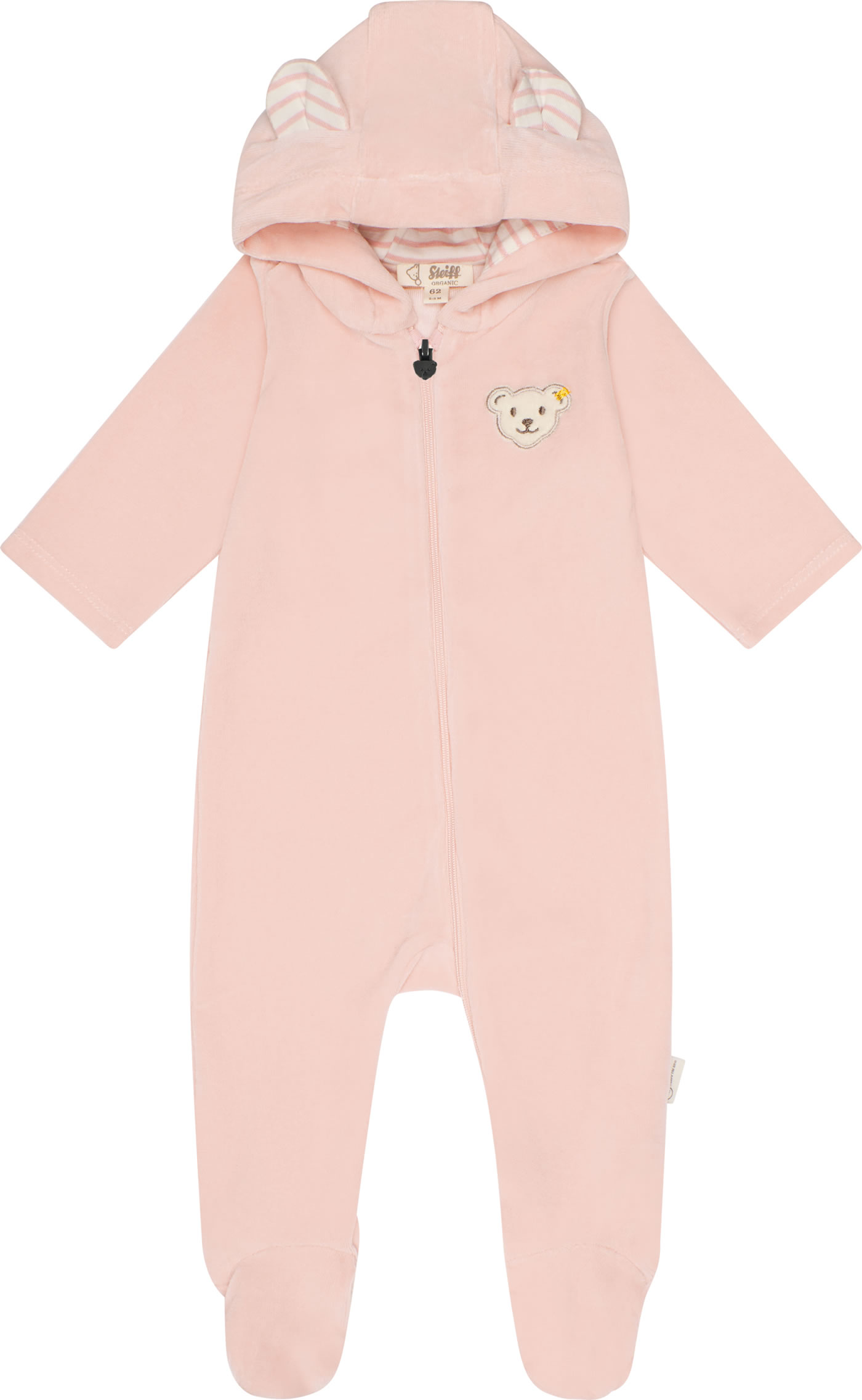 Long-sleeved romper with a hood made of soft velor material from the STEIFF baby wellness collection. A full-length zip makes it easy to put on and take off. Nice details are the striped hood lining, the ears on the hood and the little STEIFF bear on the chest. The cotton is from controlled organic cultivation.
