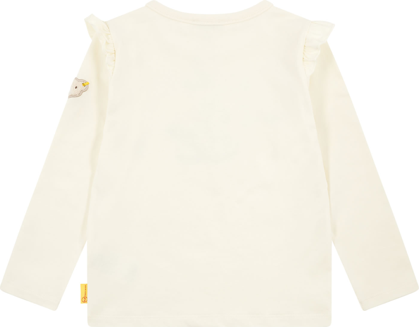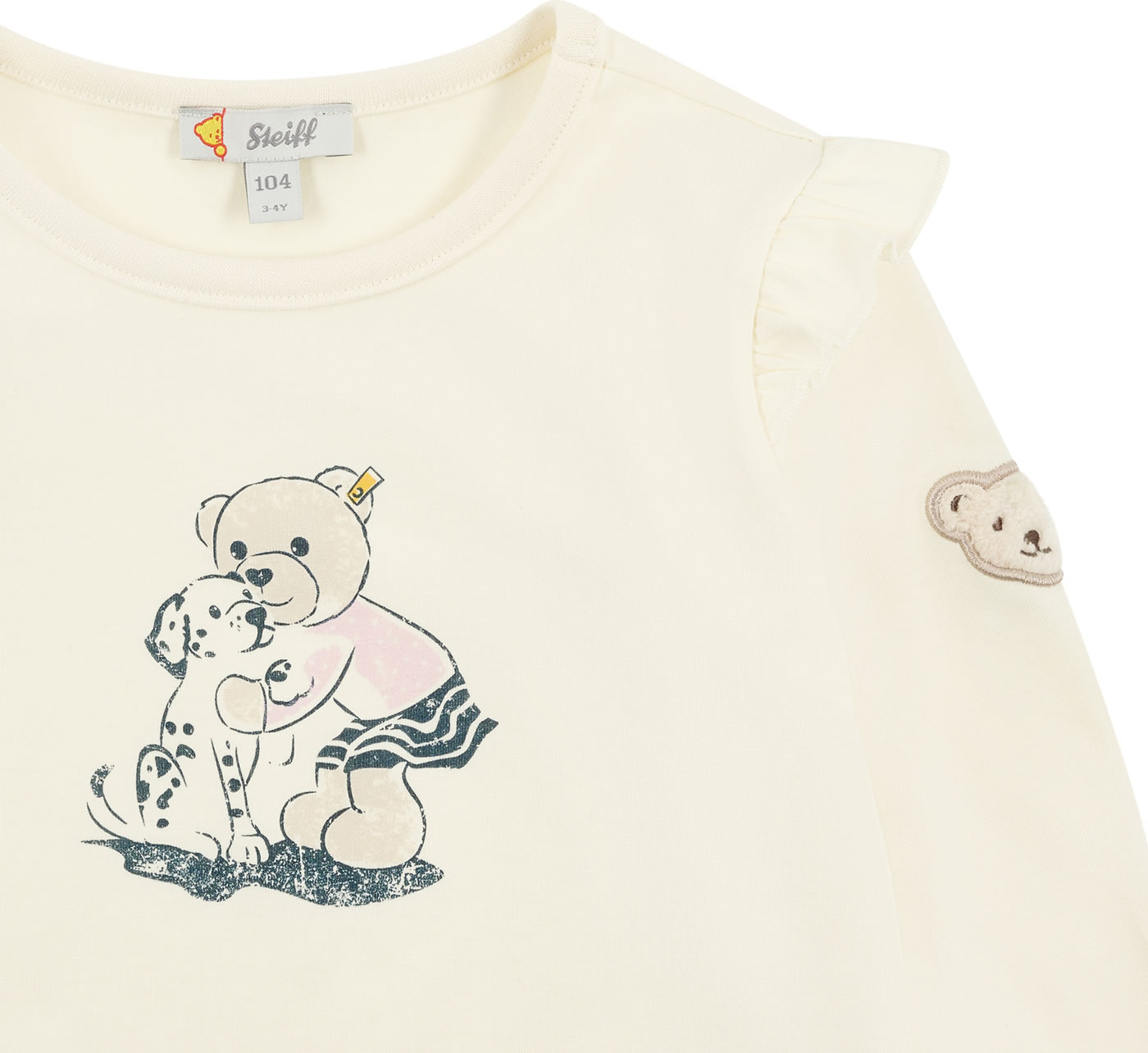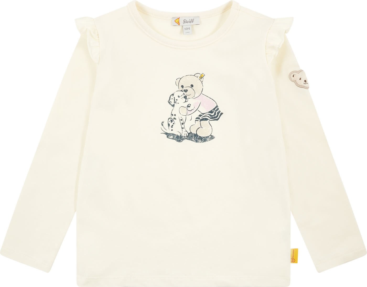 Long-sleeved shirt for girls from the Dalmatian collection by STEIFF. A cute appliqué on the chest and ruffles on the shoulders will quickly make it a favorite. The STEIFF bear adorns the left arm. Light, wonderfully soft jersey ensures a perfect wearing comfort and pleasant warmth.