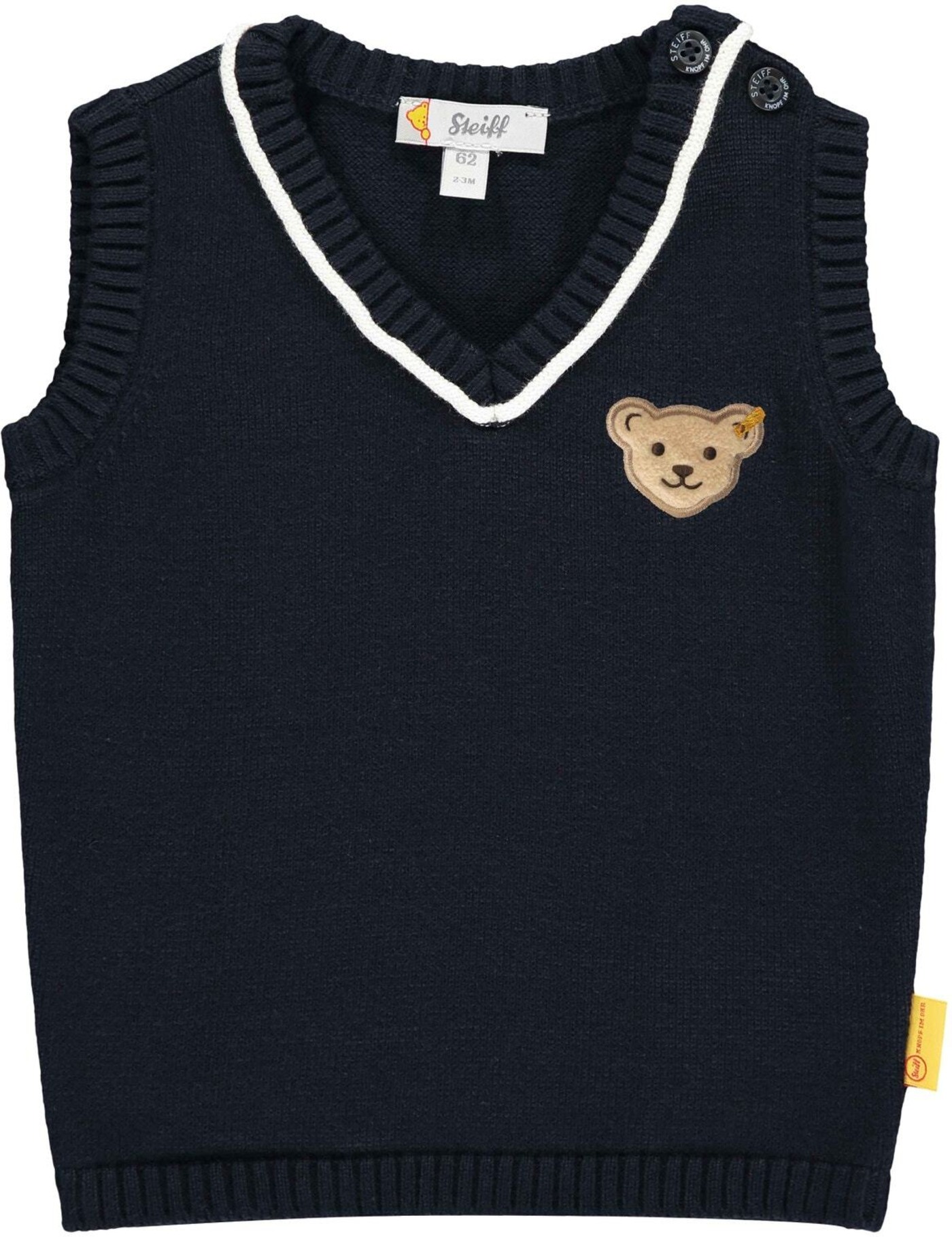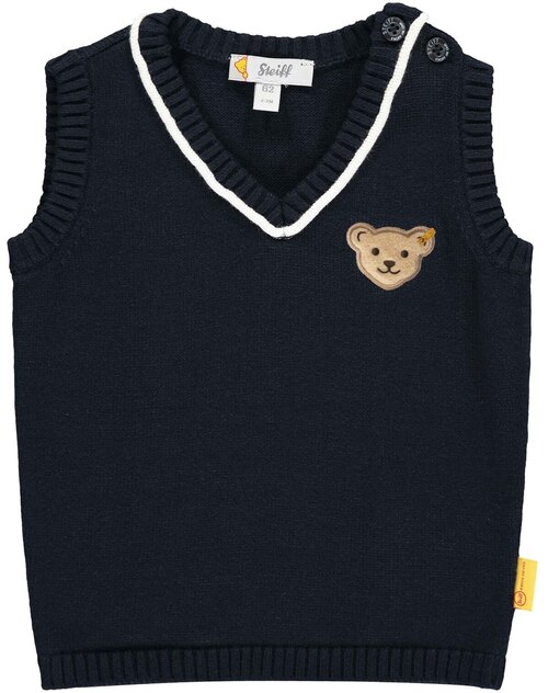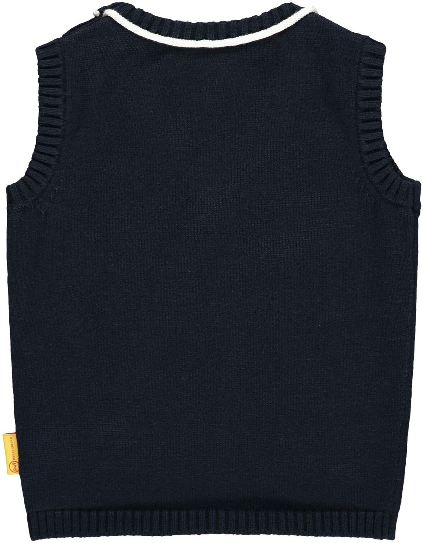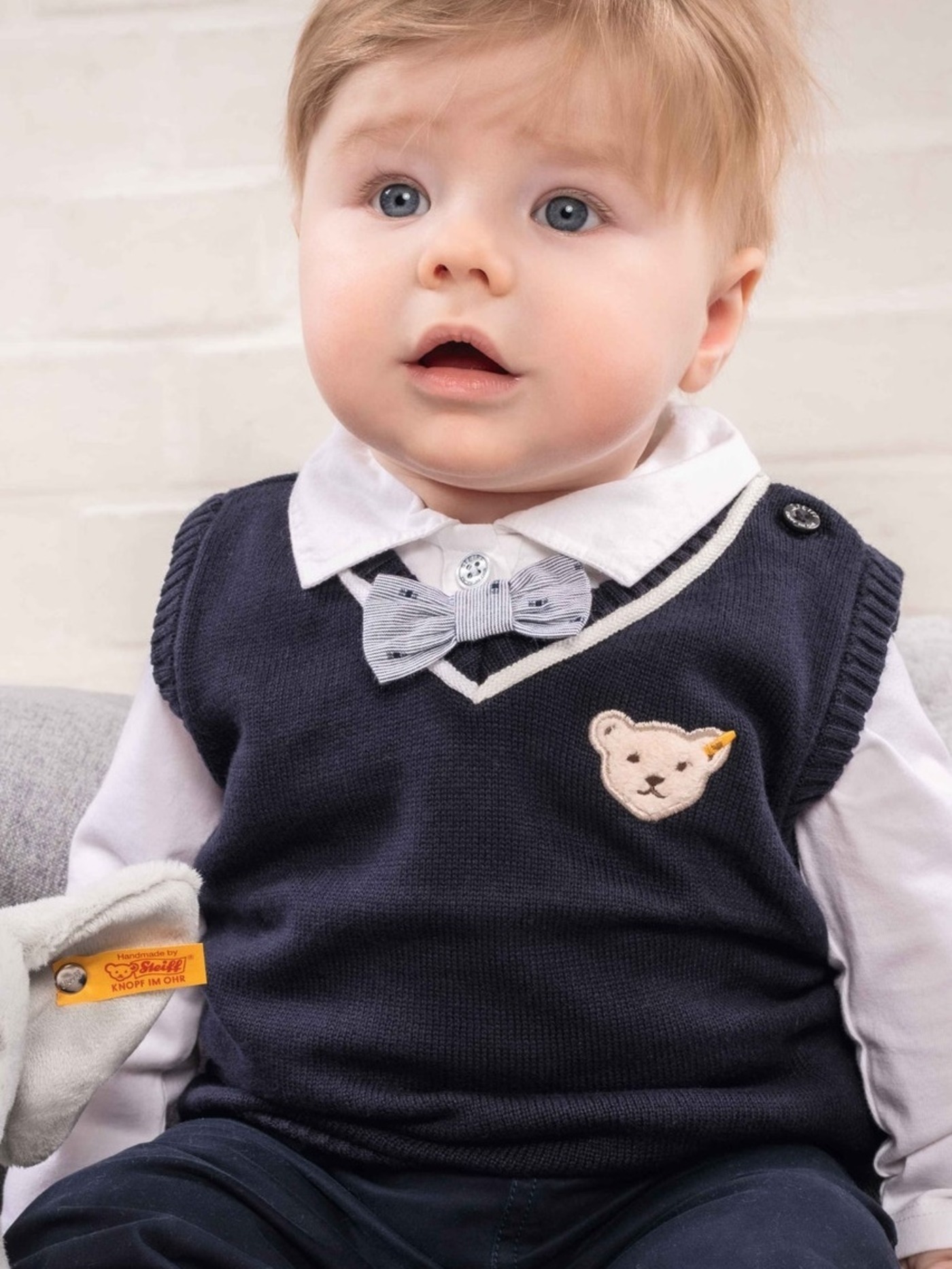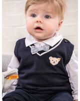 Pretty sweater in dark blue for boys by STEIFF from the Special Day collection. The ribbed cuffs on the neckline, sleeves and hem make the tank top a great eye-catcher. The fluffy STEIFF bear adorns the left breast. Whether combined with a shirt or T-shirt - you will always make a good choice with this favorite piece.