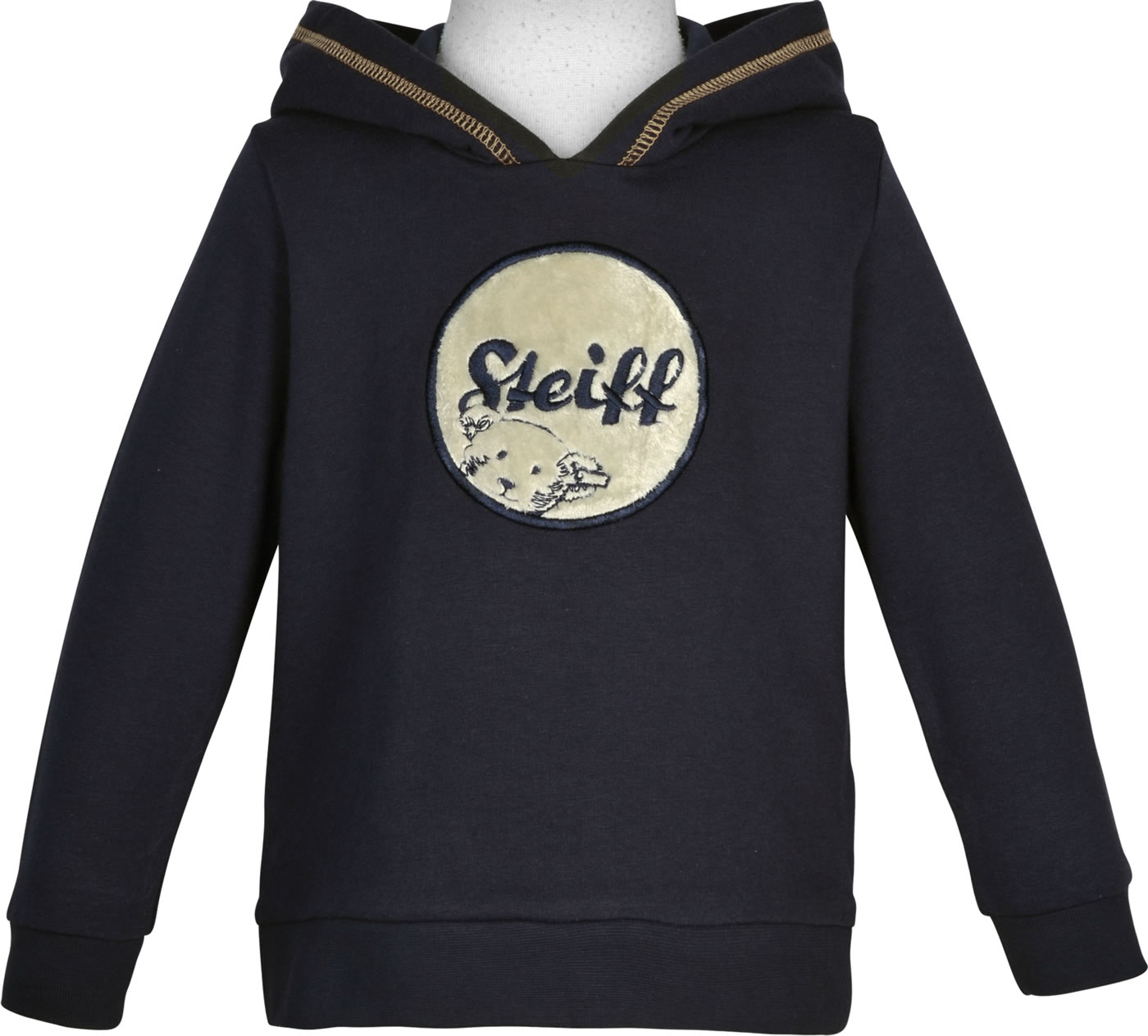 Warm and comfortable sweat shirt with hood from the Forest Friends collection by STEIFF for boys. The inside of the sweatshirt is roughened and is therefore particularly cuddly. The large Steiff patch on the front is a great detail. Color-contrasting seams create a nice contrast. The hood is lined with soft jersey material.