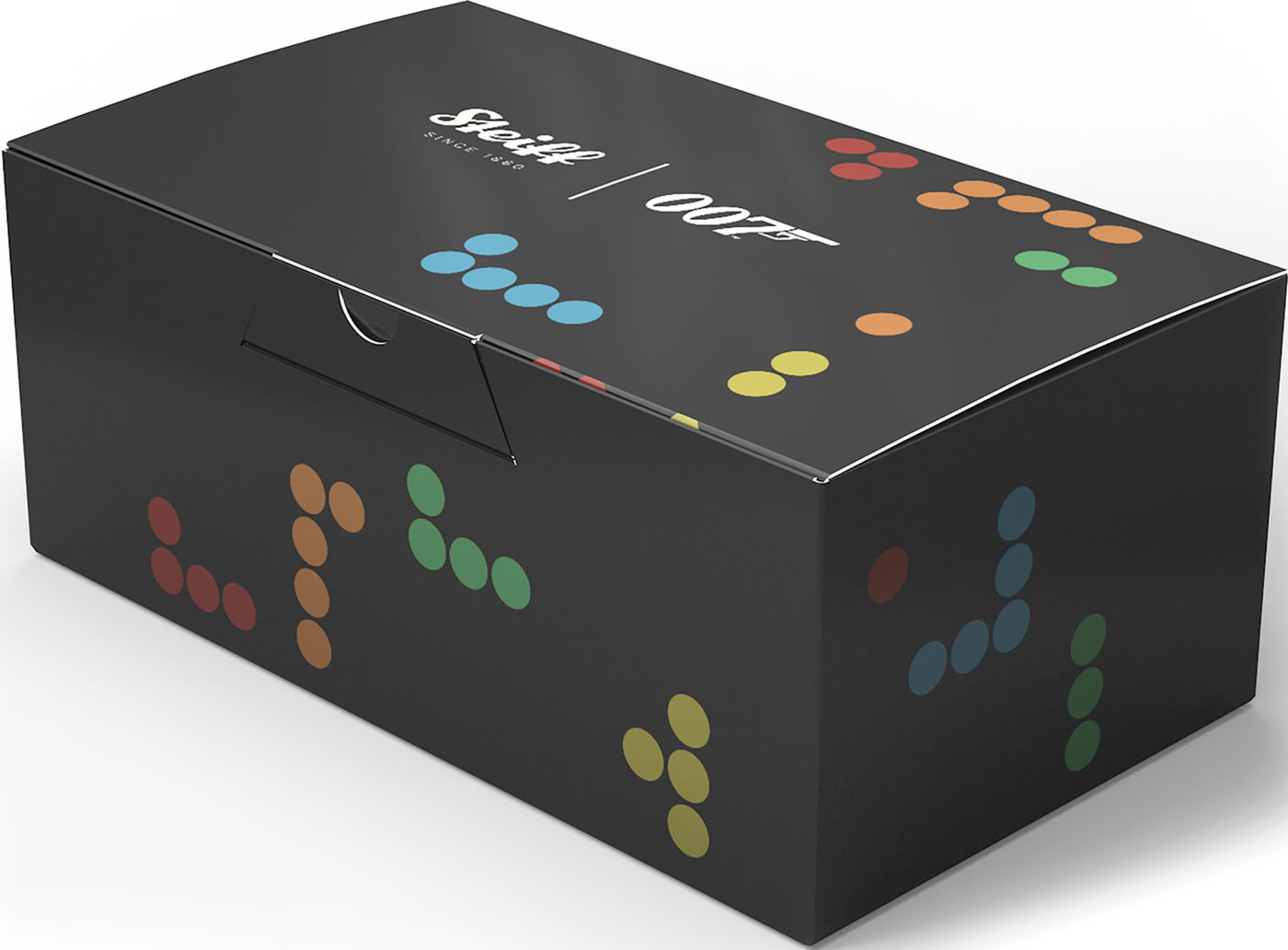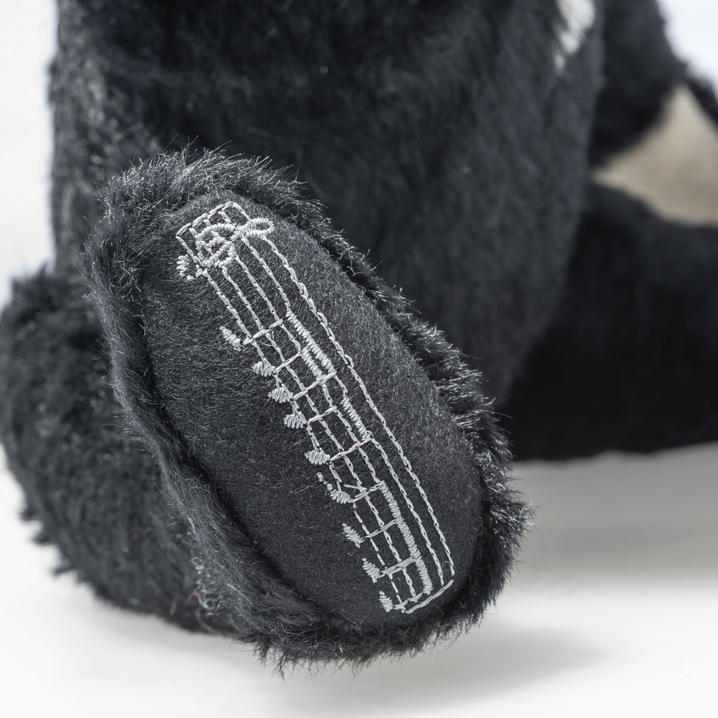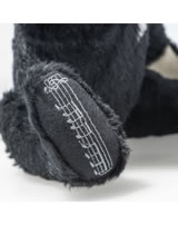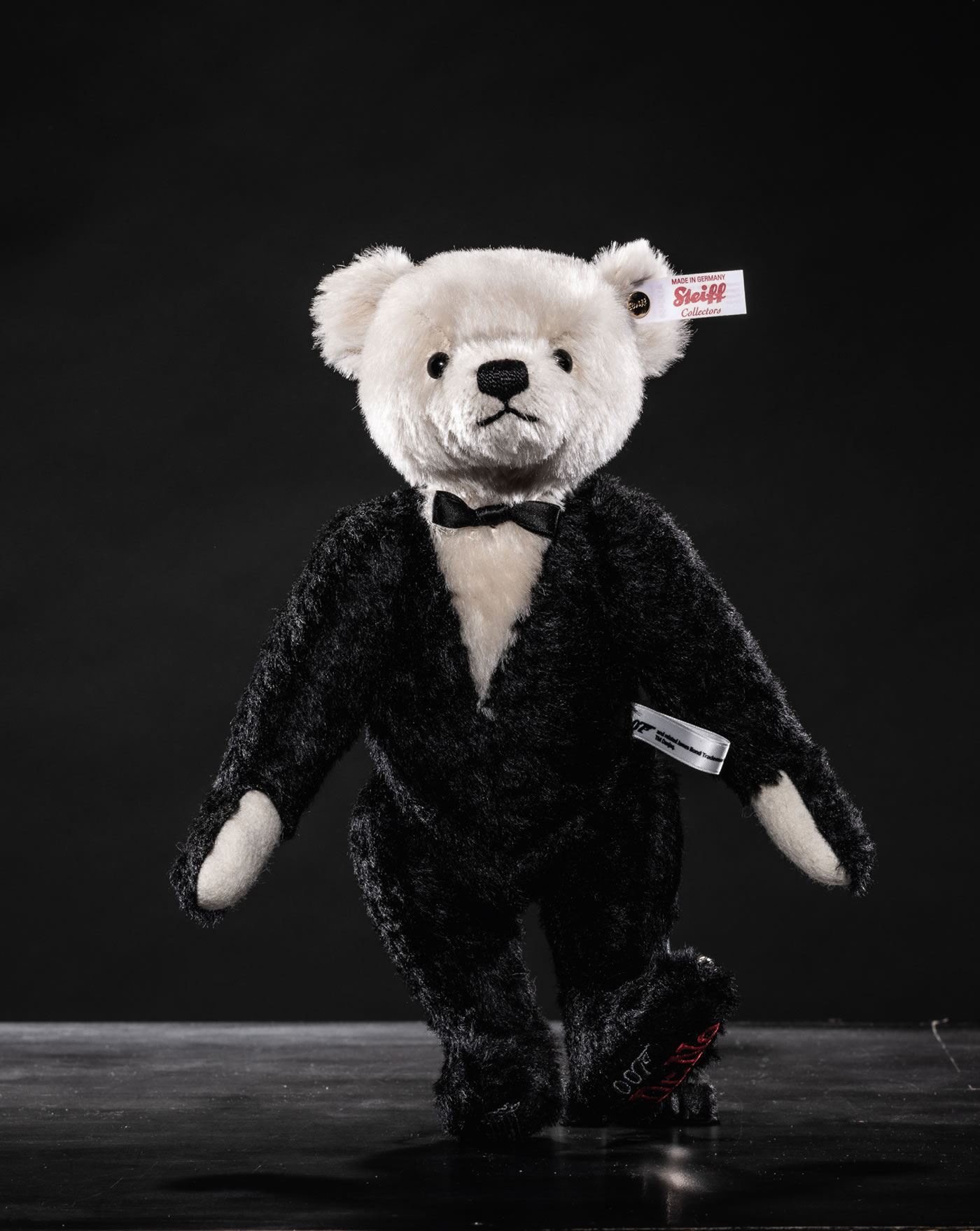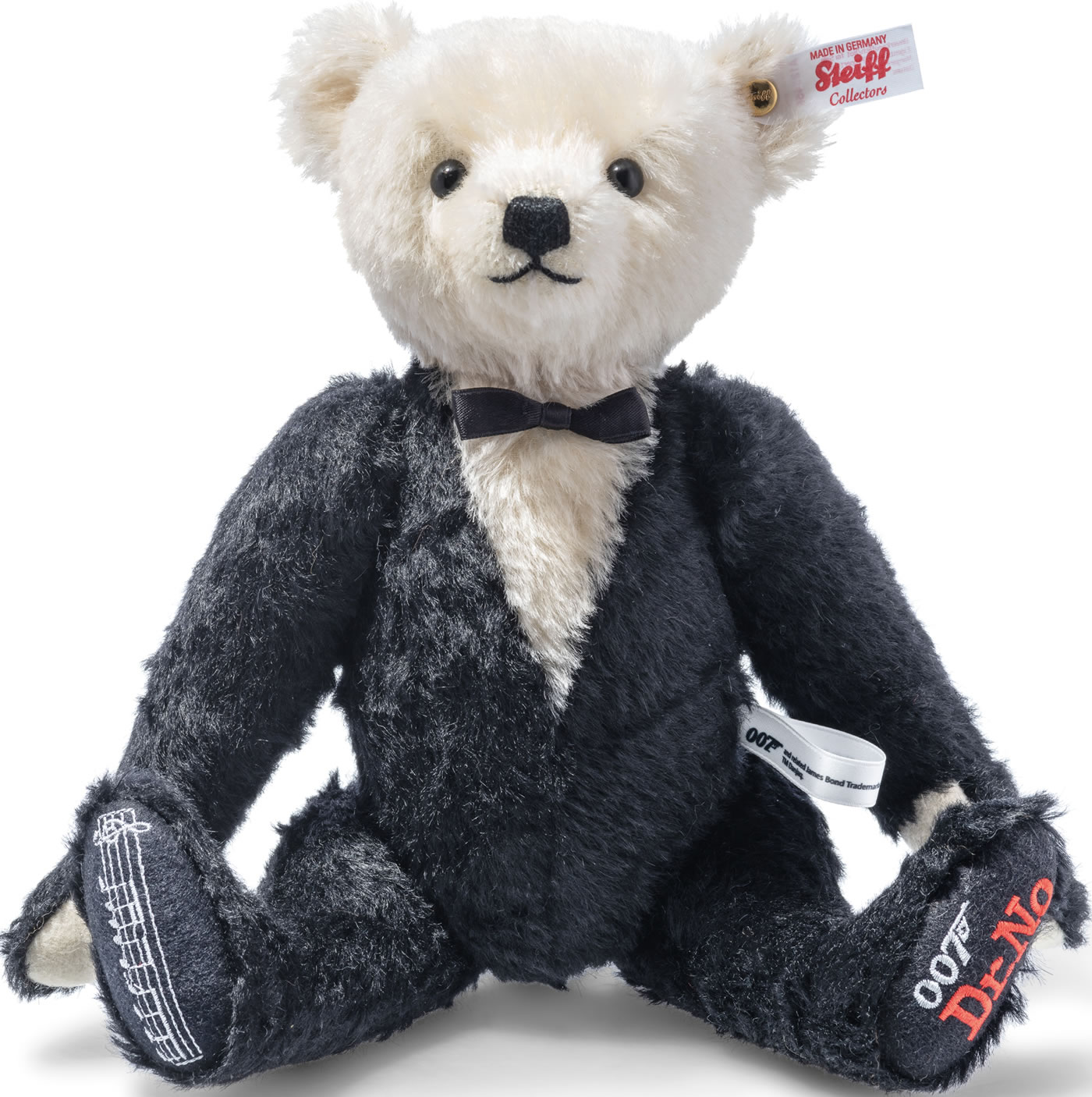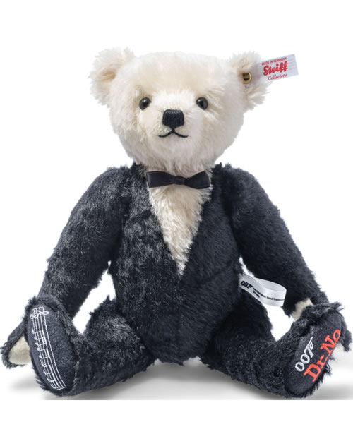 Bond, James Bond. This unique musical teddy bear plays one of the most famous tunes in the world, the iconic 007 theme tune. As the real protagonist, our Bond bear is impressively dressed in his mohair jacket with a perfectly fitting bow tie. His left sole is striking red with an embroidered 007 and Dr. No logo decorated in homage to the first film in the series (1962). © EMI United Partnership Ltd. o/b/o Norman Monty.