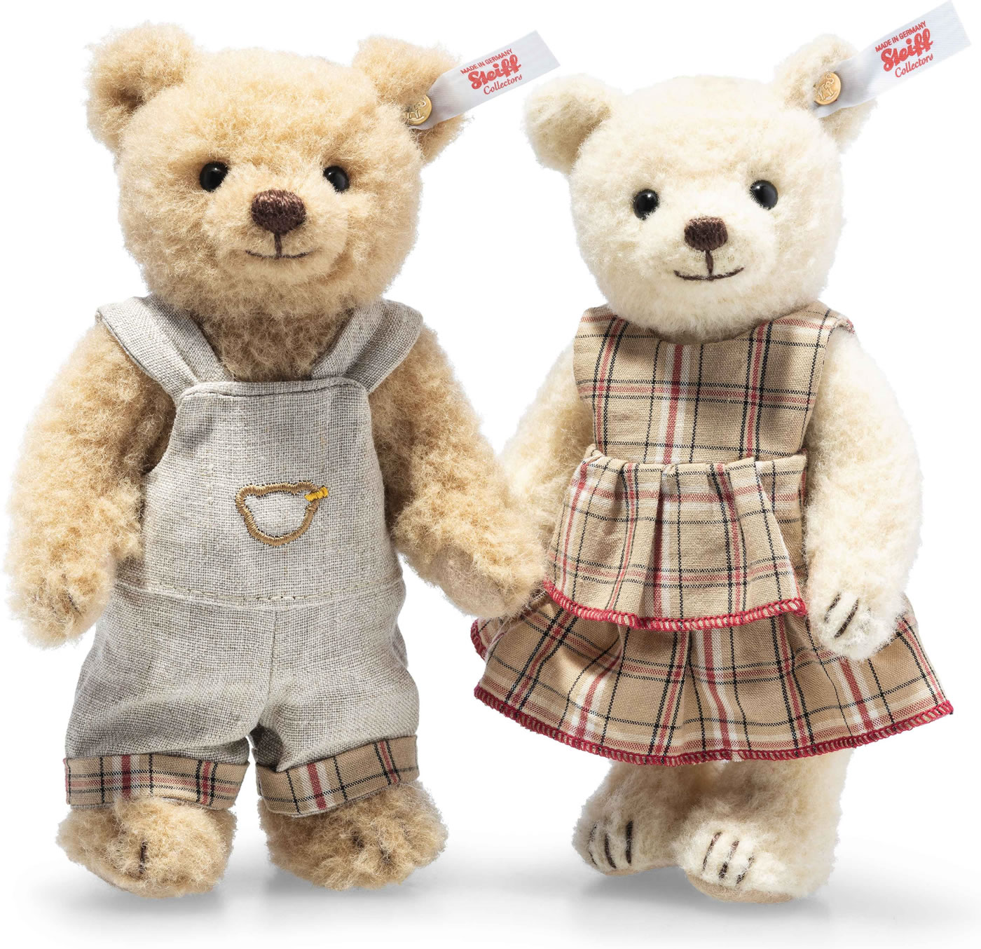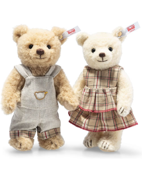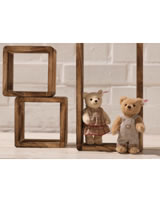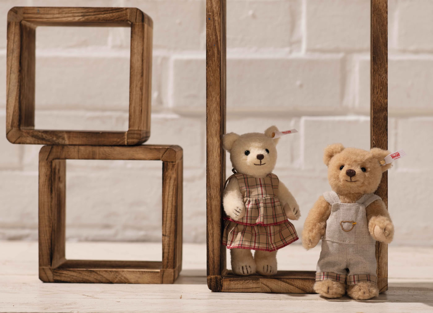 Steiff invented the Teddy bear in 1902. To mark the year of the Teddy bear, Steiff are enormously excited to introduce the Steiff Teddy bear family. Here you can enjoy them as Limited Editions. But please look at the family in our Children’s range of soft toys. Young or old the family are certain to delight. Big brother Ben is an adventurous little chap always on the lookout for his little sister Mila whose fearless curiosity can often get her in a pickle. Both made from wool plush which lends itself perfectly to their youthful charm. Ben 3-ways jointed wears his Steiff dungarees and Mila 5-ways jointed her ruffled dress, both with matching check-fabric details to complete the family set.