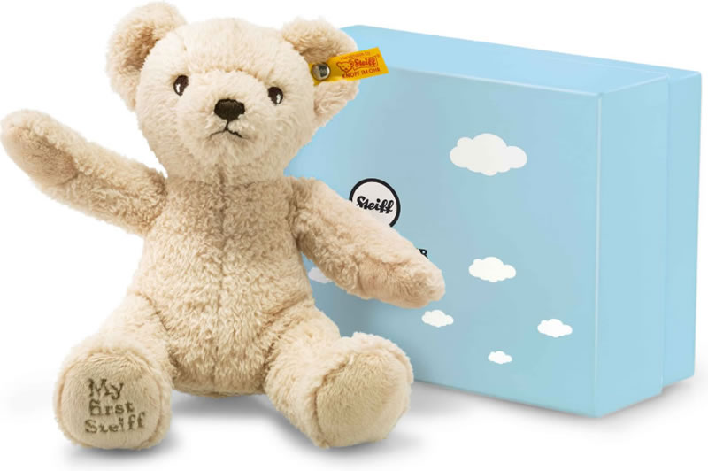 With a 24 cm My first Steiff Teddy bear you not only give your child a cuddly Teddy to snuggle and love but also a real friend for life. Embroidered "My first Steiff" logo under the right paw. As a reminder of the first Steiff Teddy bear. A practical feature: the blue gift box.