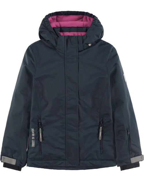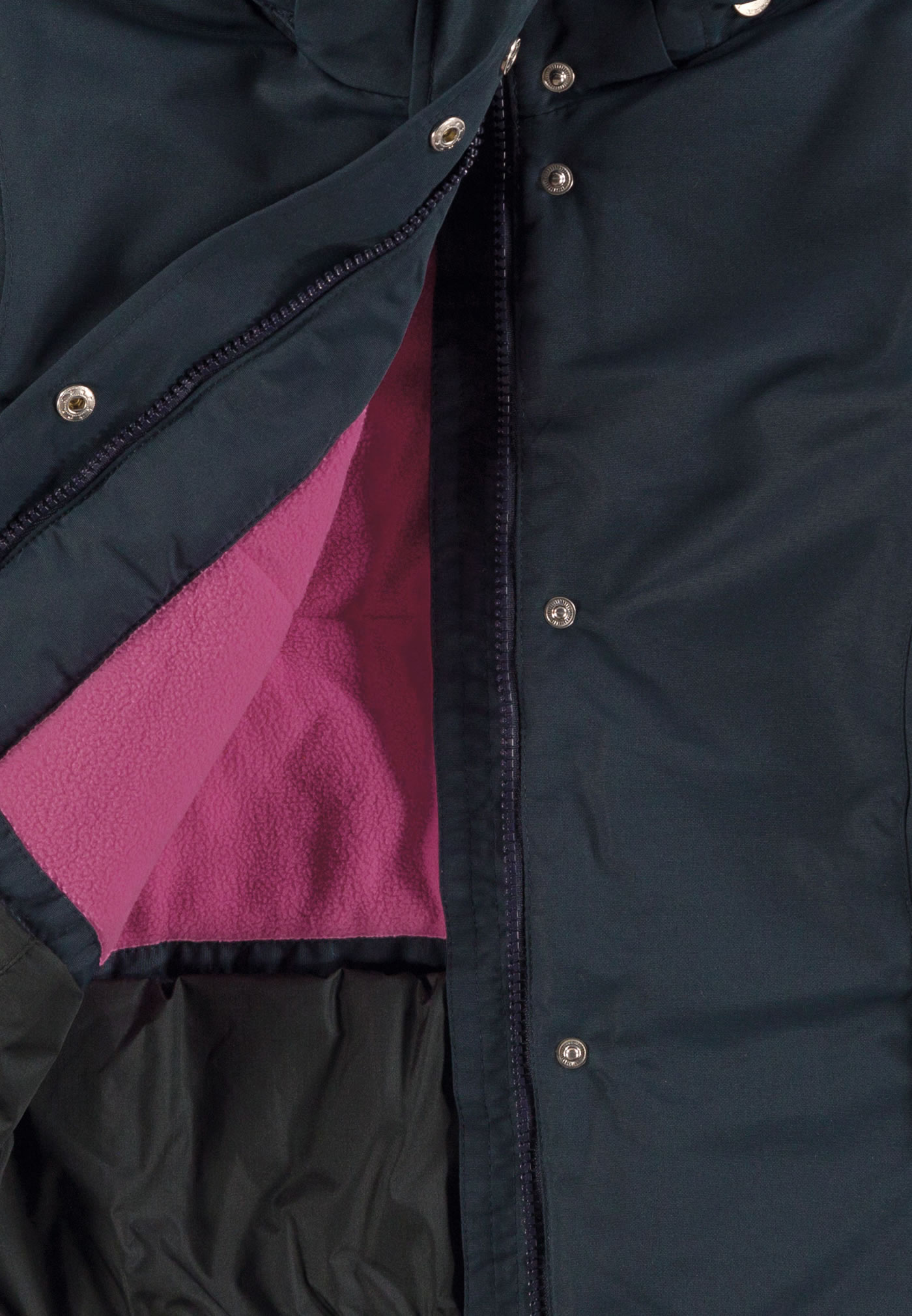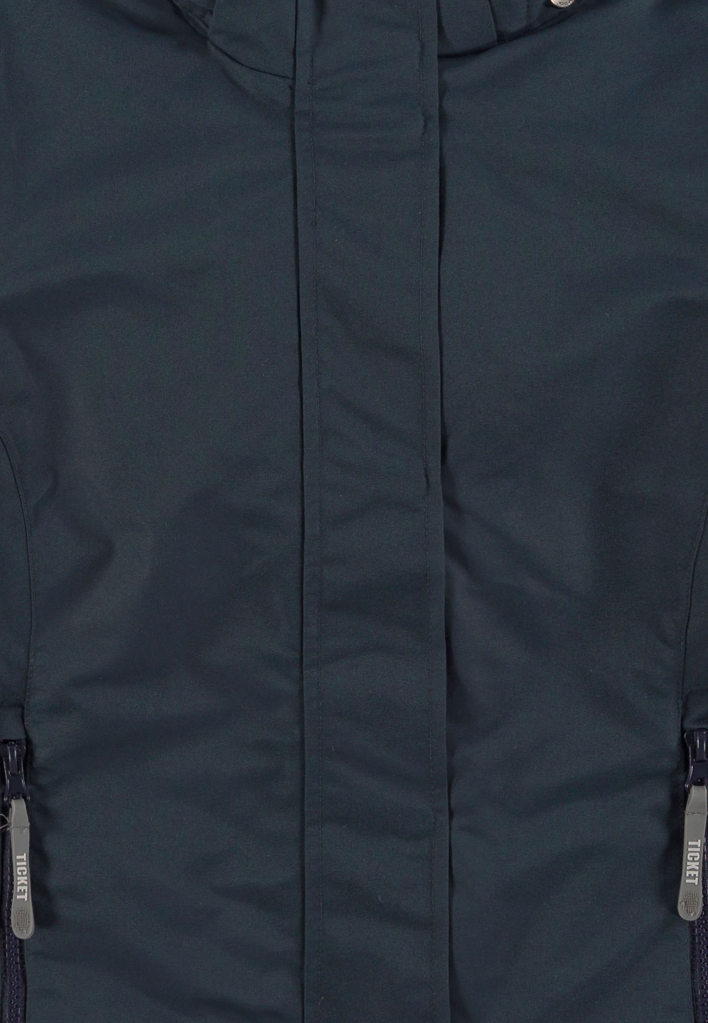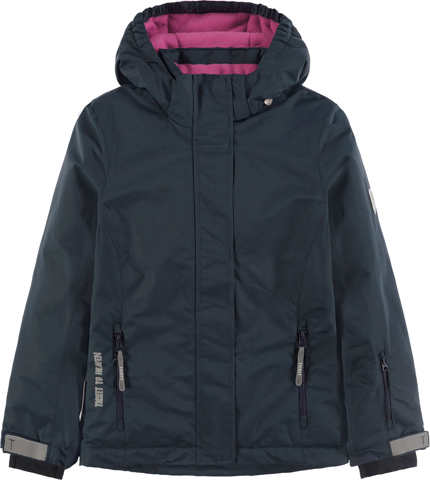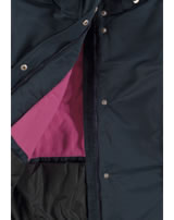 Awesome, straight-cut jacket in dark blue with button-down, lined hood for girls by TICKET TO HEAVEN. From inside she is lined with warm fleece in pink. Cuffs provide a secure fit, the sleeves can be adjusted thanks Velcro in the width. Two zippered pockets offer space for small treasures. The chin guard provides protection against pinching in the zipper and reflective elements ensure good visibility. The jacket is pleasantly light in weight and also wind and waterproof.