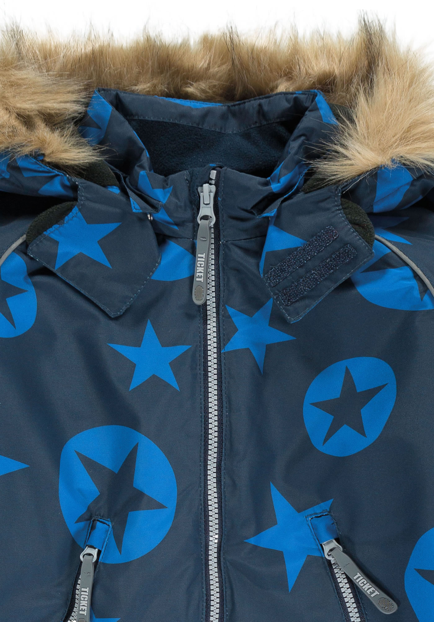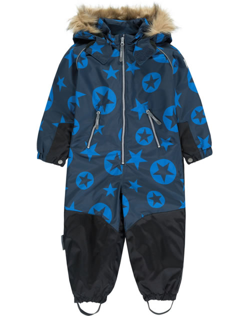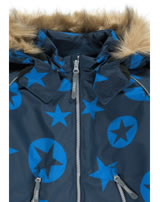Warm, breathable snowsuit in blue and black and great star print by TICKET TO HEAVEN for boys. The overall is windproof and waterproof and has adjustable cuffs in the width. The hood with fur trim can be unbuttoned. The inside is warm lined and the legs have buttoned footbridges, so everything stays where it belongs. The long zippers allow easy on and off. Reflective details provide the necessary visibility on dull days. Skiing, sledging ... or simply long gameplay in the snow - this snowsuit is suitable for demanding activities. So nothing stands in the way of extensive winter fun!