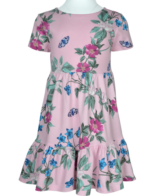 Summer dress with short sleeves and a pretty round neckline by TOM JOULE. The flounces give the dress a wide cut and plenty of freedom of movement. The soft jersey material ensures a high level of comfort. The little Joules rabbit is embroidered to the left.