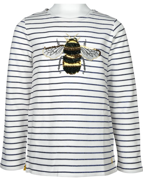 Blue and white striped t-shirt for girls by TOM JOULE with long sleeves. The bee made of glittering sequins on the front is particularly beautiful. The soft material ensures a high level of comfort.