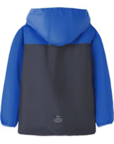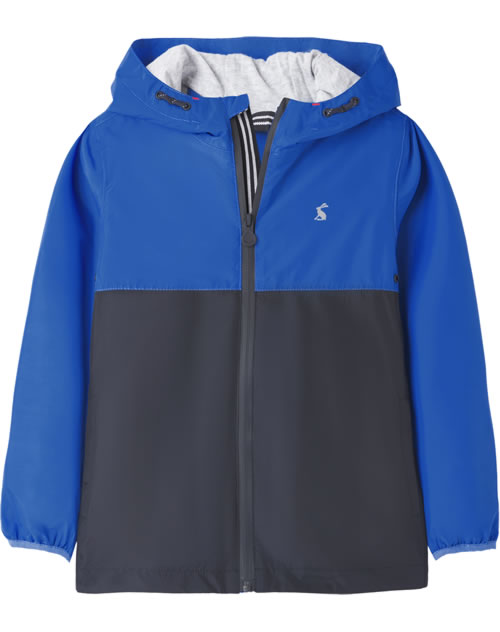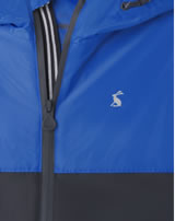 A blue waterproof rain jacket for boys by TOM JOULE. The jacket with a fixed hood, lined with soft cotton jersey, is indispensable on gray and rainy days. The seams are sealed so that no moisture gets into the material. The jacket is easy to stow away as it can be packed into an inside pocket. Two pockets with Velcro provide space for small treasures.