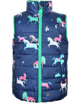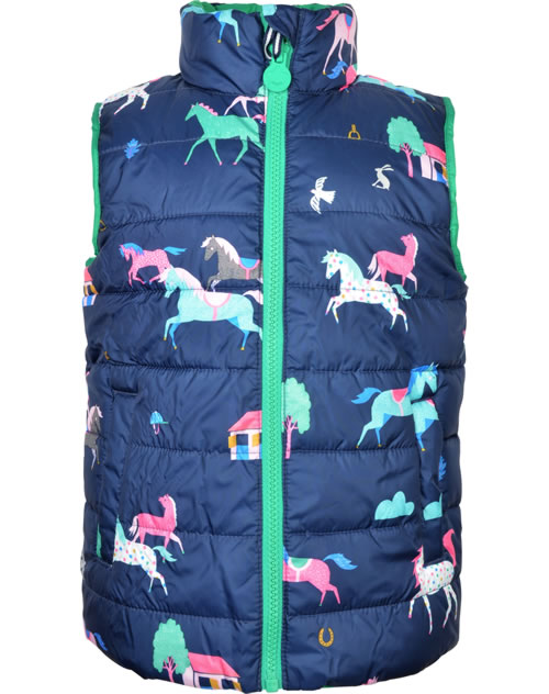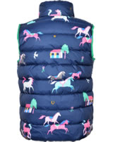 High-quality reversible quilted waistcoat with stand-up collar for girls by TOM JOULE. The quilted waistcoat can be worn from both sides. On one side it is green and on the other side colorful horses cavort. The padding makes it particularly suitable for cooler days.