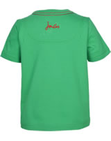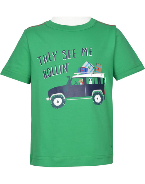 Green shirt with short sleeves and a cool jeep motif by TOM JOULE for boys. The small TOM JOULE rabbit logo is on the lower left corner on the front.