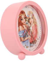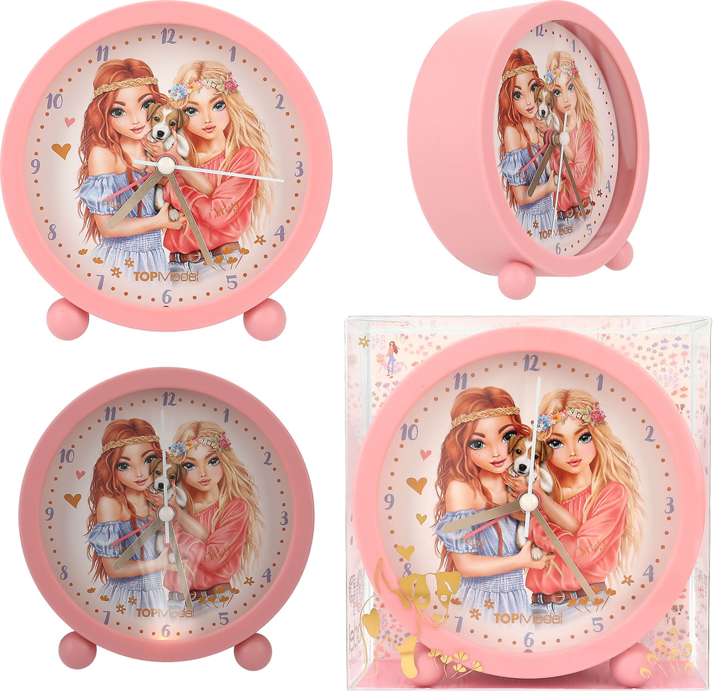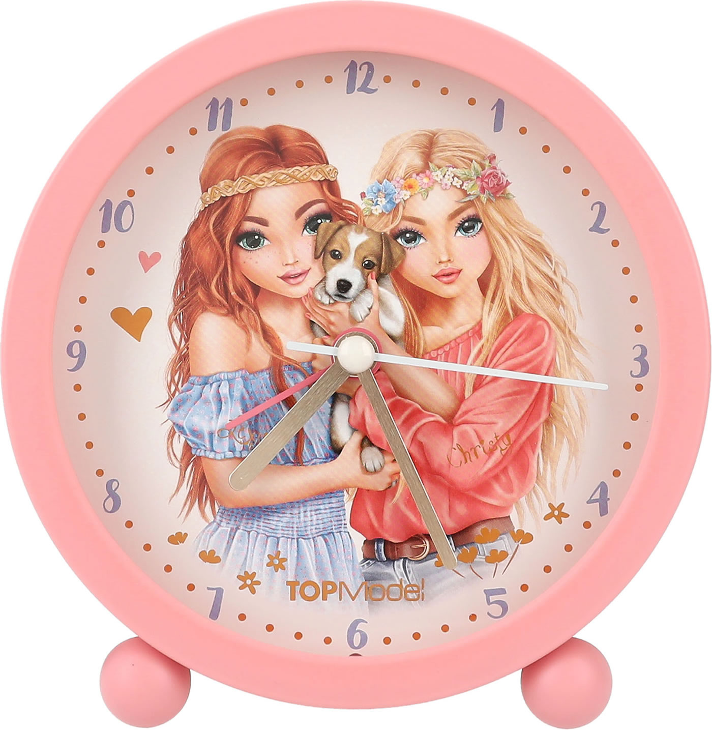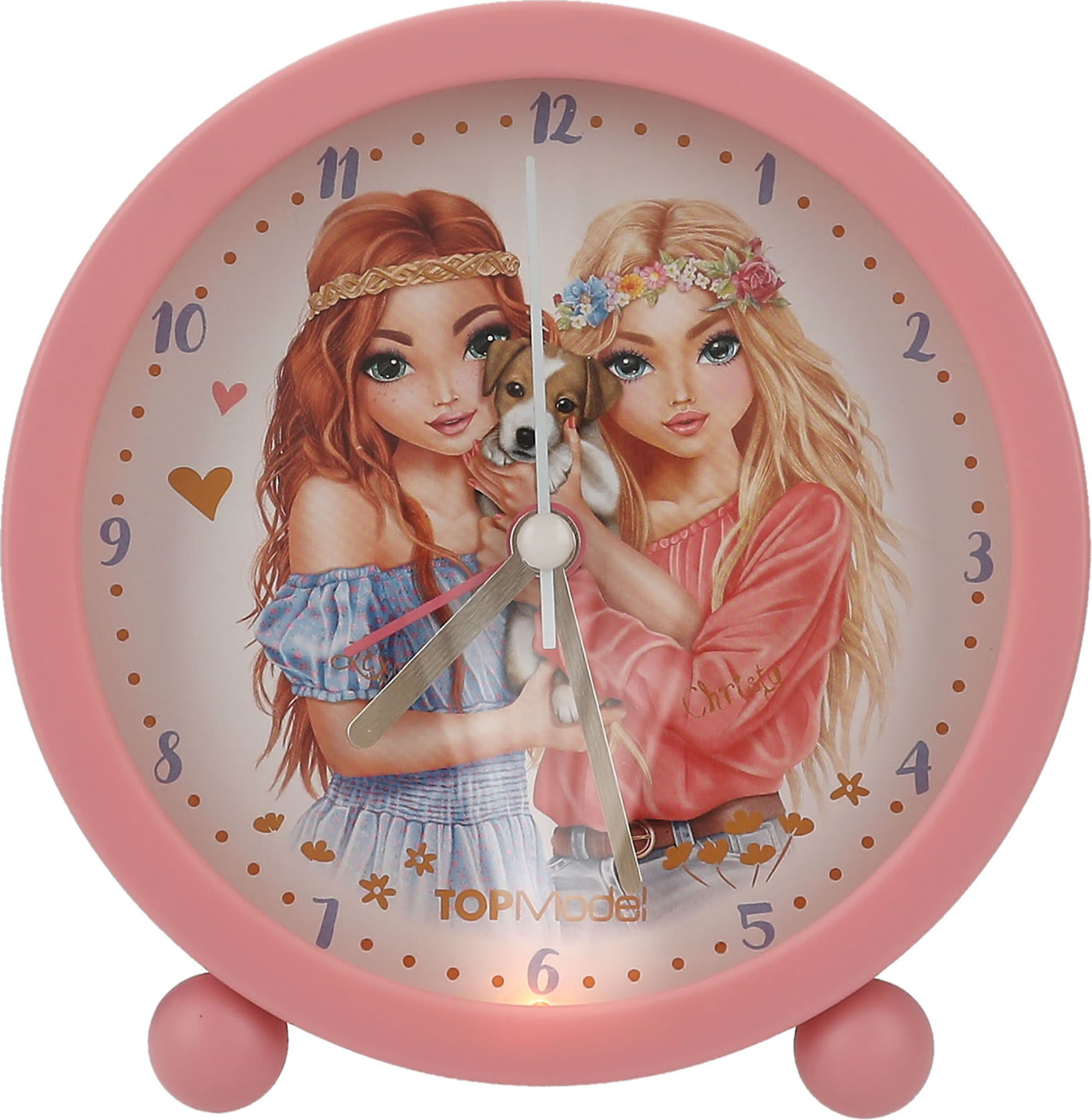 It's time for TOPModel! The round, old pink alarm clock has two stylish models and a cute little dog on the clock face. With a practical light function and silent hands. Battery (1 AA 1.5 V) included and replaceable. Diameter: approx. 11.5 cm