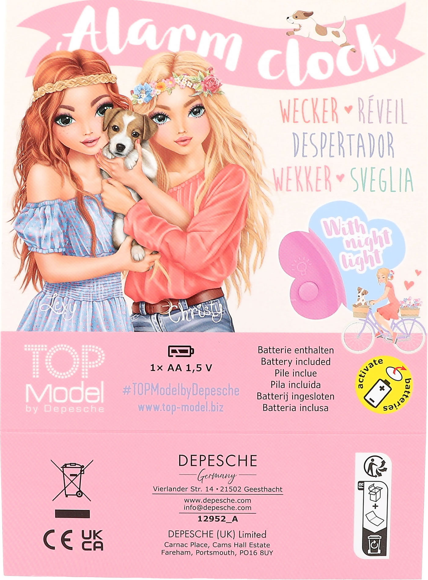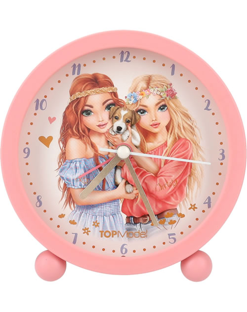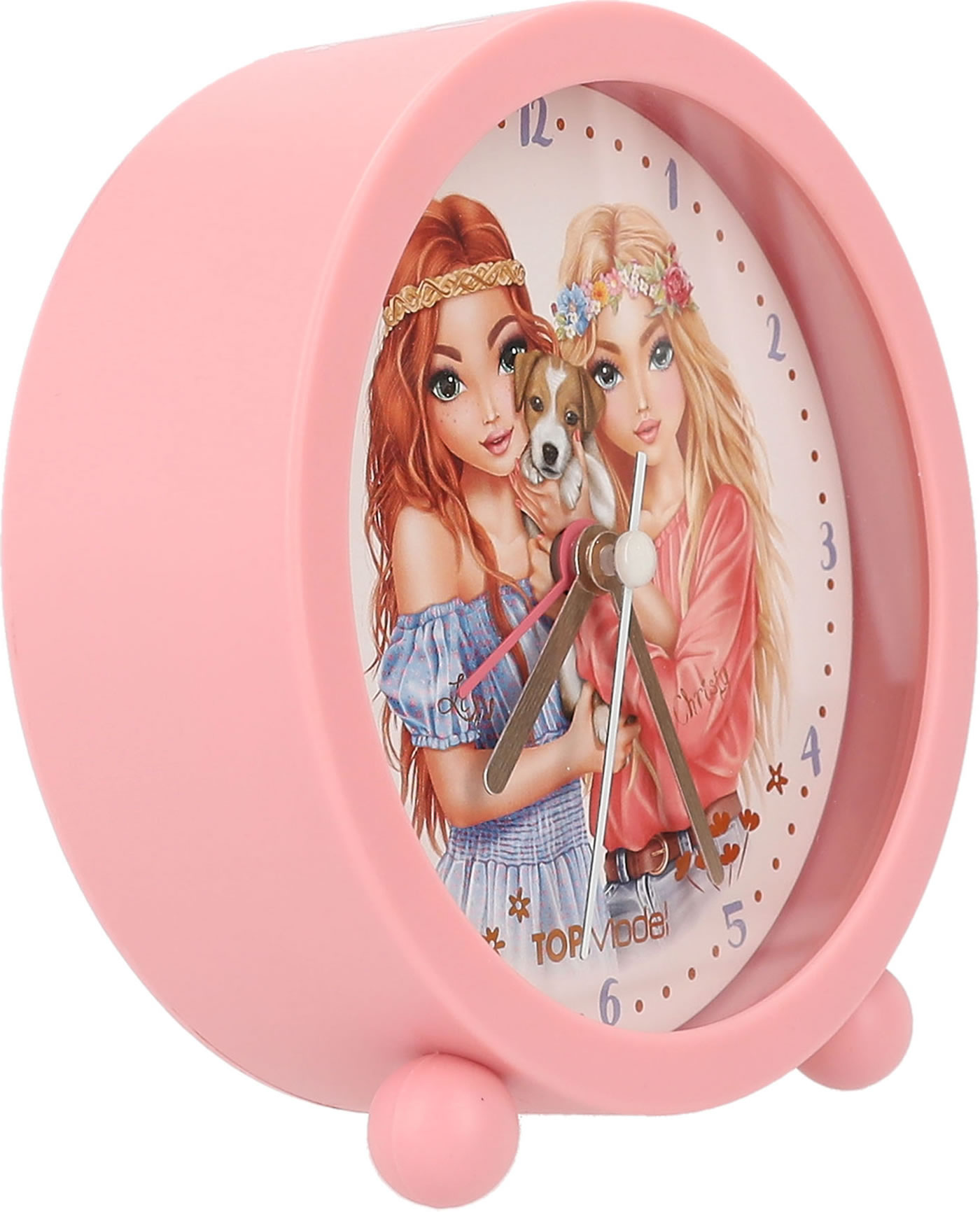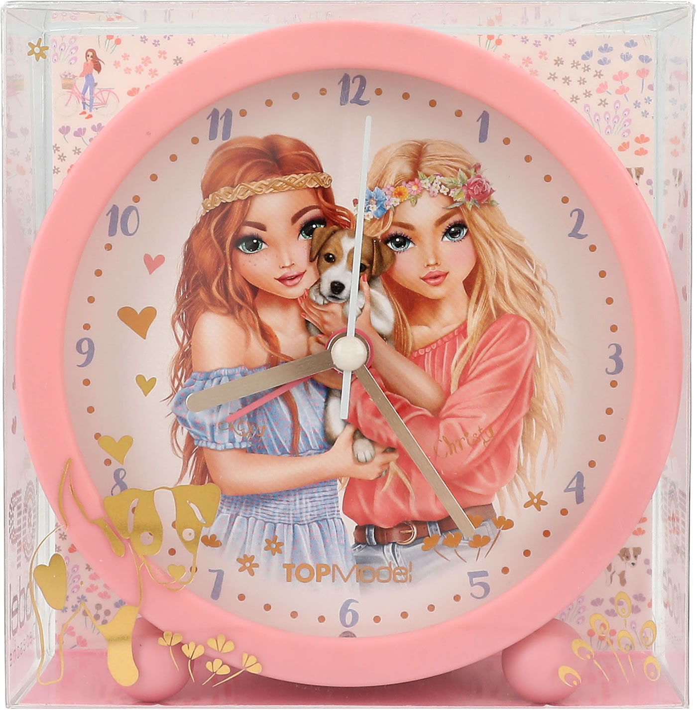 It's time for TOPModel! The round, old pink alarm clock has two stylish models and a cute little dog on the clock face. With a practical light function and silent hands. Battery (1 AA 1.5 V) included and replaceable. Diameter: approx. 11.5 cm