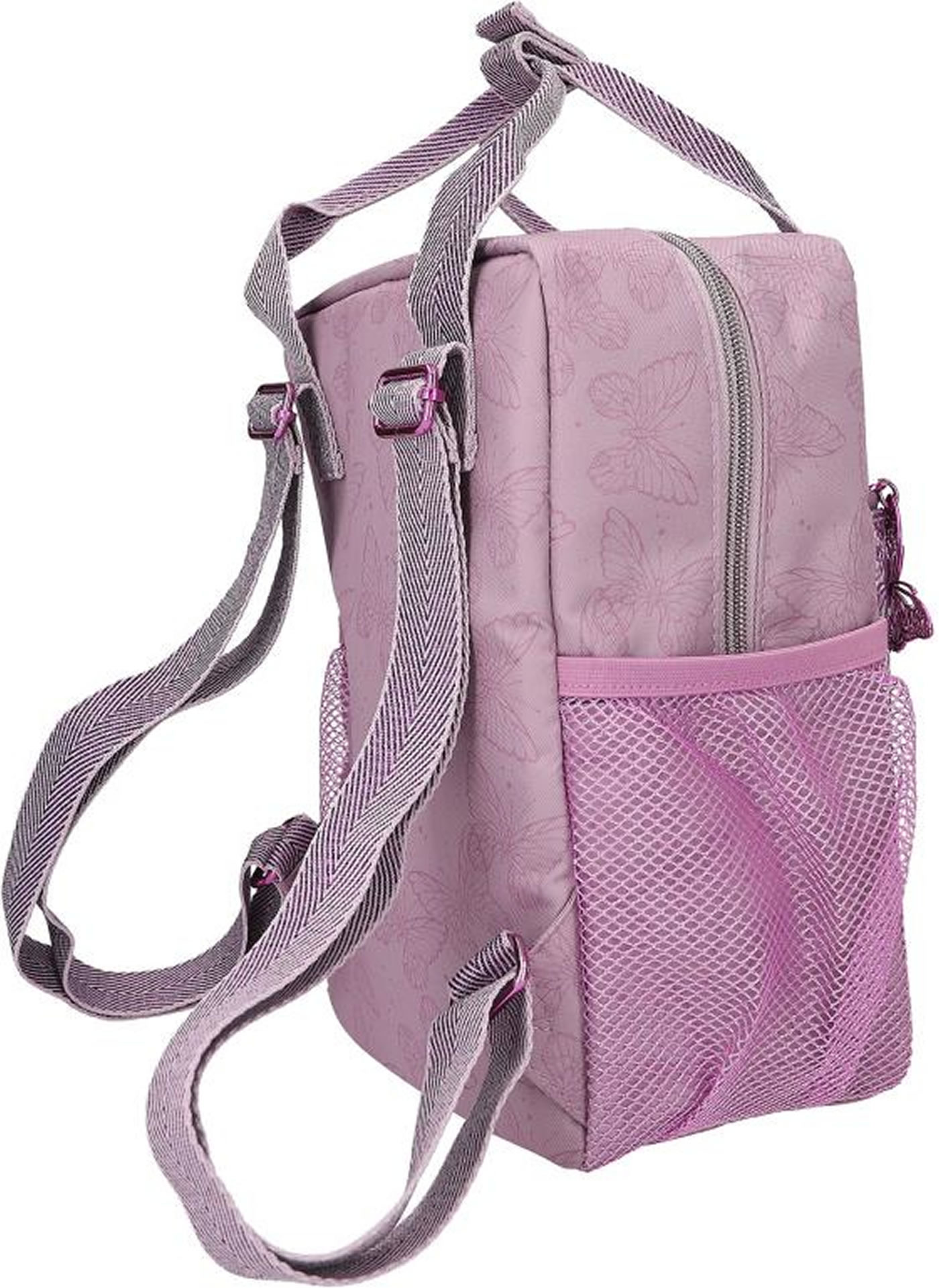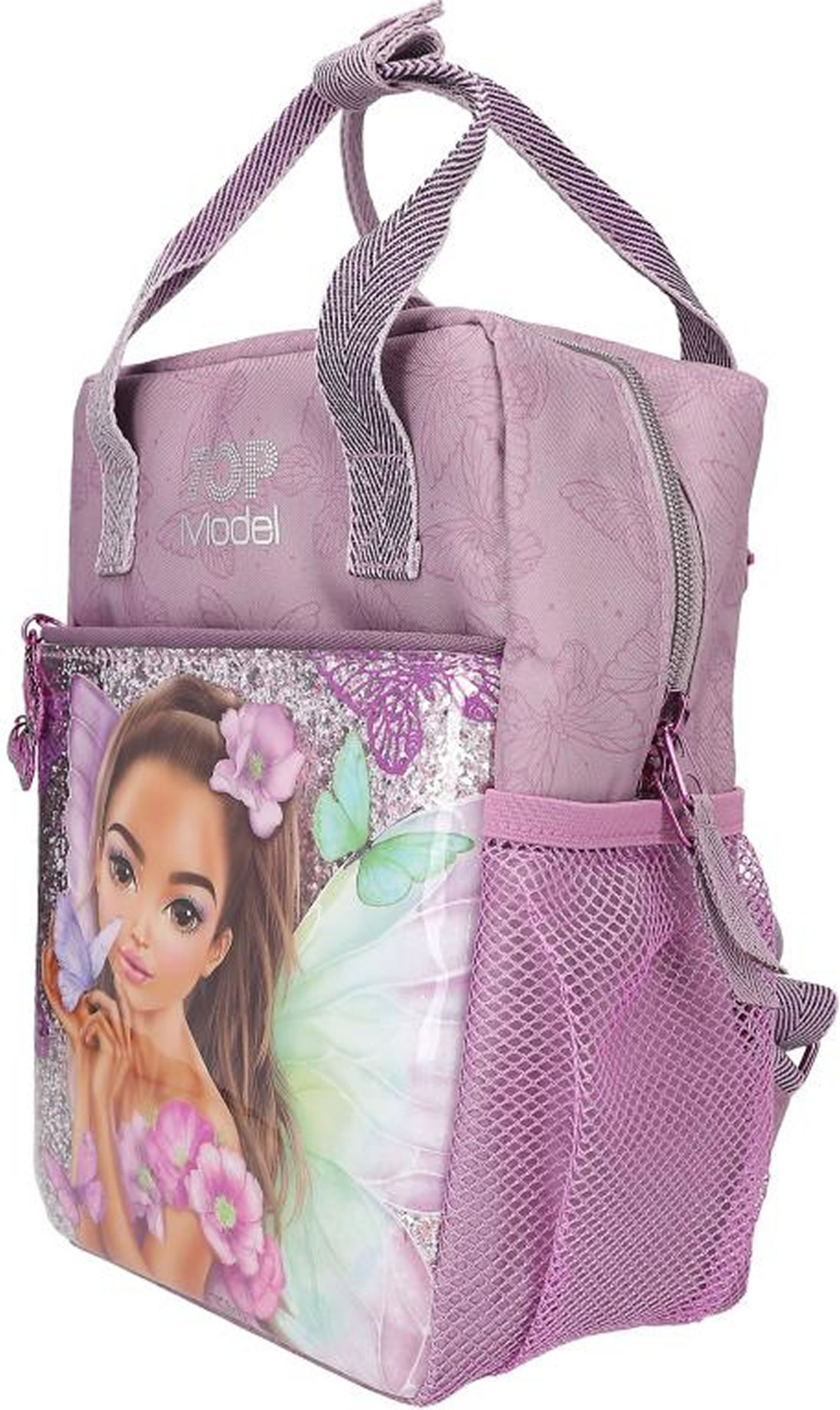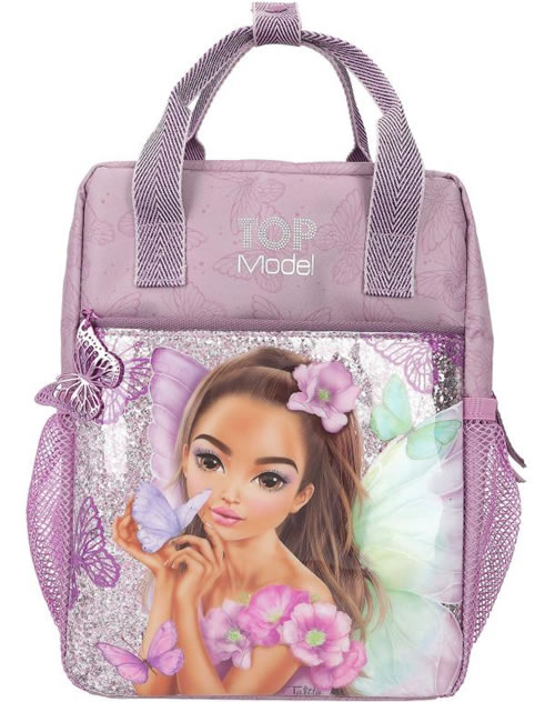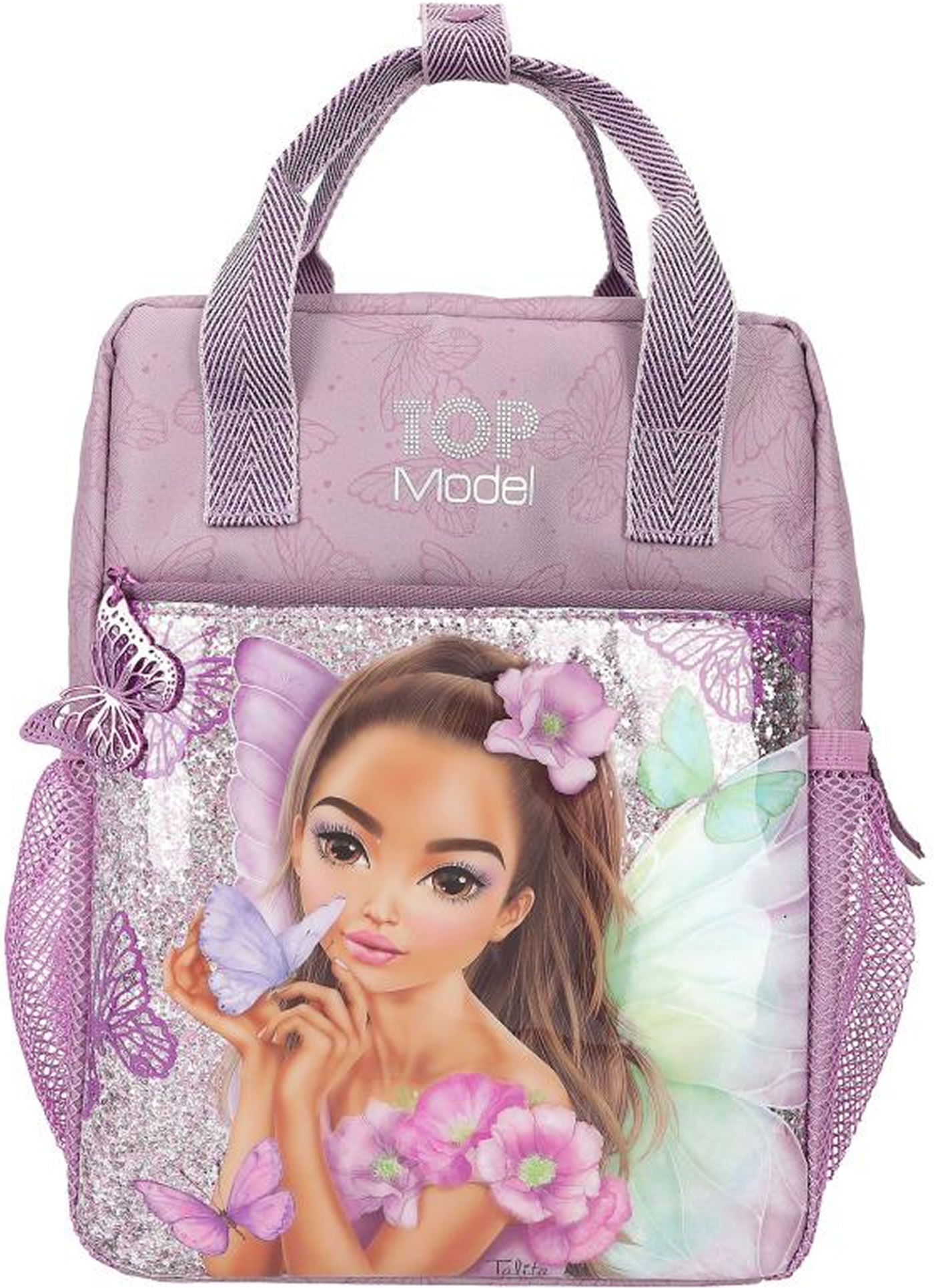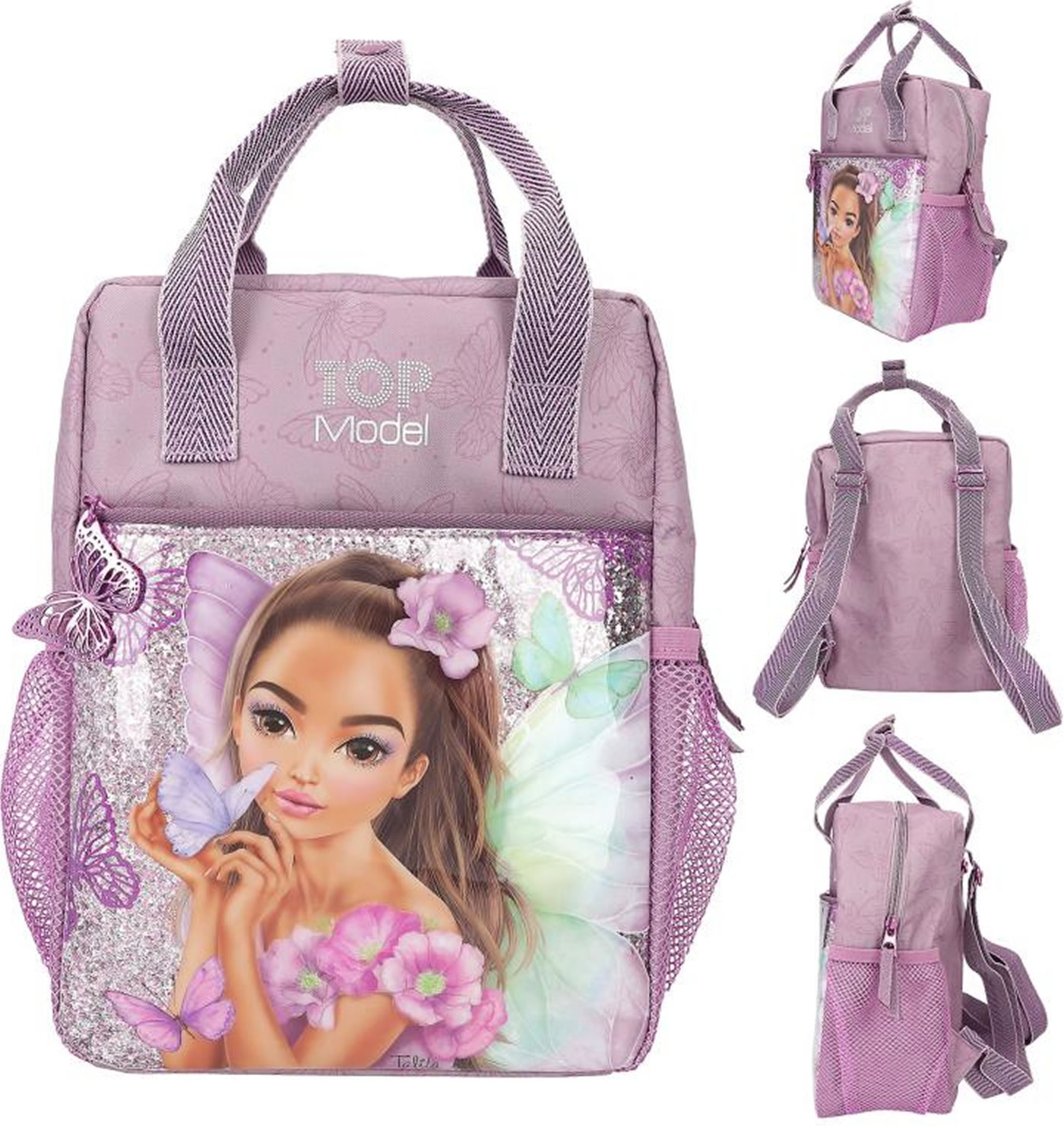 Fairy-fantastic! The mauve-colored TOPModel backpack has a front pocket completely lined with glitter and featuring an imaginative fairy model motif. Fluttering all around: delicate butterflies as patterns, prints and metal pendants on the zipper. The length-adjustable straps and handles have a slightly metallic sheen. Practical: the mesh side pockets and the (key) carabiner in the front pocket.
