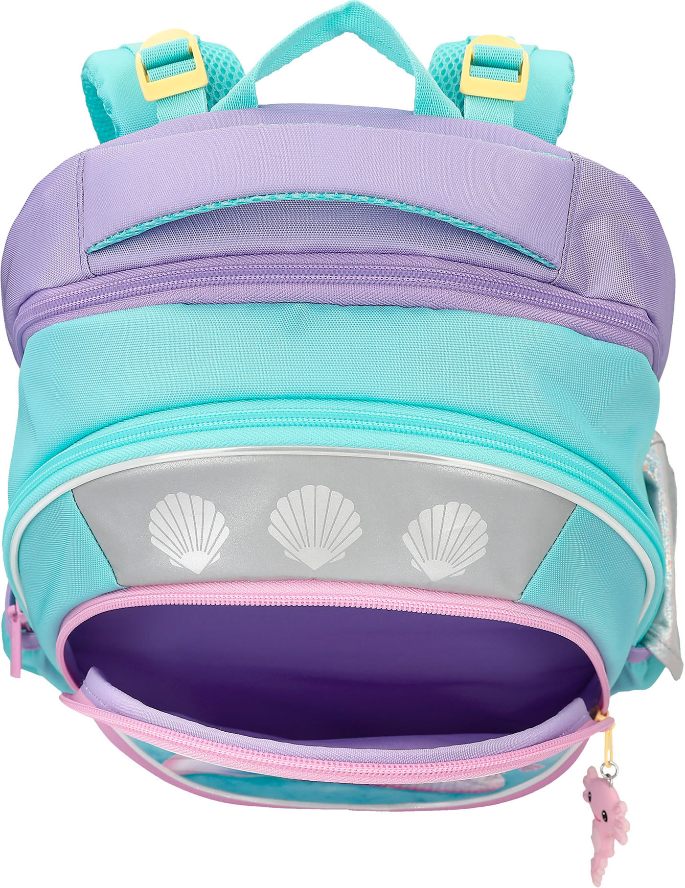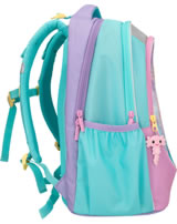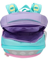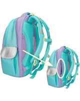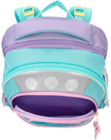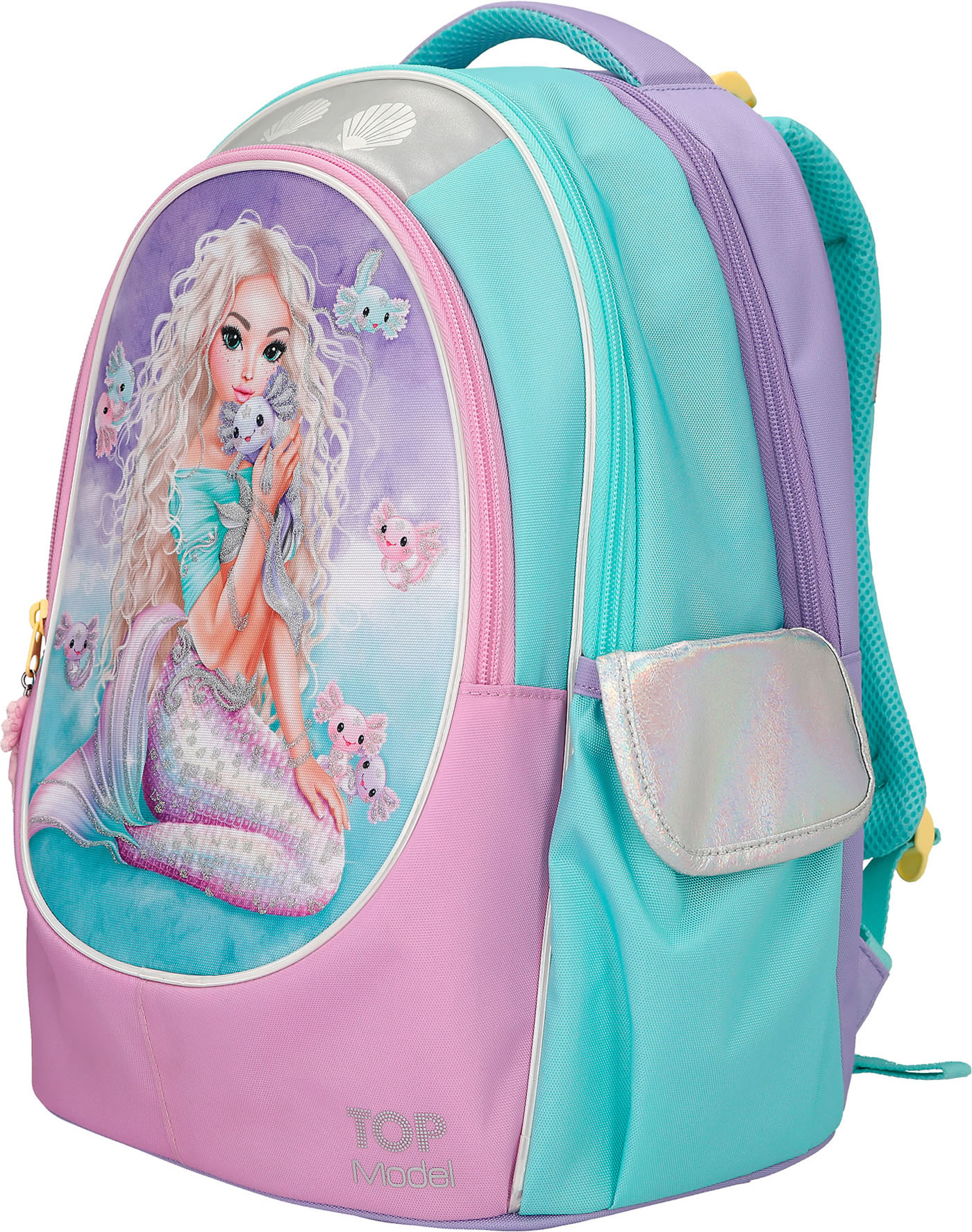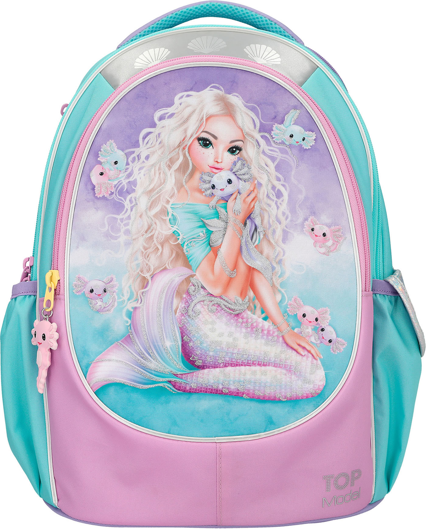An underwater dream: The TOPModel school backpack in bright turquoise, pink and purple has a beautiful mermaid motif with glitter details and cute axolotls on the front.