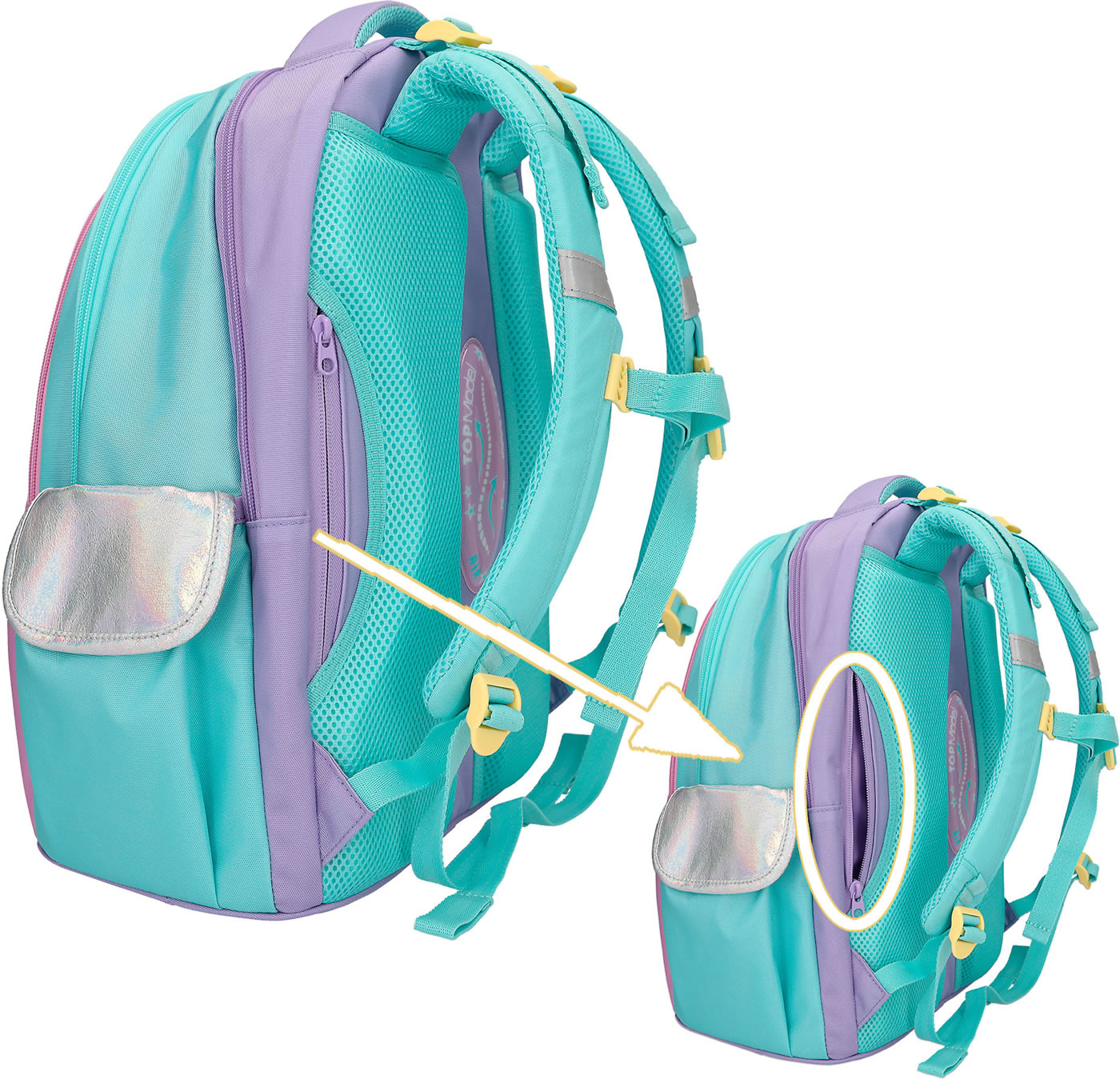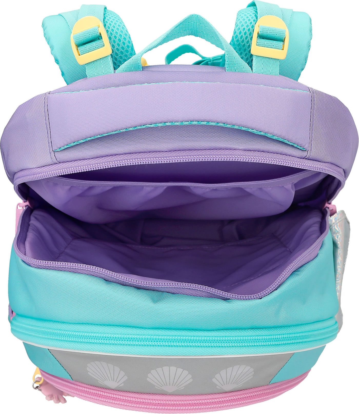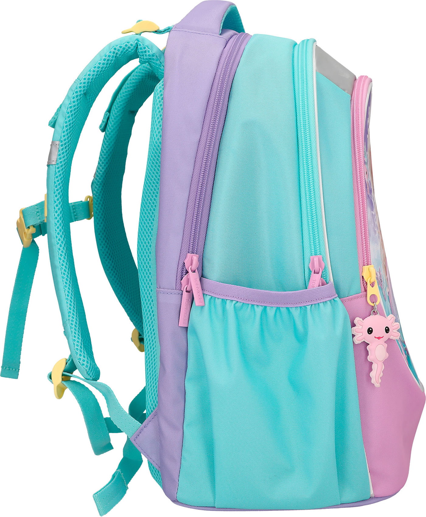 An underwater dream: The TOPModel school backpack in bright turquoise, pink and purple has a beautiful mermaid motif with glitter details and cute axolotls on the front.