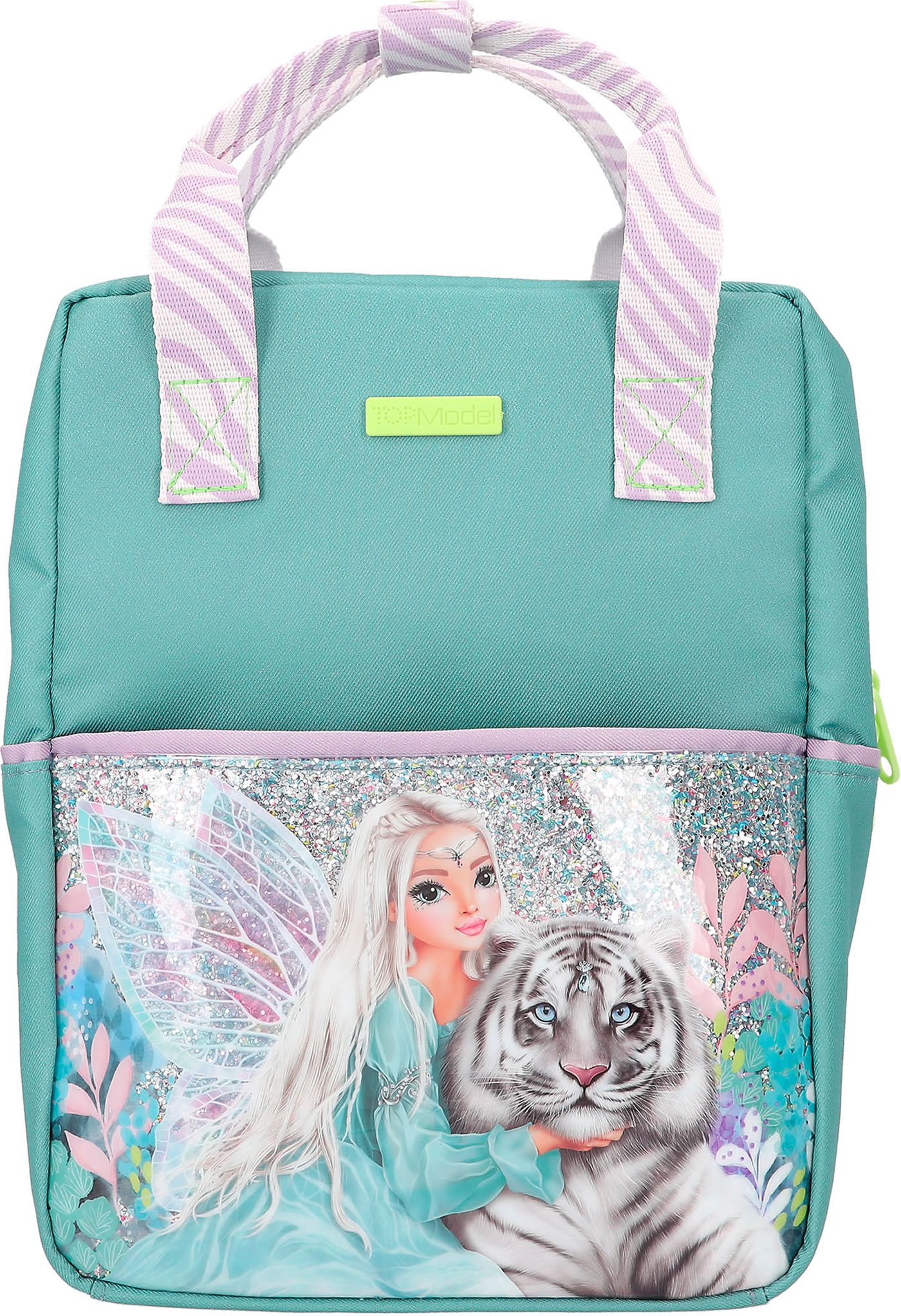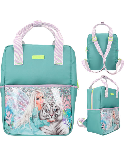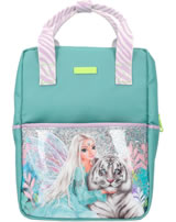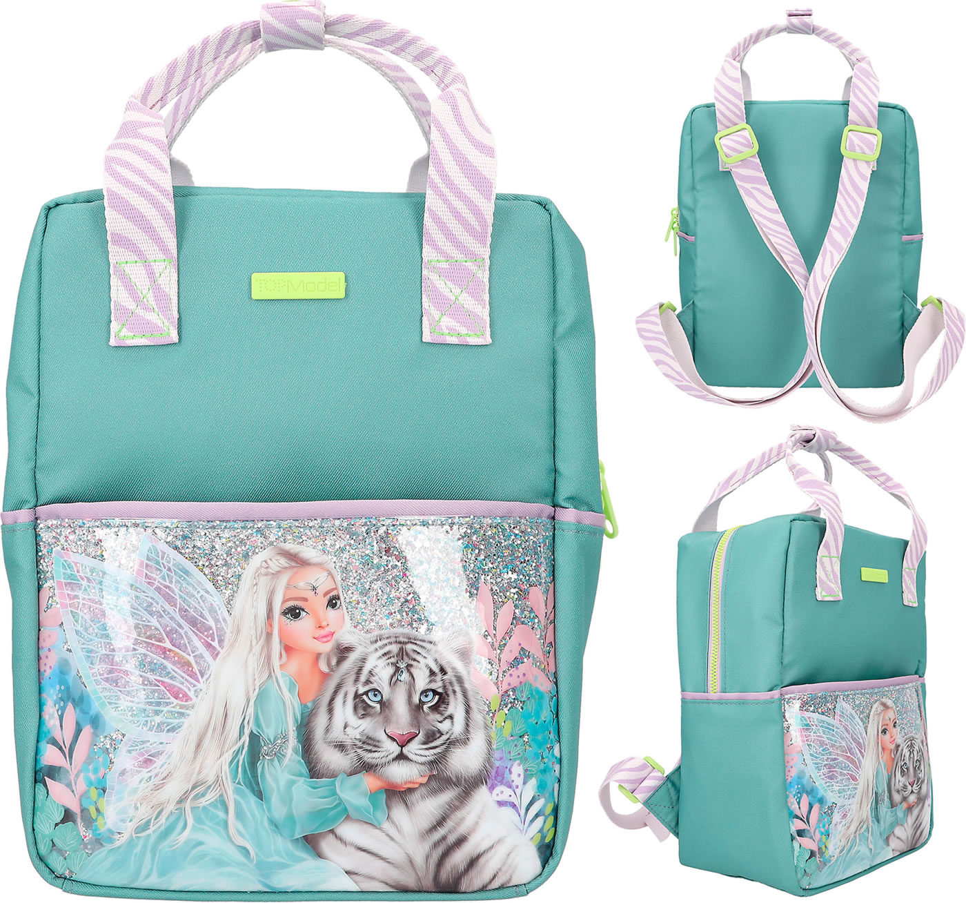 The small backpack in great petrol and lavender tones and with lime-green details has a super glittering front pocket with a cool TOPModel tiger motif. The shoulder straps printed with tiger stripes are adjustable in length, the carrying straps can be connected with a snap fastener. Inside the backpack has a practical carabiner for securely attaching keys.