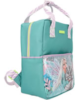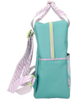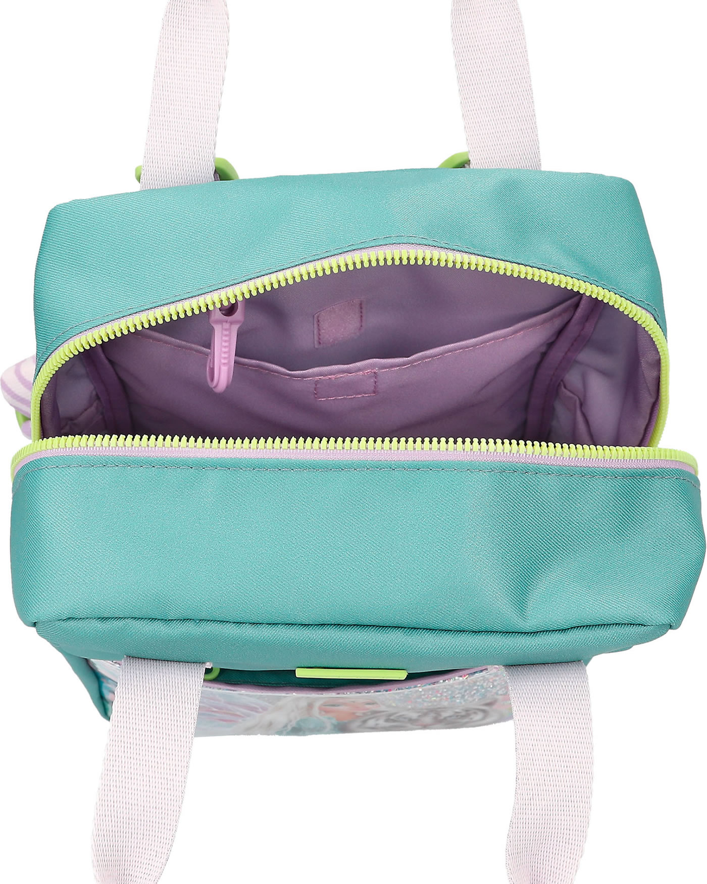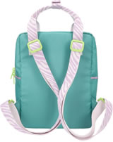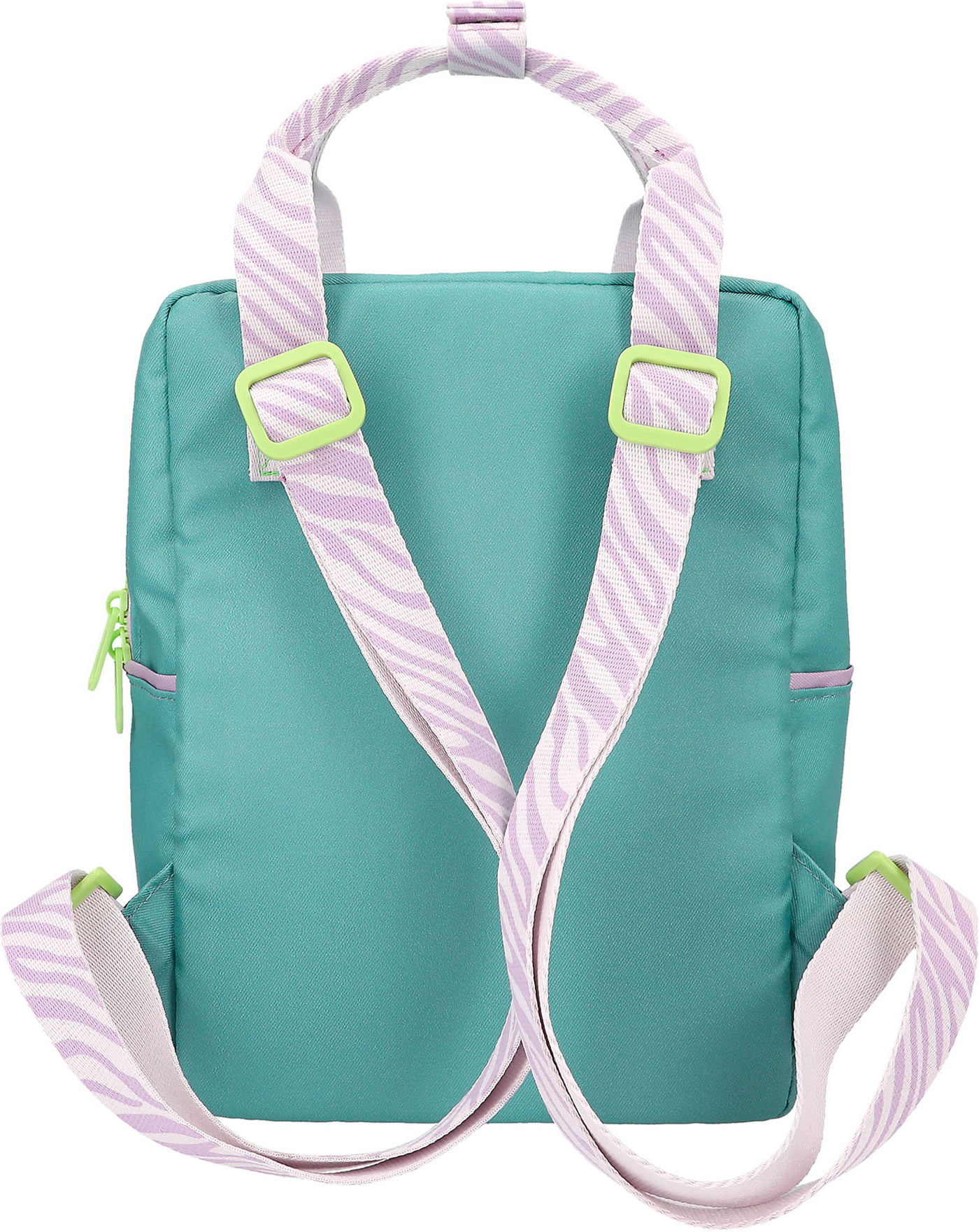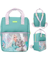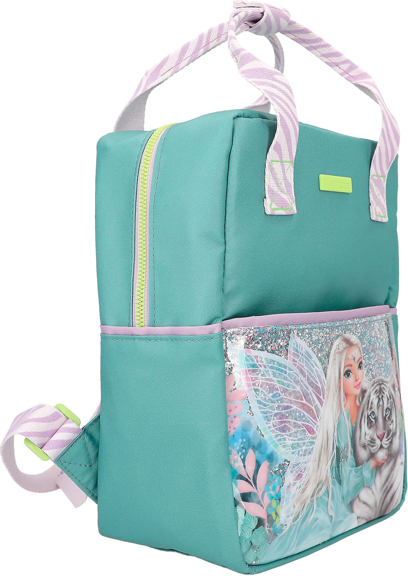 The small backpack in great petrol and lavender tones and with lime-green details has a super glittering front pocket with a cool TOPModel tiger motif. The shoulder straps printed with tiger stripes are adjustable in length, the carrying straps can be connected with a snap fastener. Inside the backpack has a practical carabiner for securely attaching keys.