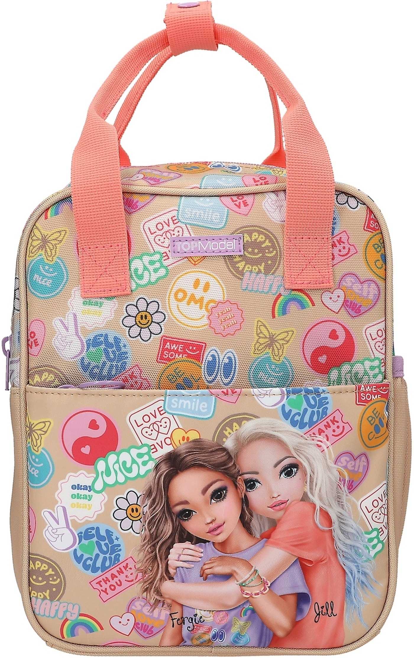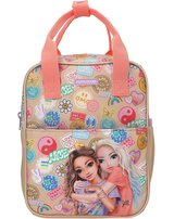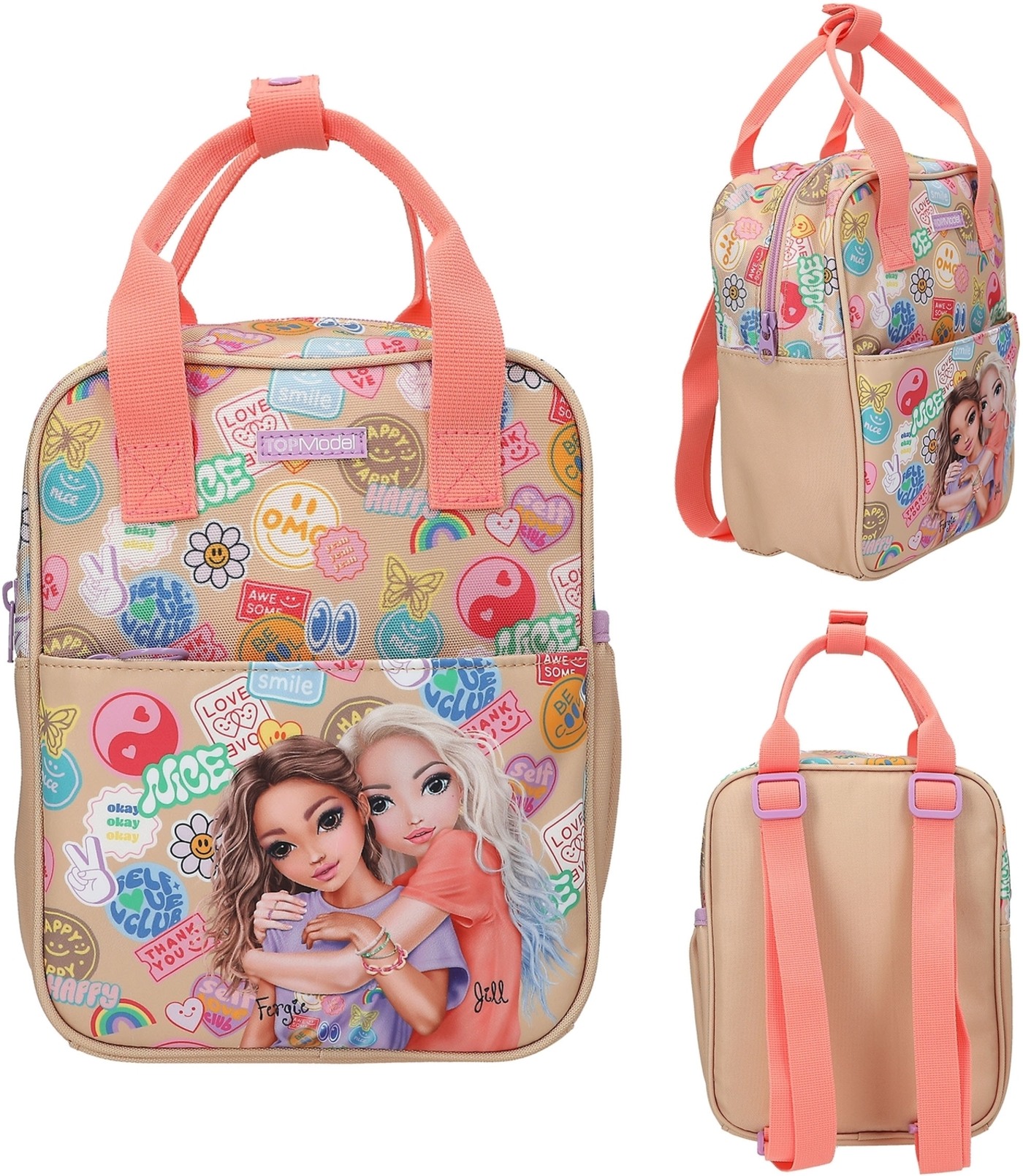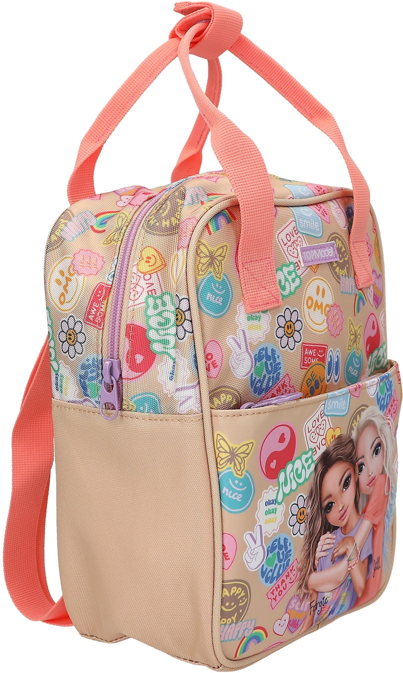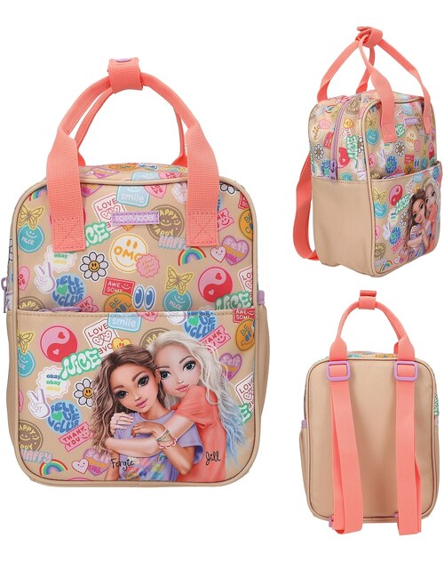 Batch Boom! This small TOPModel backpack in a gorgeous beige and coral colorway features a gorgeous double model motif on the flat front pocket and colorful Batch prints all around.