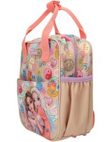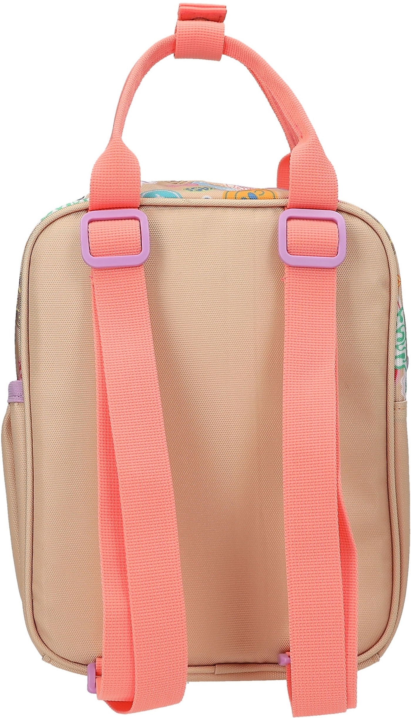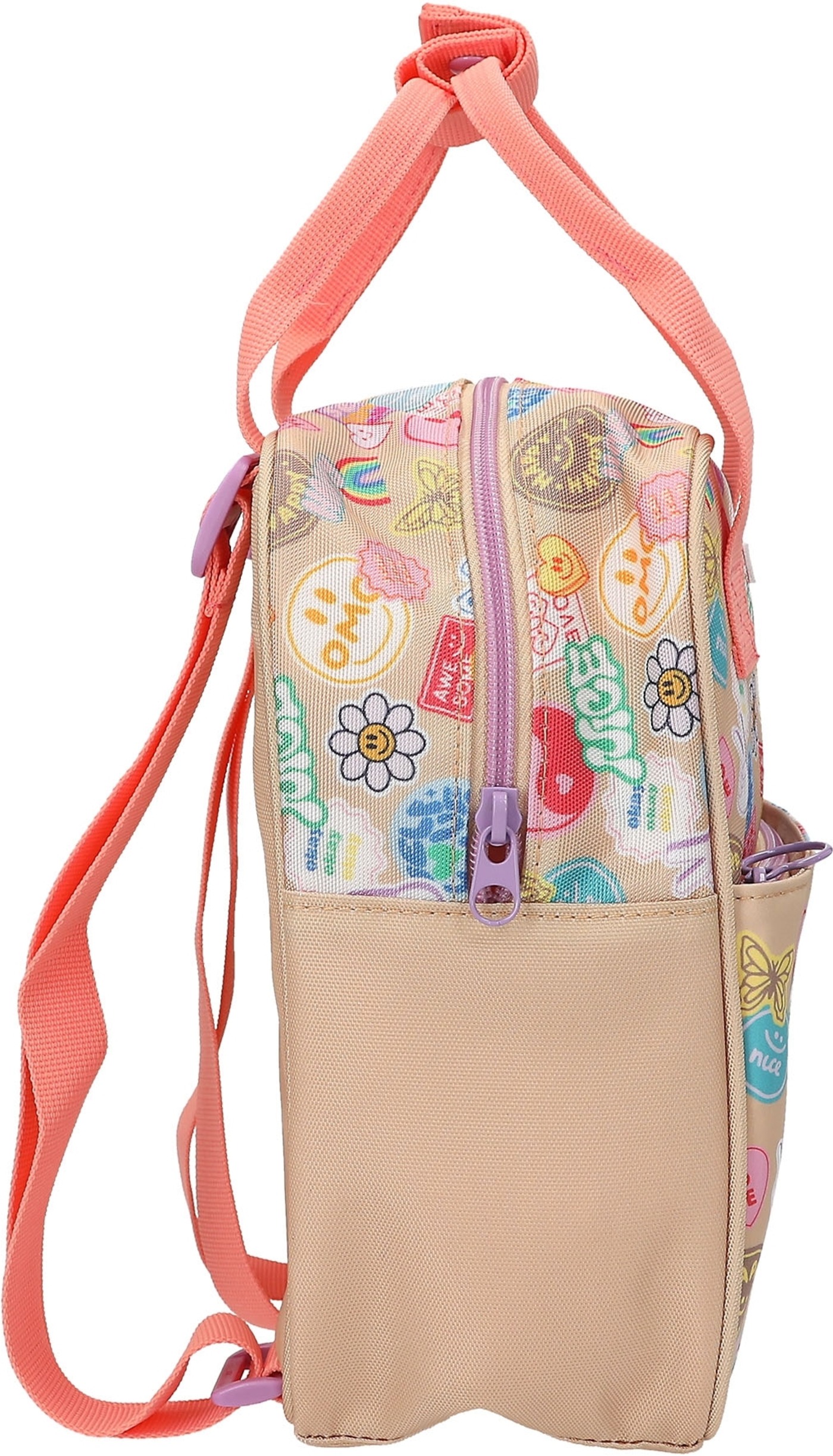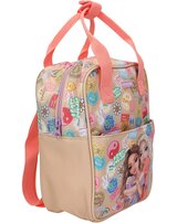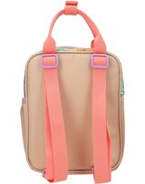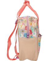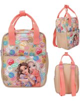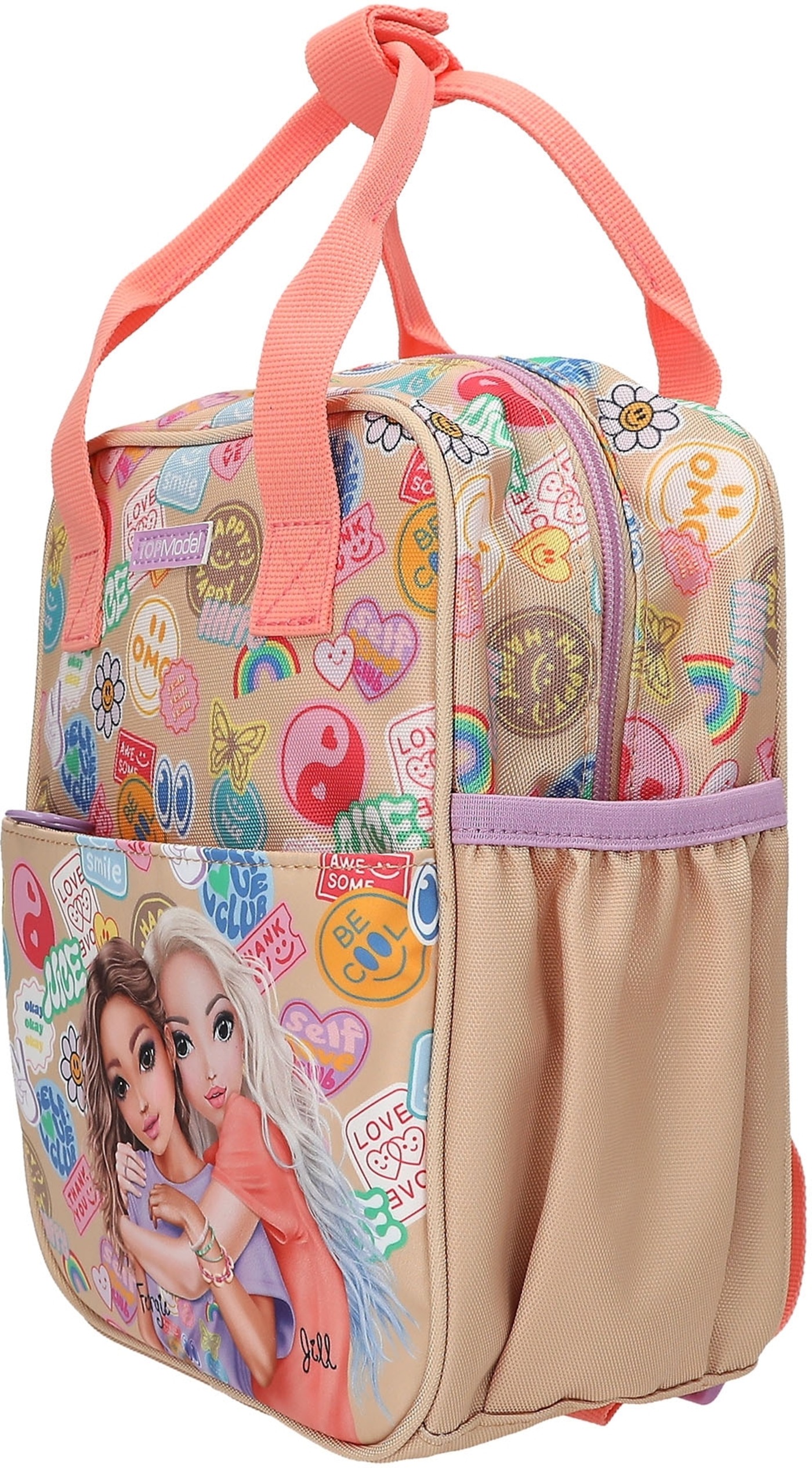 Batch Boom! This small TOPModel backpack in a gorgeous beige and coral colorway features a gorgeous double model motif on the flat front pocket and colorful Batch prints all around.